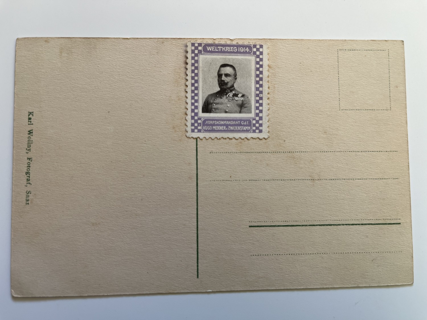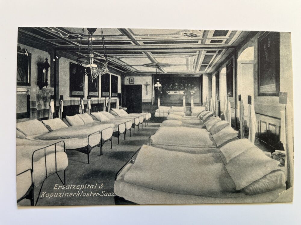 (hhl 121) MF, pohlednice čistá. Náhradní nemocnice 3. Kapucínský klášter – Žatec. Známka – Světová válka 1914. Velitel sboru Gi Hugo Meixner Zweienstamm.
