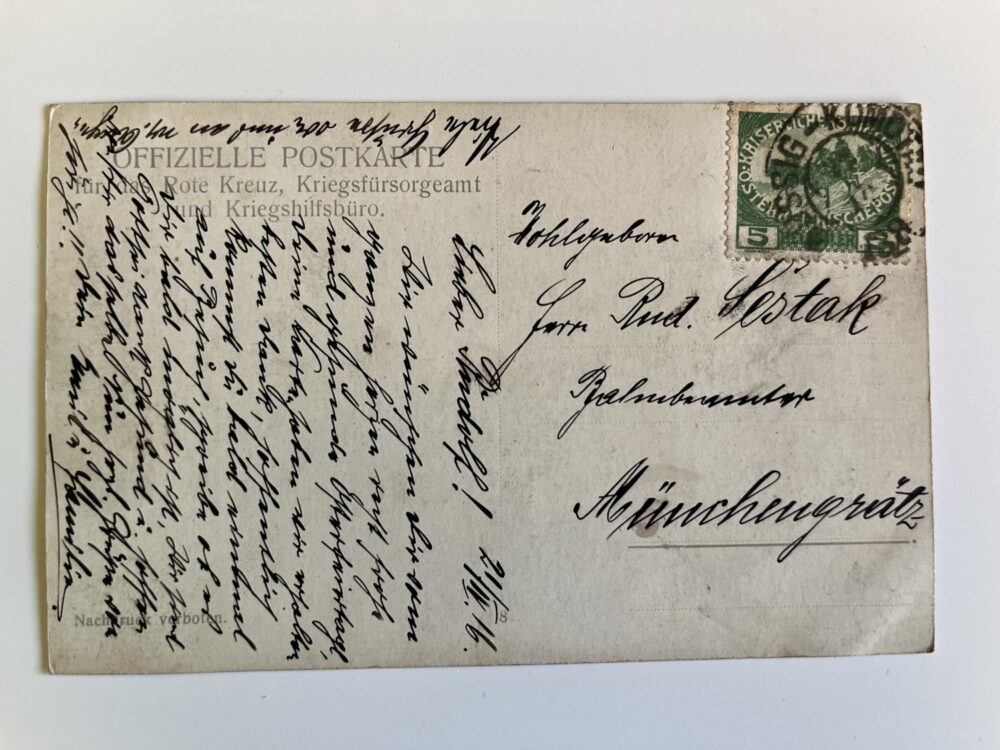 (hhl 69) MF prošlá poštou, 1916 Oficiální pohlednice pro Červený kříž. Vojáci, děla, výstroj, výzbroj…