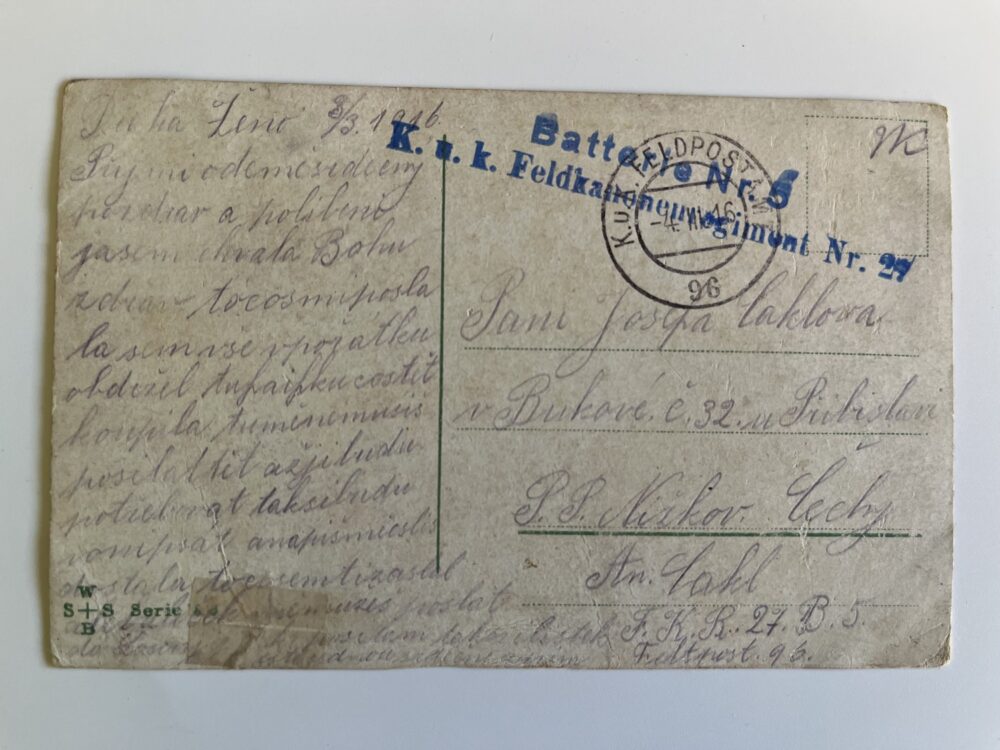 (hhl 23) MF Pohlednice prošlá. Adresát v Bukové u Přibyslavi, p. Nížkov (okres Žďár nad Sázavou), r.1916 Razítko Baterie č.5 pluku polních děl č.27