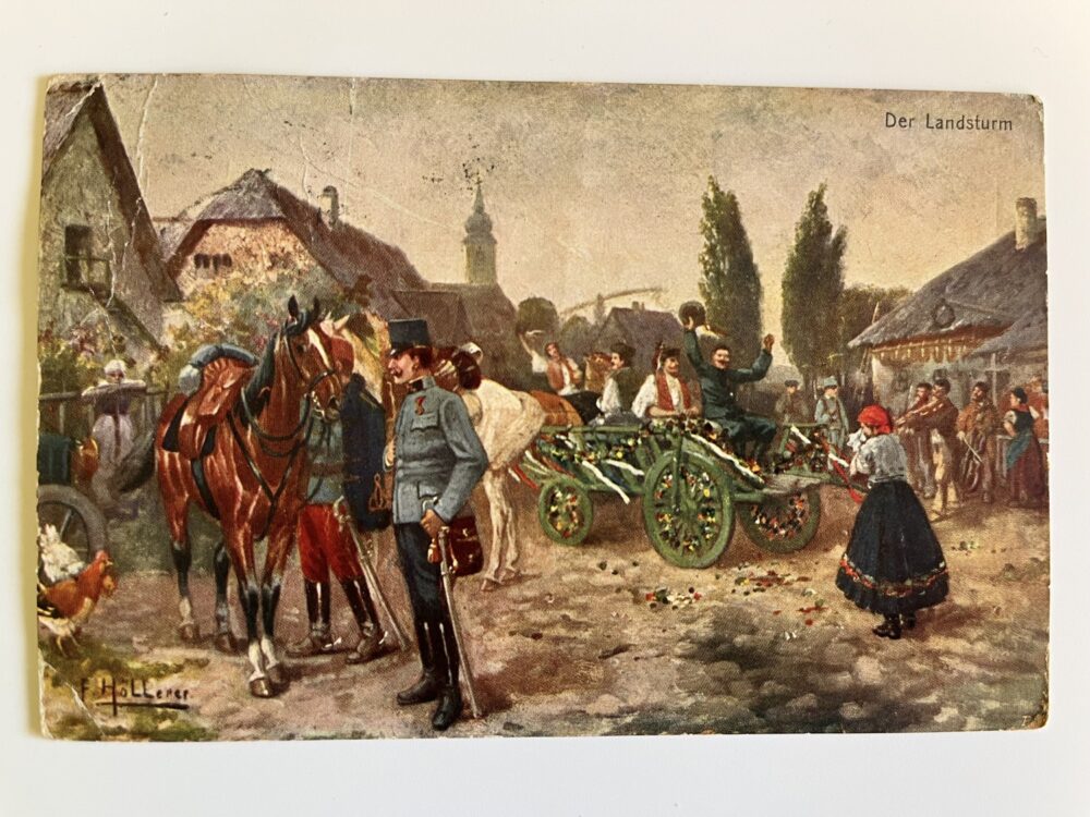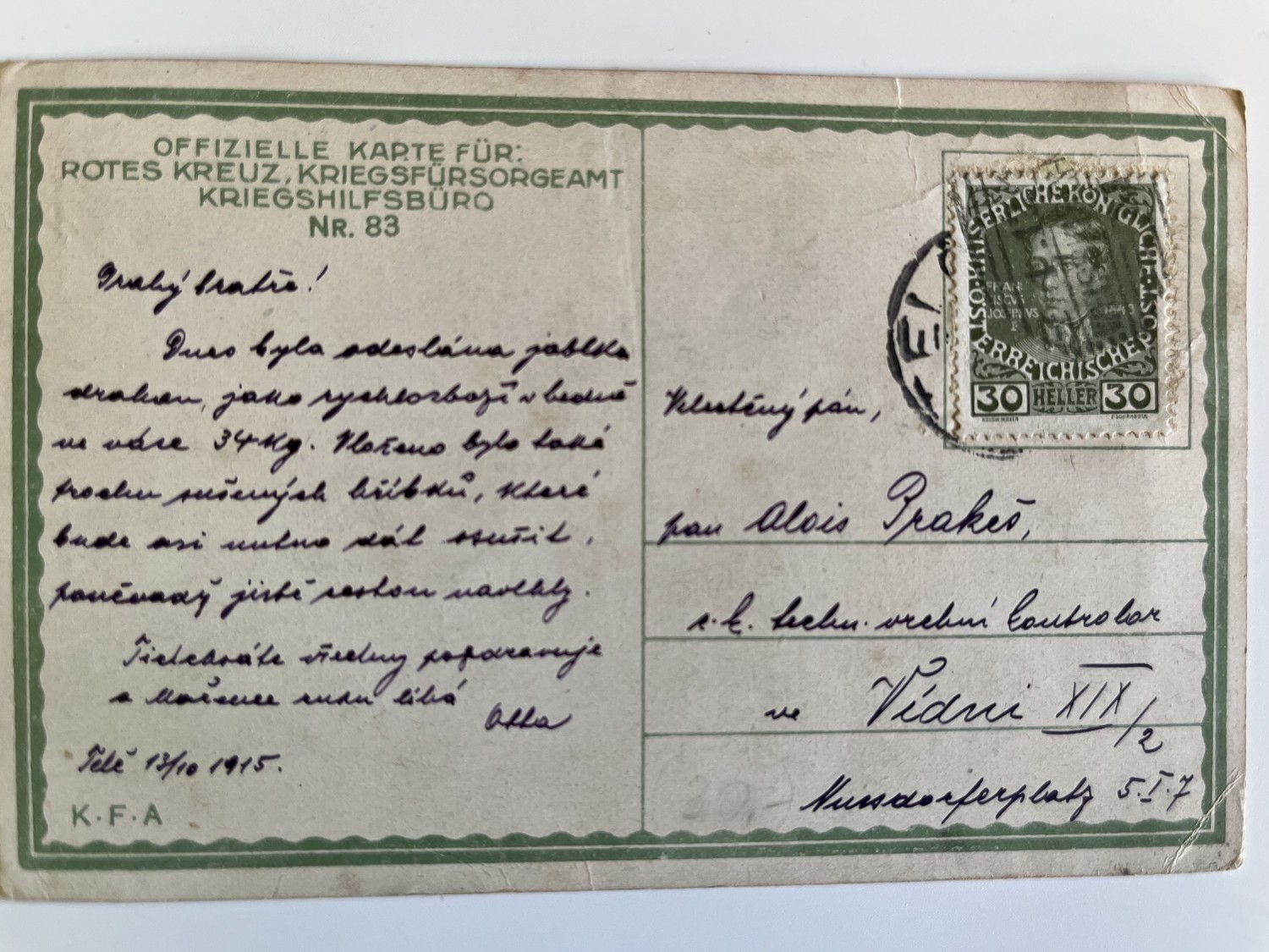 (hhl 9) MF pohlednice prošlá poštou. Oficiální pohlednice pro Červený kříž. Adresát c.k. techn. vrchní kontrolor ve Vídni. Telč 13.10.1915 Koňský povoz se žebřiňákem, kapela, krojovaní, vojáci, šavle, koně, ženy…