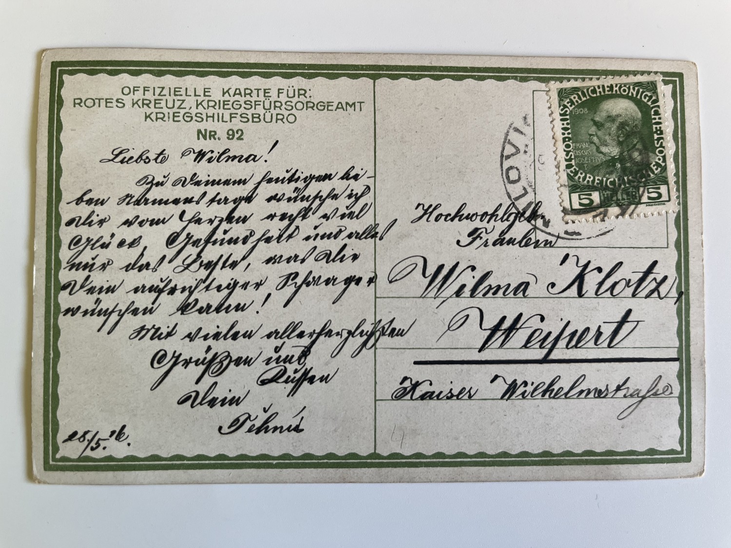 (hhl 18) MF pohlednice prošlá poštou, razítko Milovice. Adresát Vejprty ( Weipert). Oficiální pohlednice pro Červený kříž.