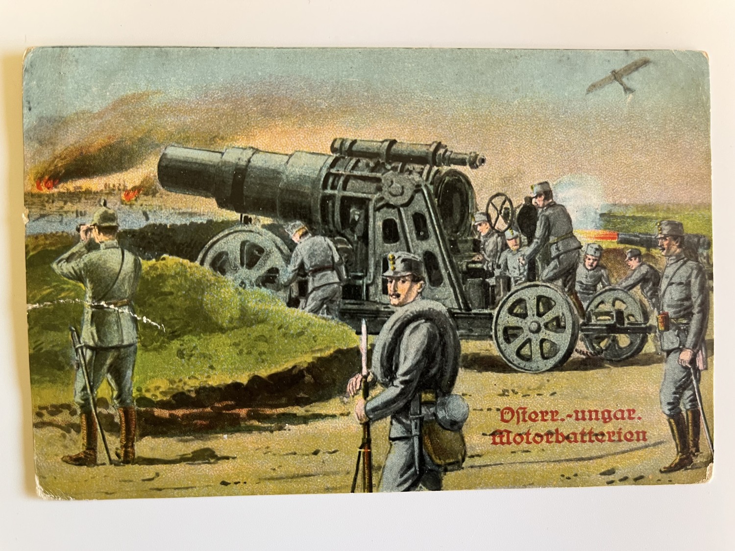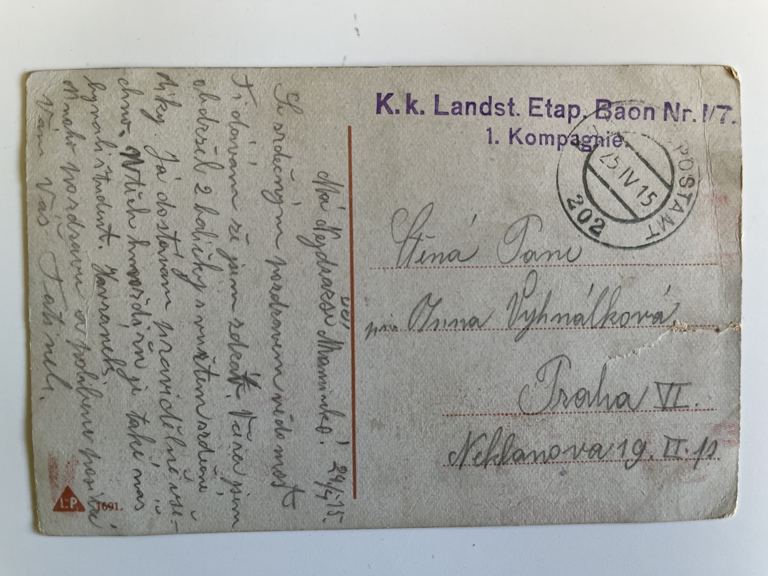 (hhl 49) MF prošlá poštou, 1915. Razítko. Pohled natržen.