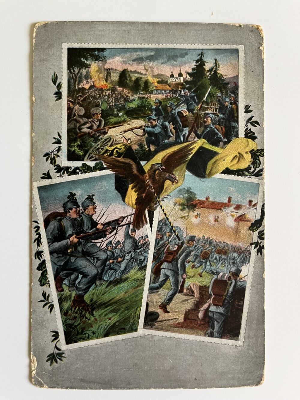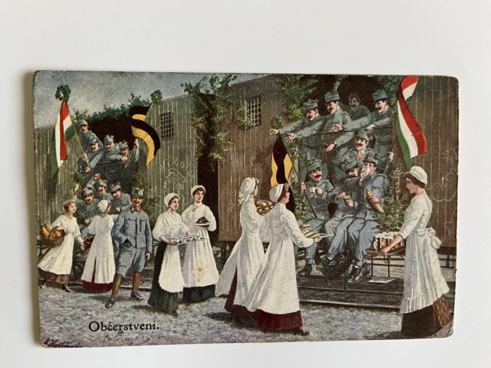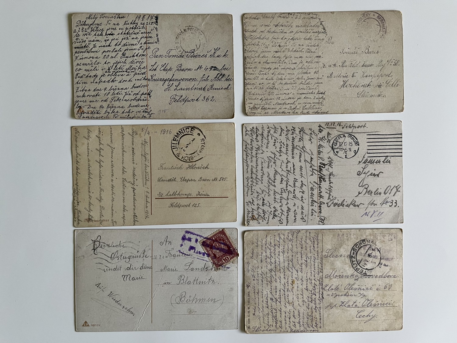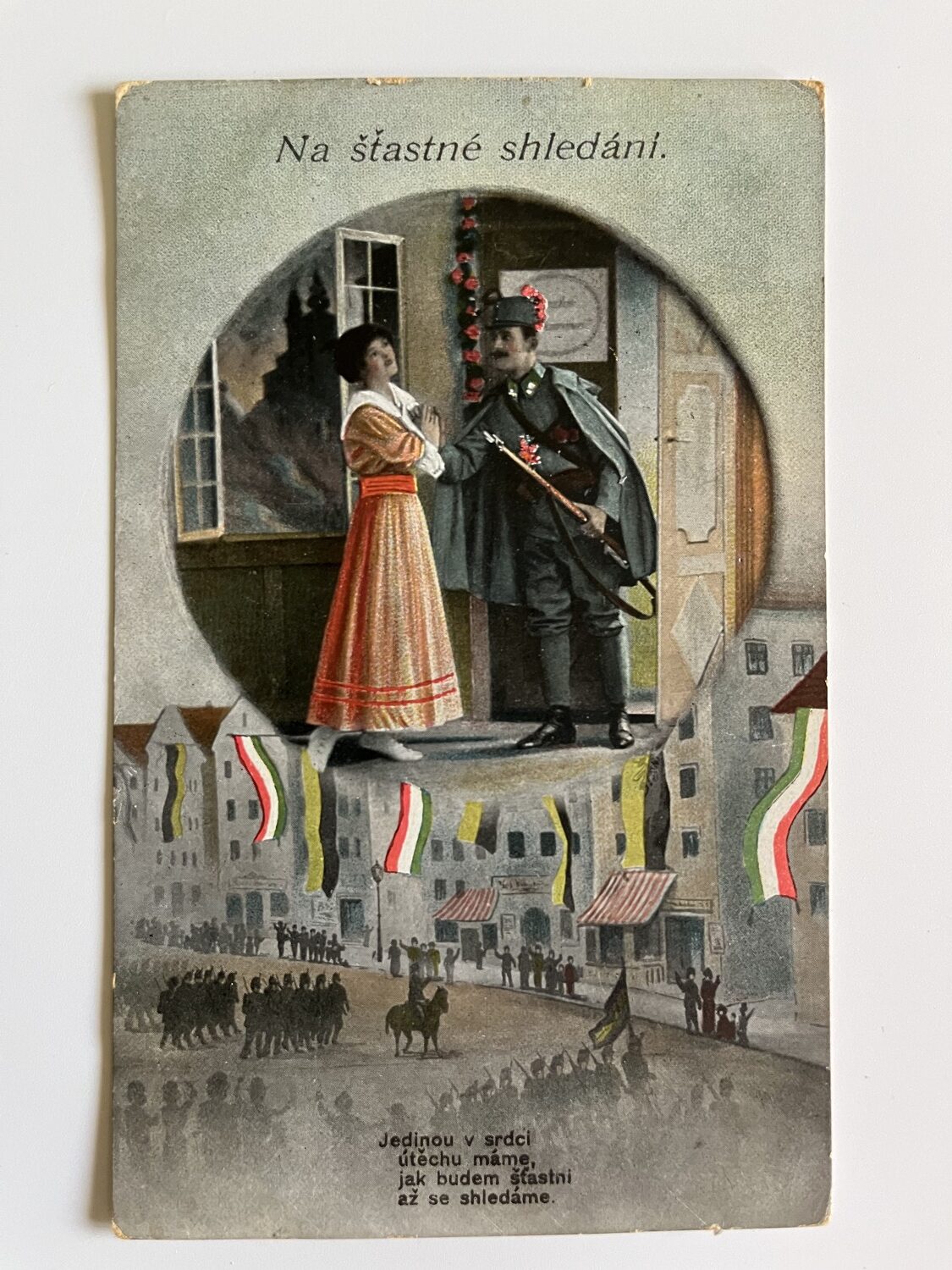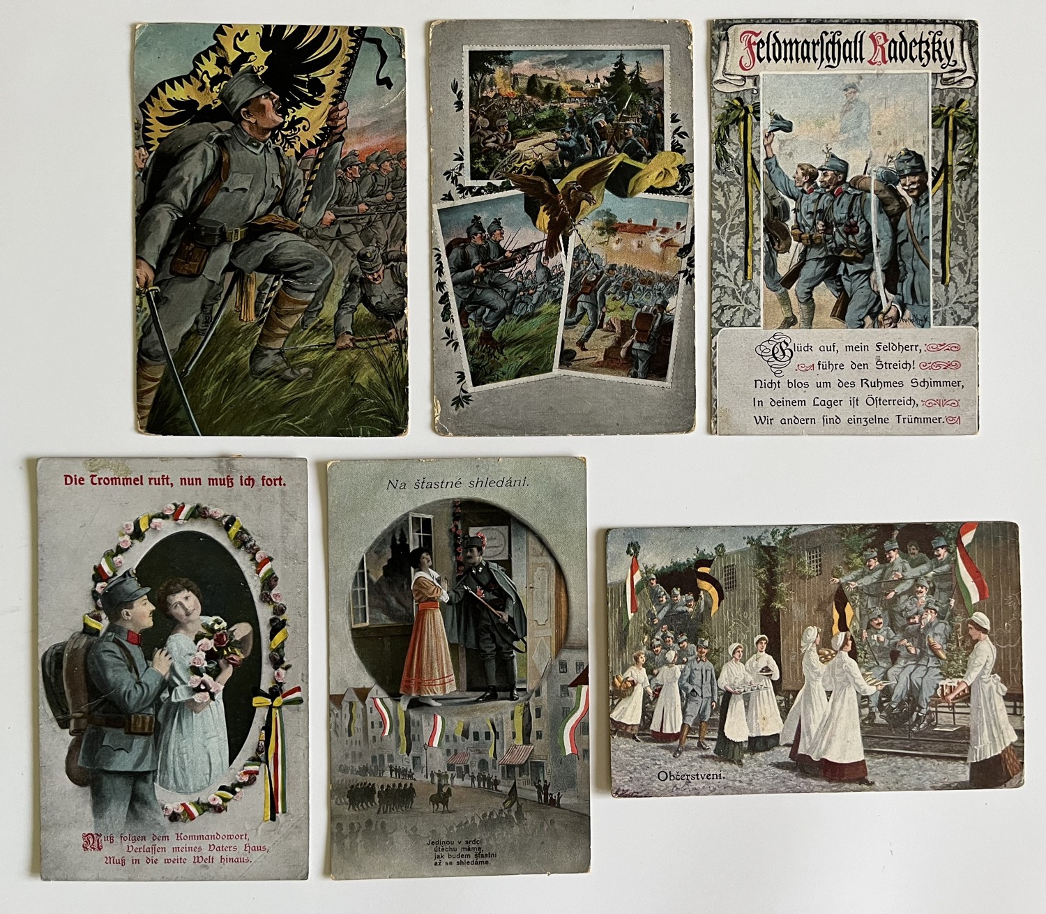 (hhn 23) MF 6x pohlednice prošlá poštou. Např. Adresát Zlatá Olešnice, okres Jablonec nad Nisou. Na šťastné shledání – vojáci s dívkami, vítězství – občerstvení, ženy vítají vojáky. Polní maršál Radecký. Výstroj, sumky, zbraně, šavle, pušky, koláže…