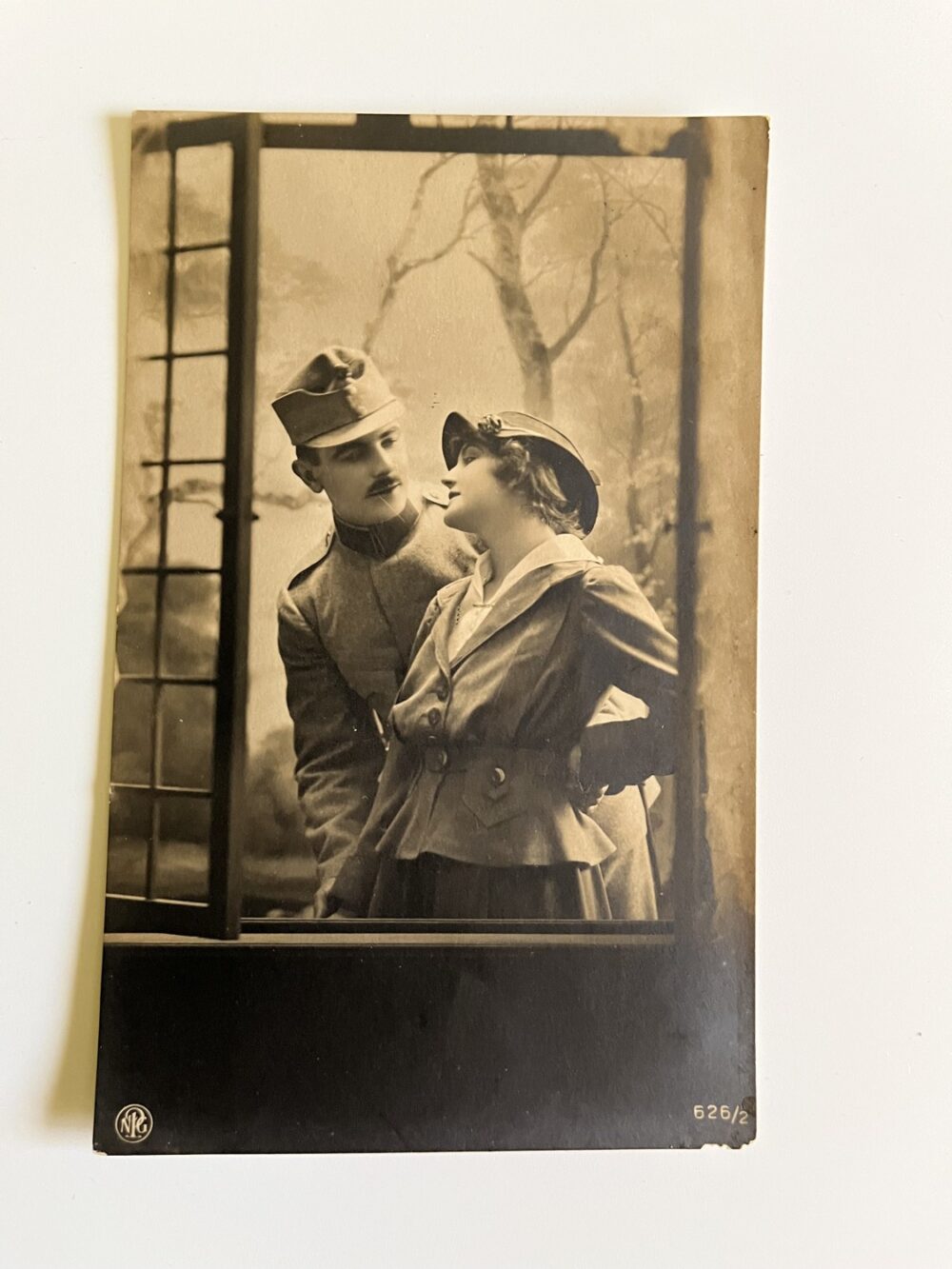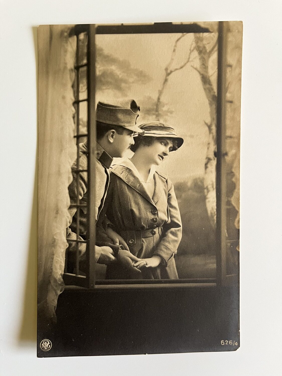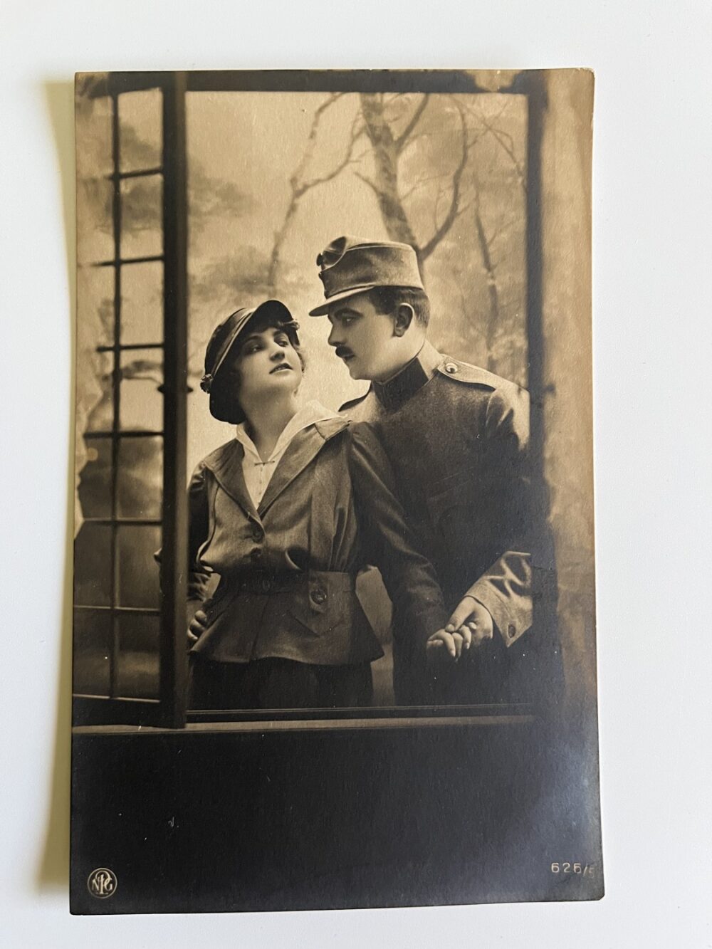 (hhn 7) MF 1x pohlednice prošlá poštou, 4x pohlednice čistá. Adresát závod elektrotechnický, České Budějovice. Páry, zamilovaní pár – Voják s dívkou, jedna pohlednice s textem.