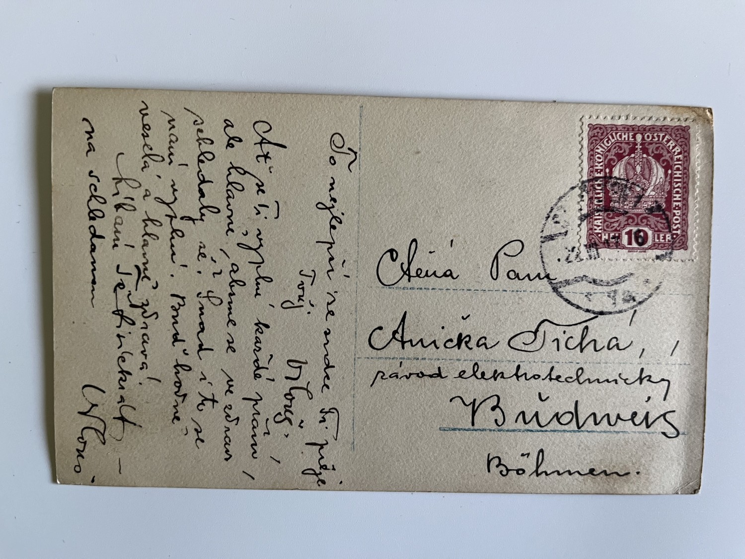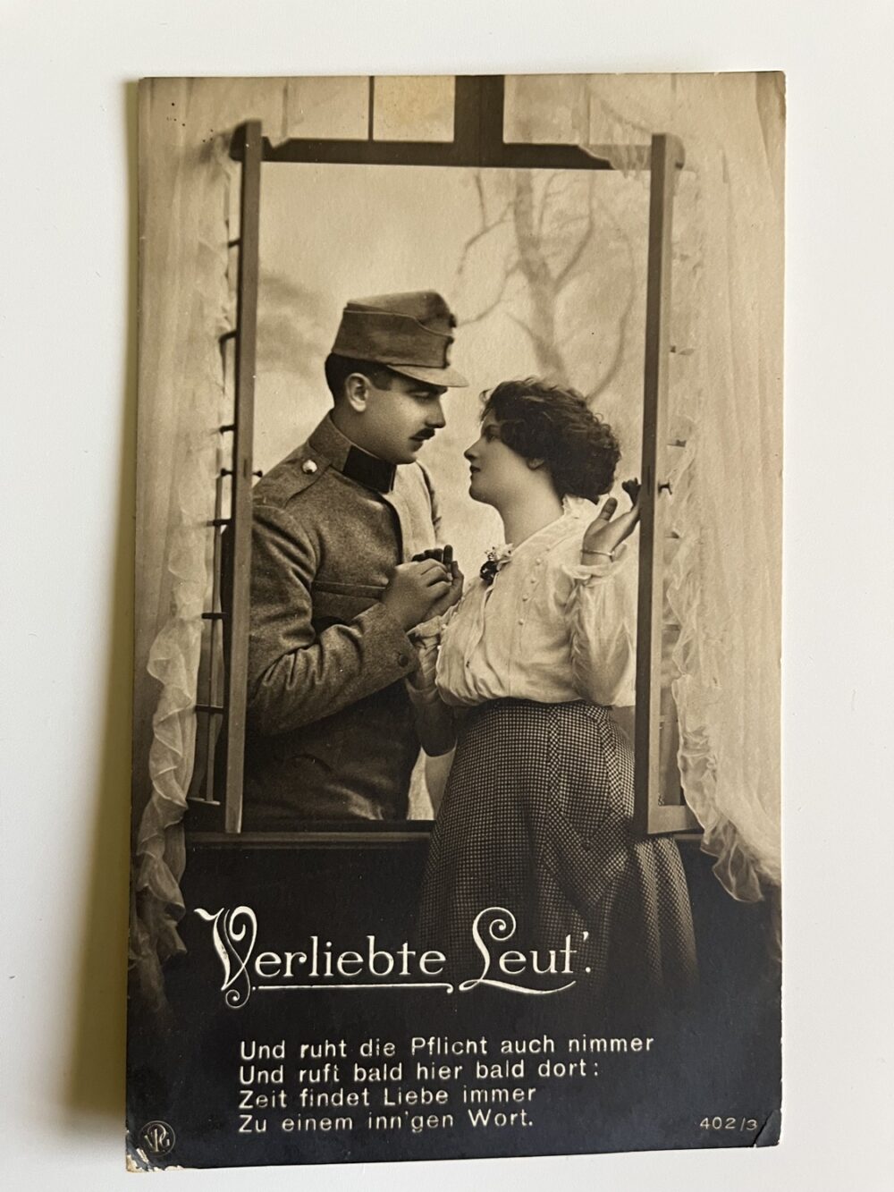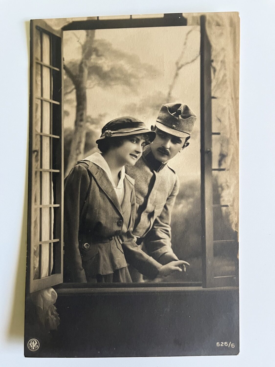 (hhn 7) MF 1x pohlednice prošlá poštou, 4x pohlednice čistá. Adresát závod elektrotechnický, České Budějovice. Páry, zamilovaní pár – Voják s dívkou, jedna pohlednice s textem.