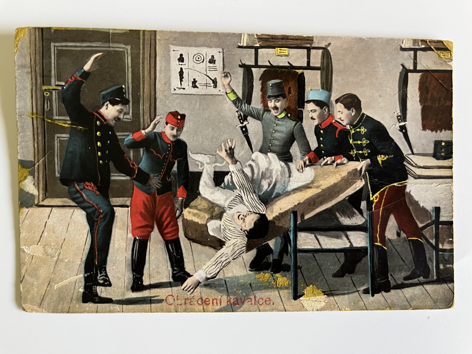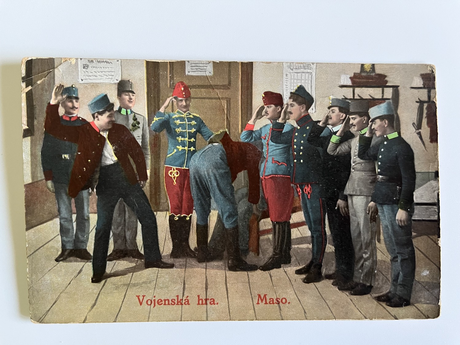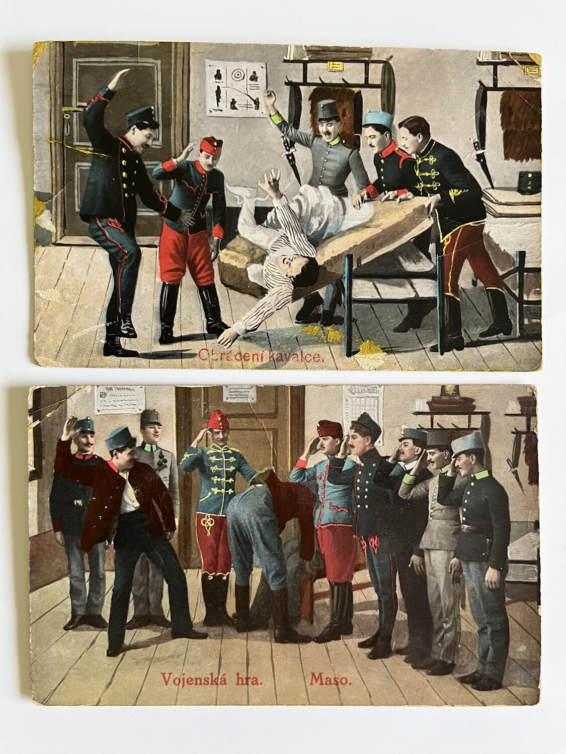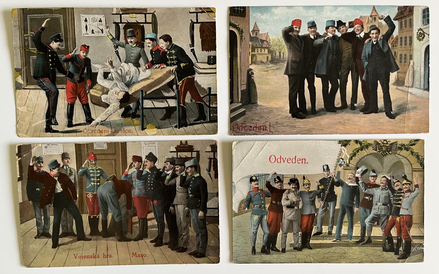 (hhn 22) MF 3x pohlednice prošlé, 1x pohlednice čistá. Odveden. Rekruti. Vojenská hra – Maso. V kasárnách – obrácení kavalce.