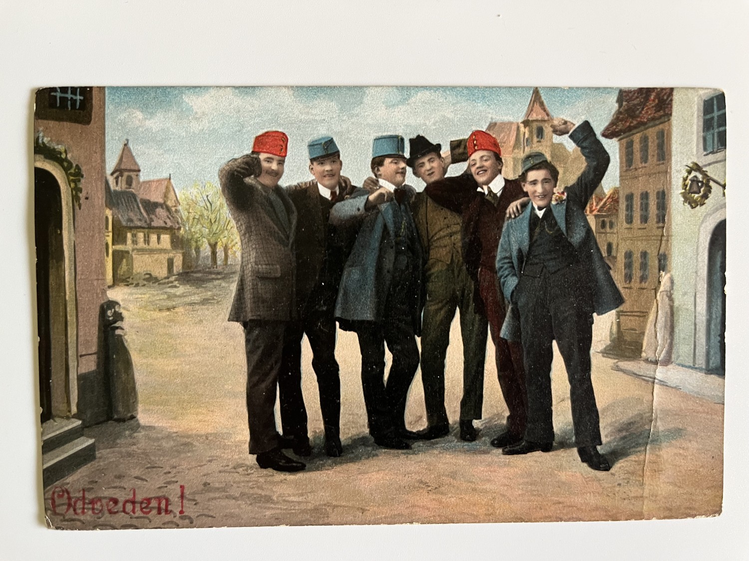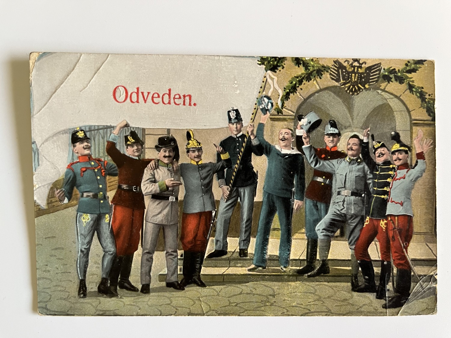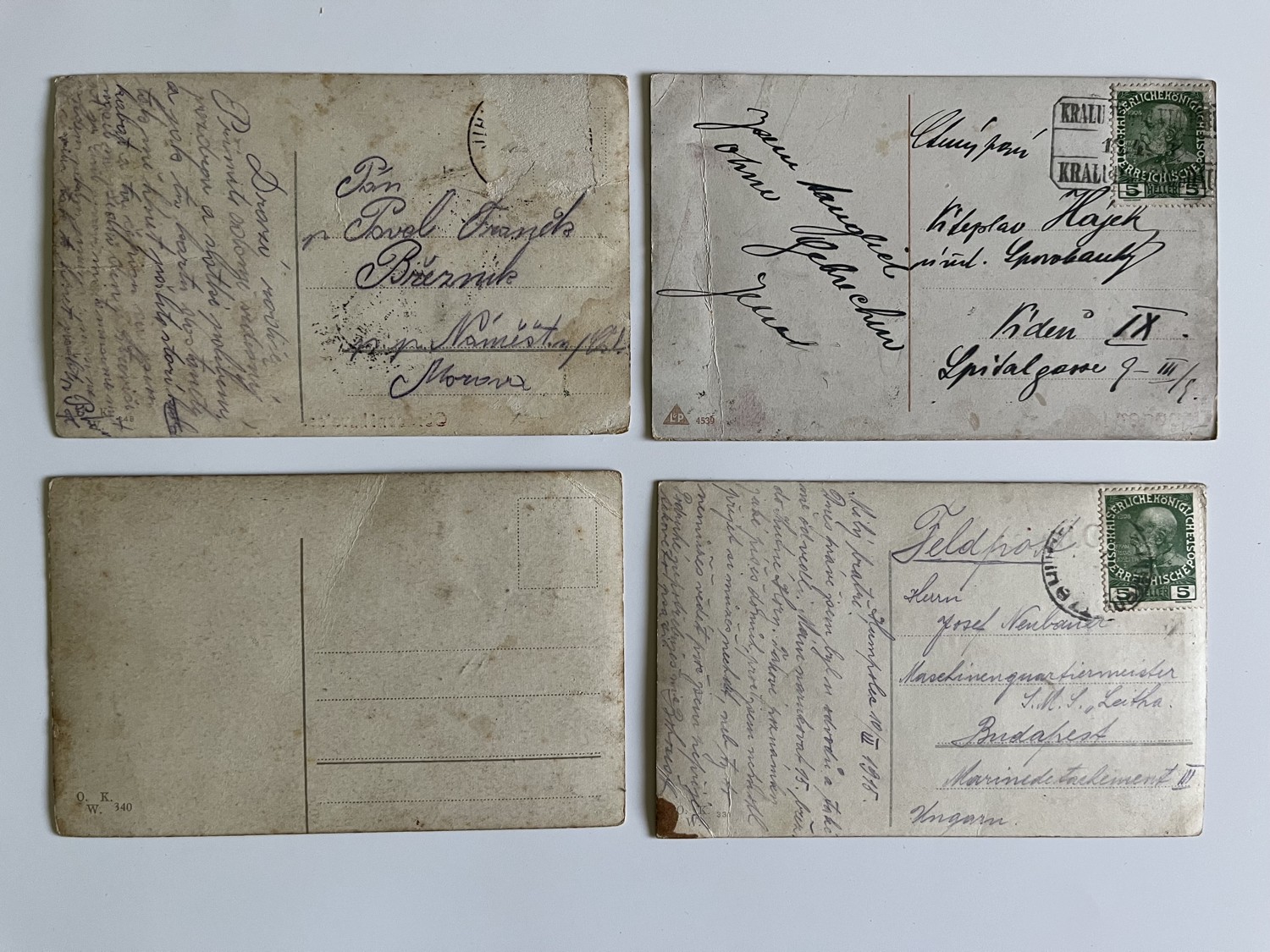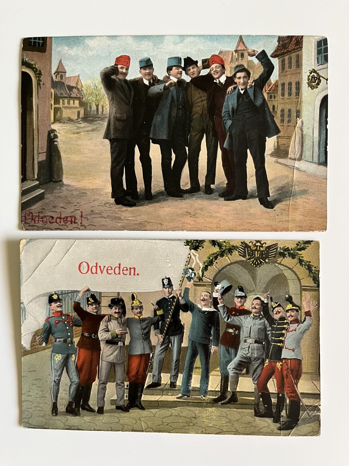 (hhn 22) MF 3x pohlednice prošlé, 1x pohlednice čistá. Odveden. Rekruti. Vojenská hra – Maso. V kasárnách – obrácení kavalce.
