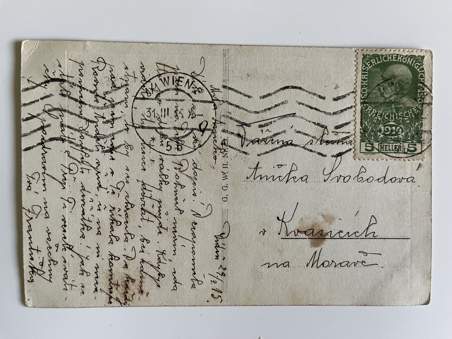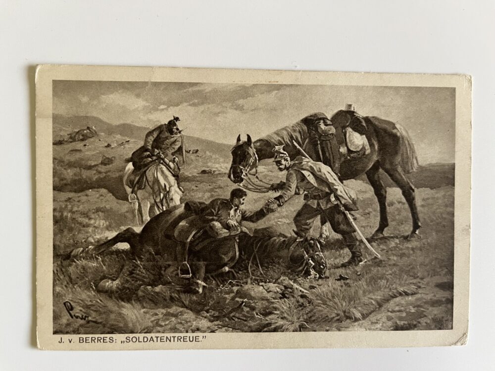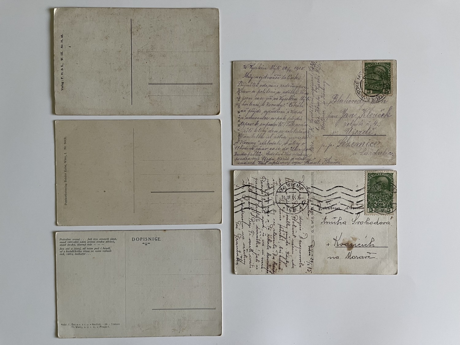 (hhn 17) MF 3x neprošlá, 2x prošlá. Adresát Kvasice, okres Kroměříž, 1915. Adresát Újezd,Sezemice, okres Pardubice 1915. Vojáci, zbraně, koně, výzbroj, výstroj, zdravotník…
