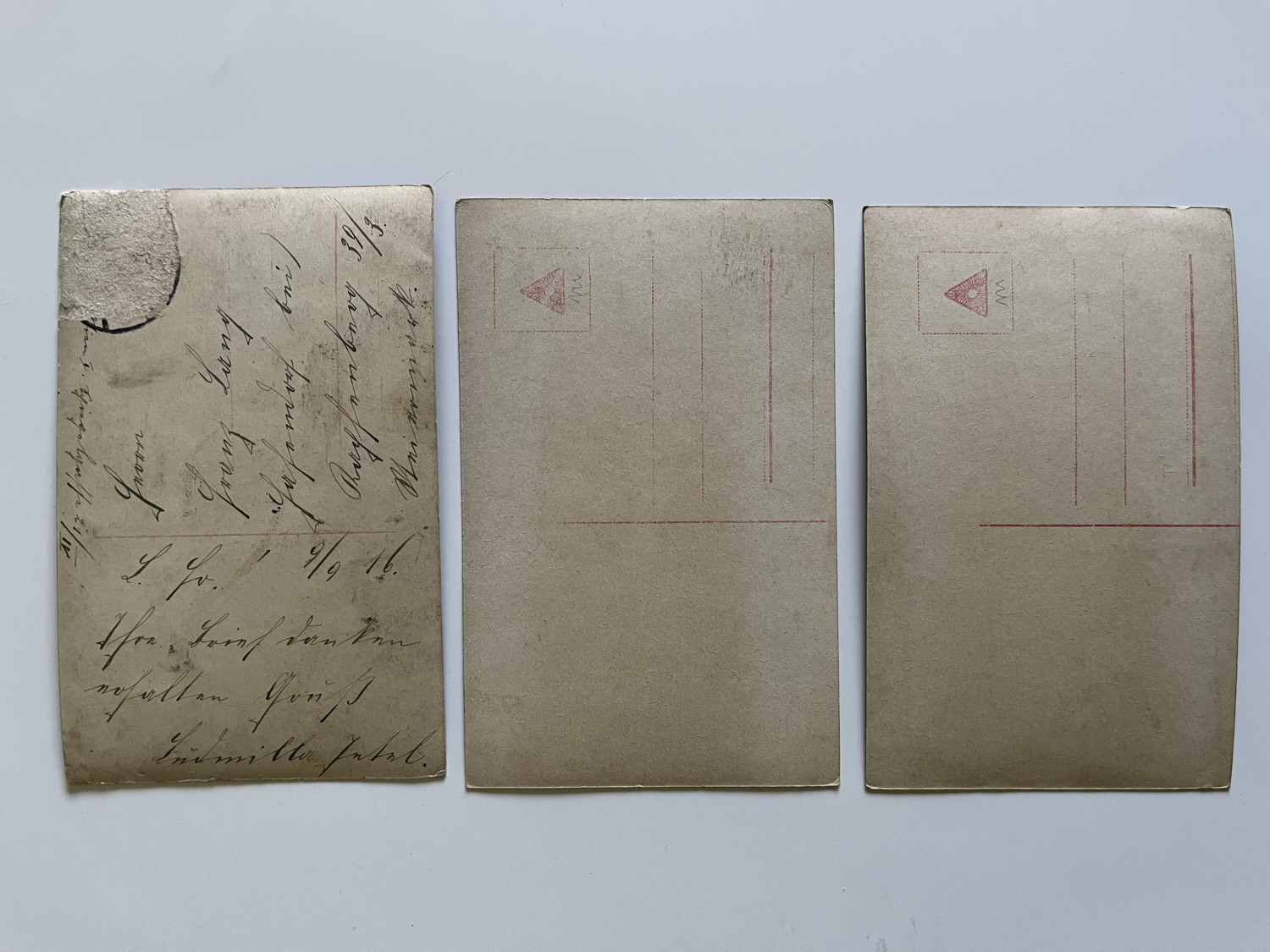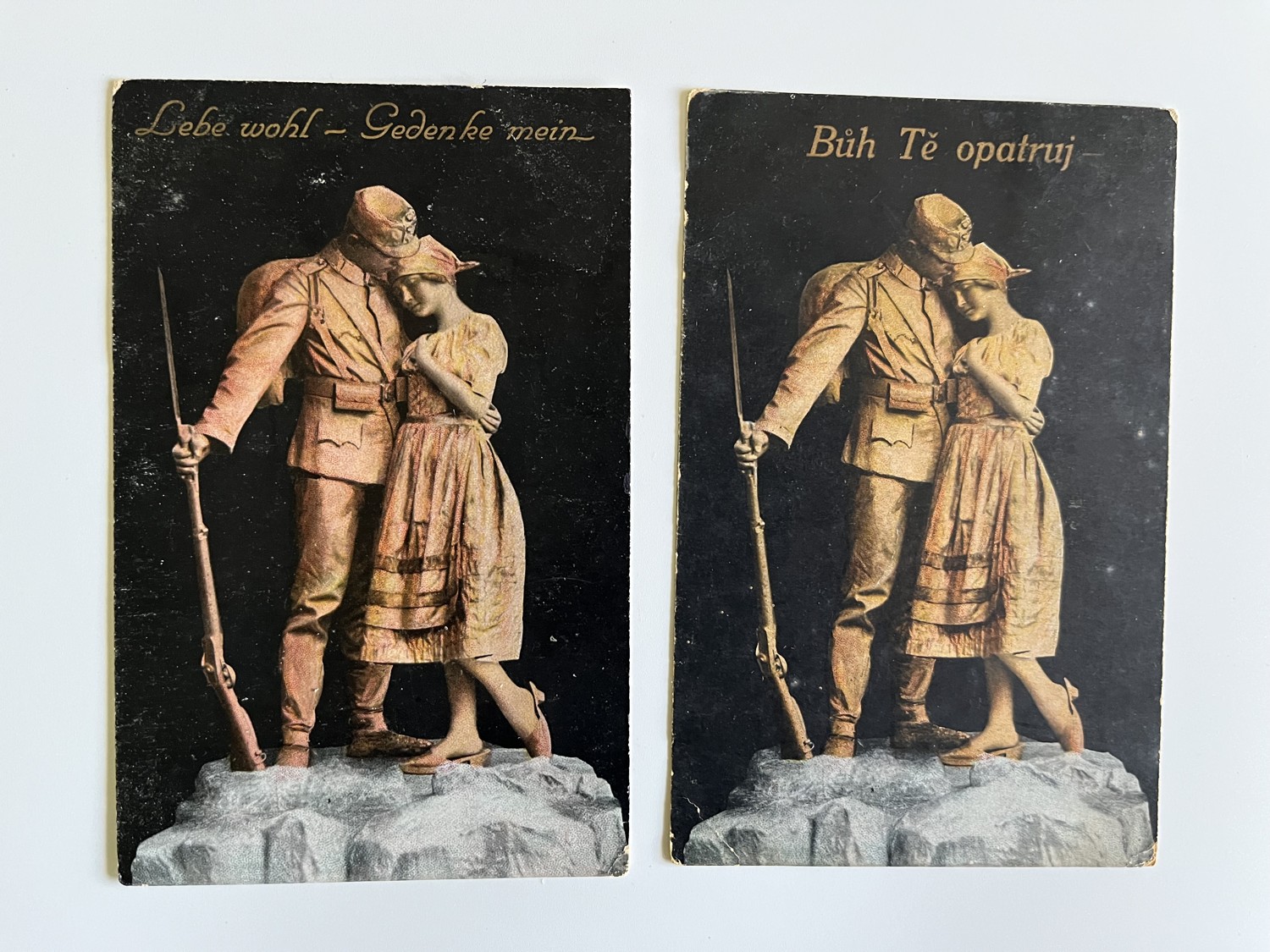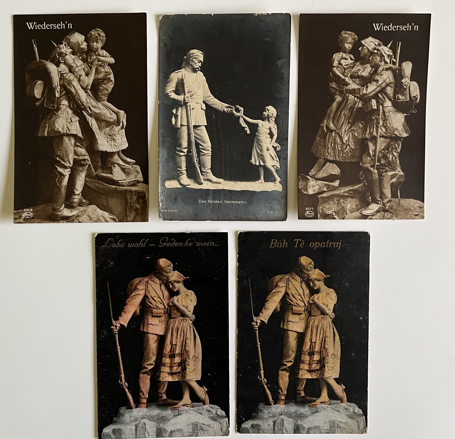 (hhn 3) MF 3 x pohlednice prošlá, 2 x neprošlá. 1 x pohlednice prošlá 1916. 1x Adresát Brandýs nad Labem. 1x Adresát – dcera rolníka Předměřice n./L. Hrdinův návrat domů. Sbohem – vzpomeňte si na mě. Bůh Tě opatruj. Brzy se uvidíme. Výstroj,výzbroj, puška, zbraně, dívenka, rodina,dítě.