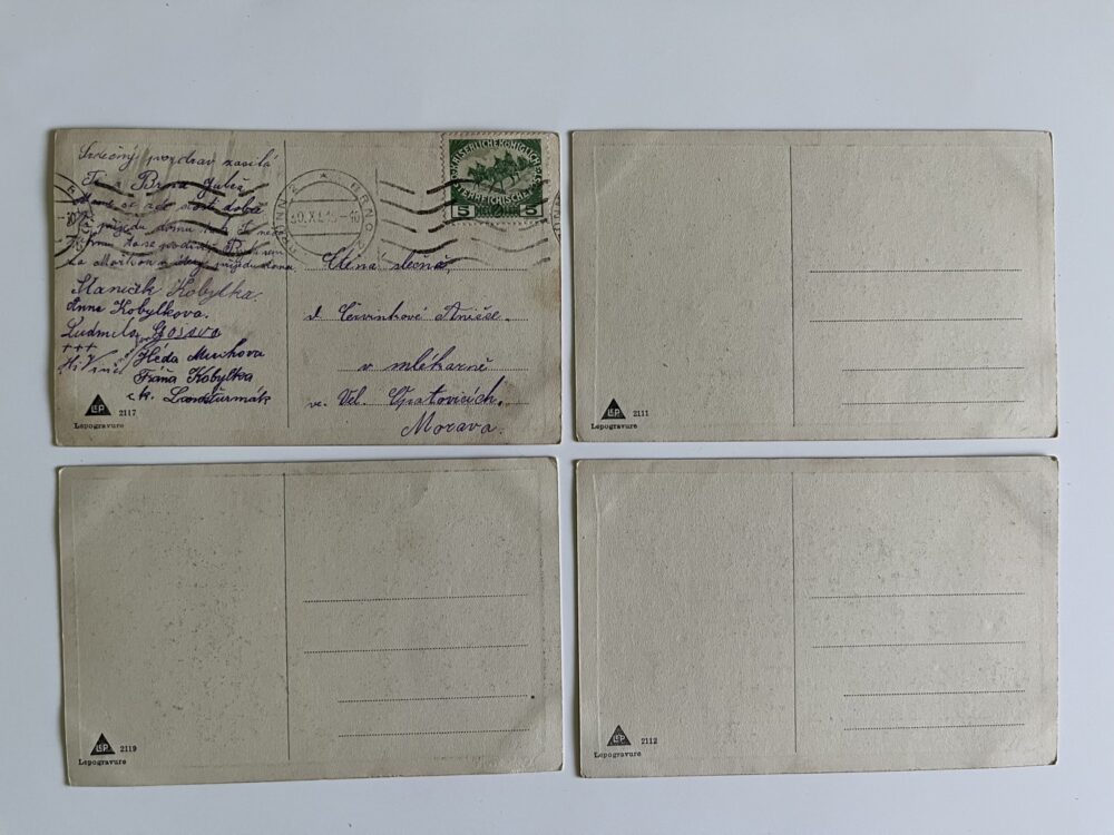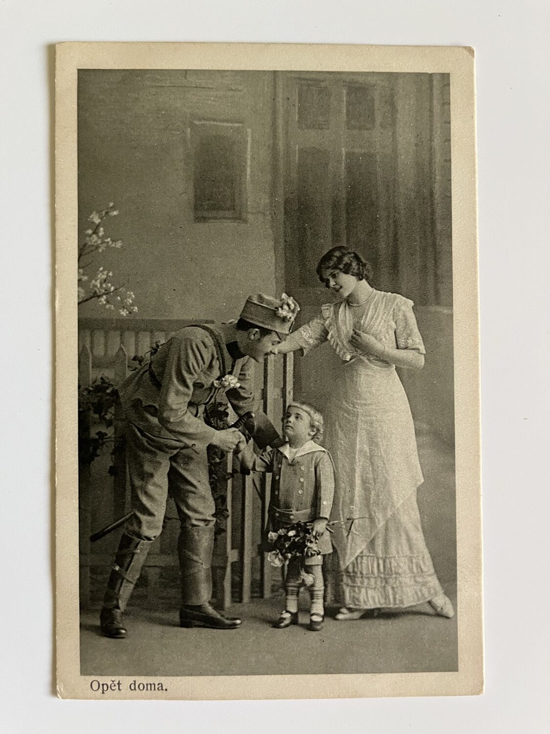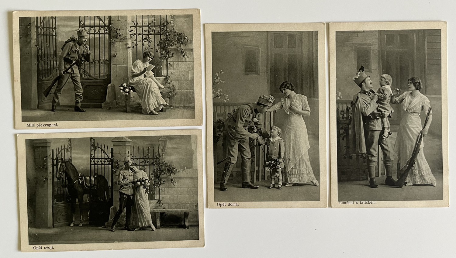 (hhn 14) MF 3x pohlednice čistá, 1x prošlá poštou. Adresát v mlékárně ve Vel. Opatovicích. Milé překvapení. Opět svoji. Loučení s tatíčkem. Opět doma. Voják, zbraň, puška, rodina,děťátko, kůň, žena.