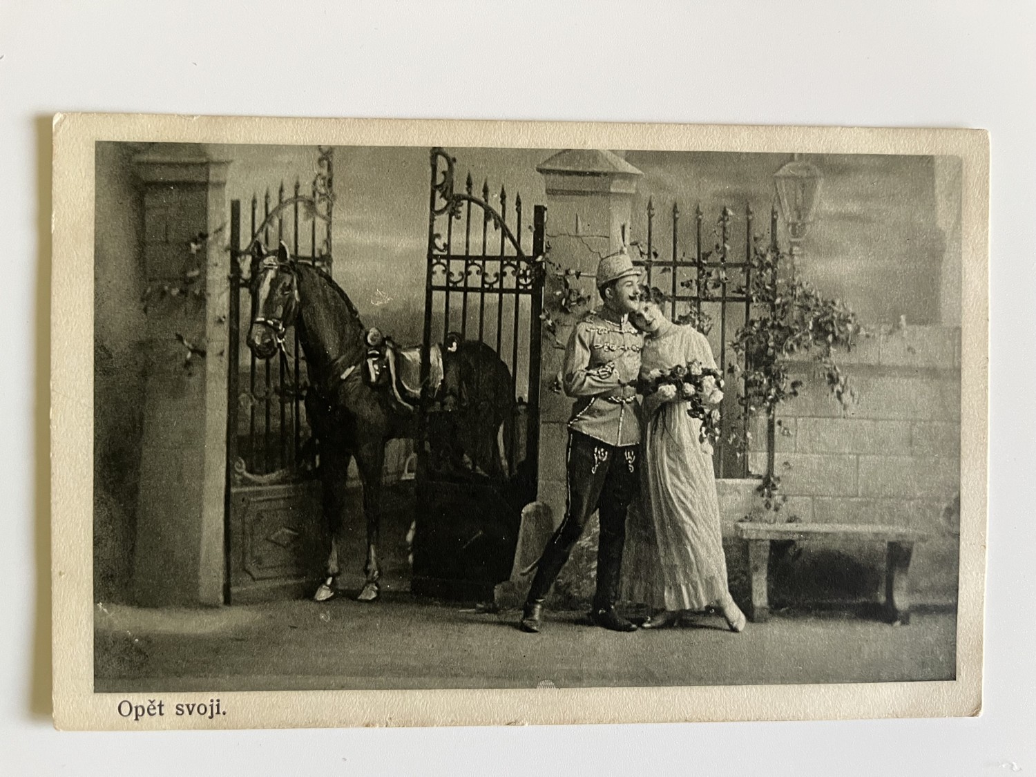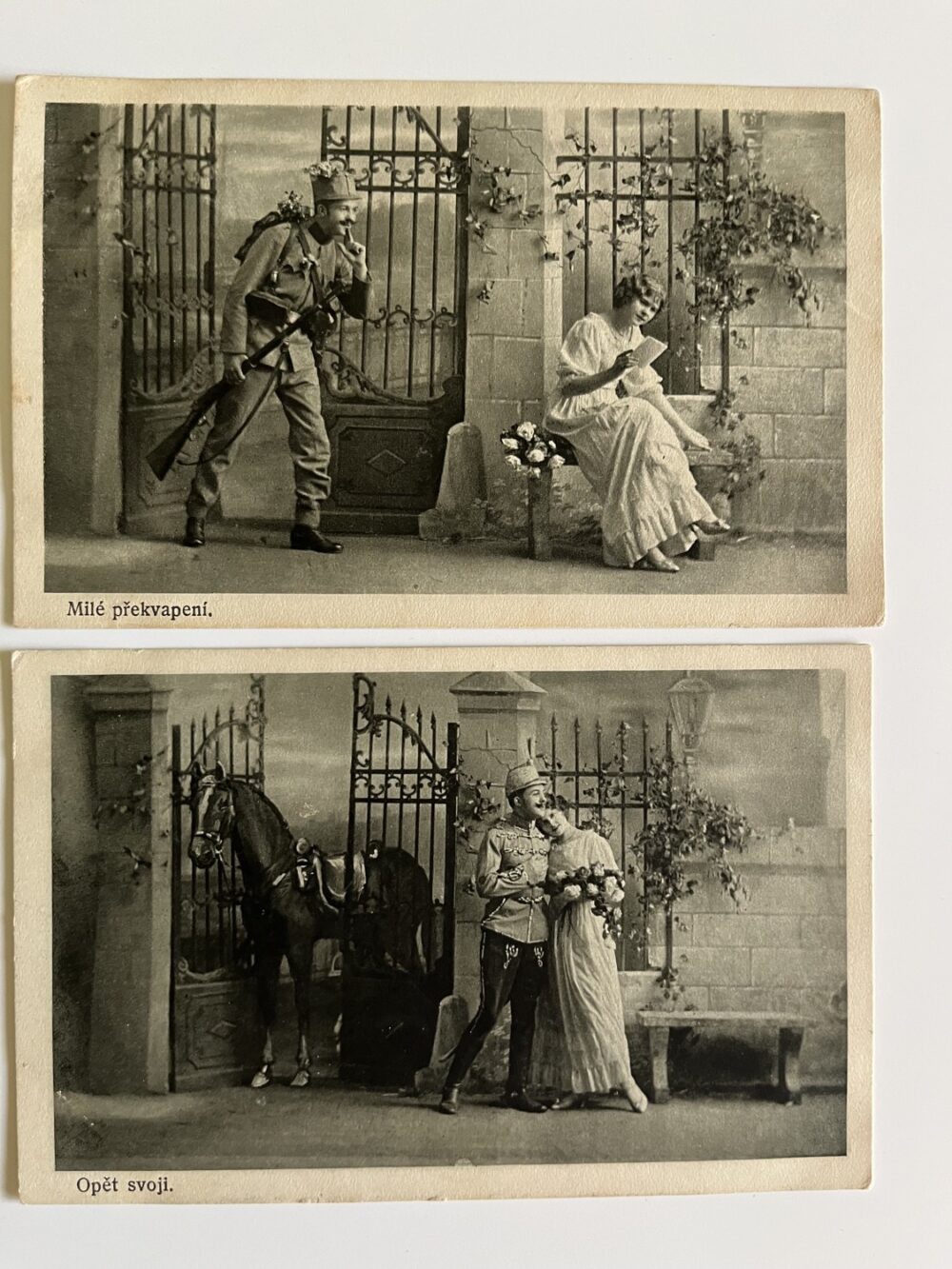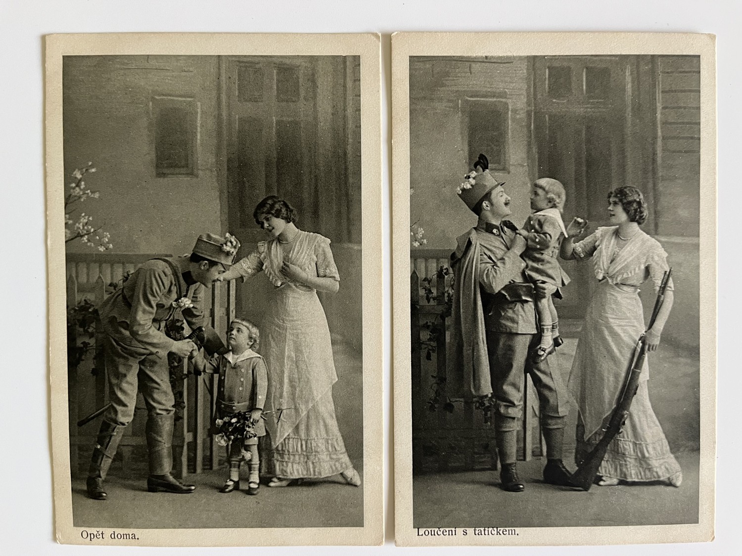 HomeObchodPohledniceVojenská pohlednice RU, WW1 Voják s ženou, rodina, kůň set 4 ks