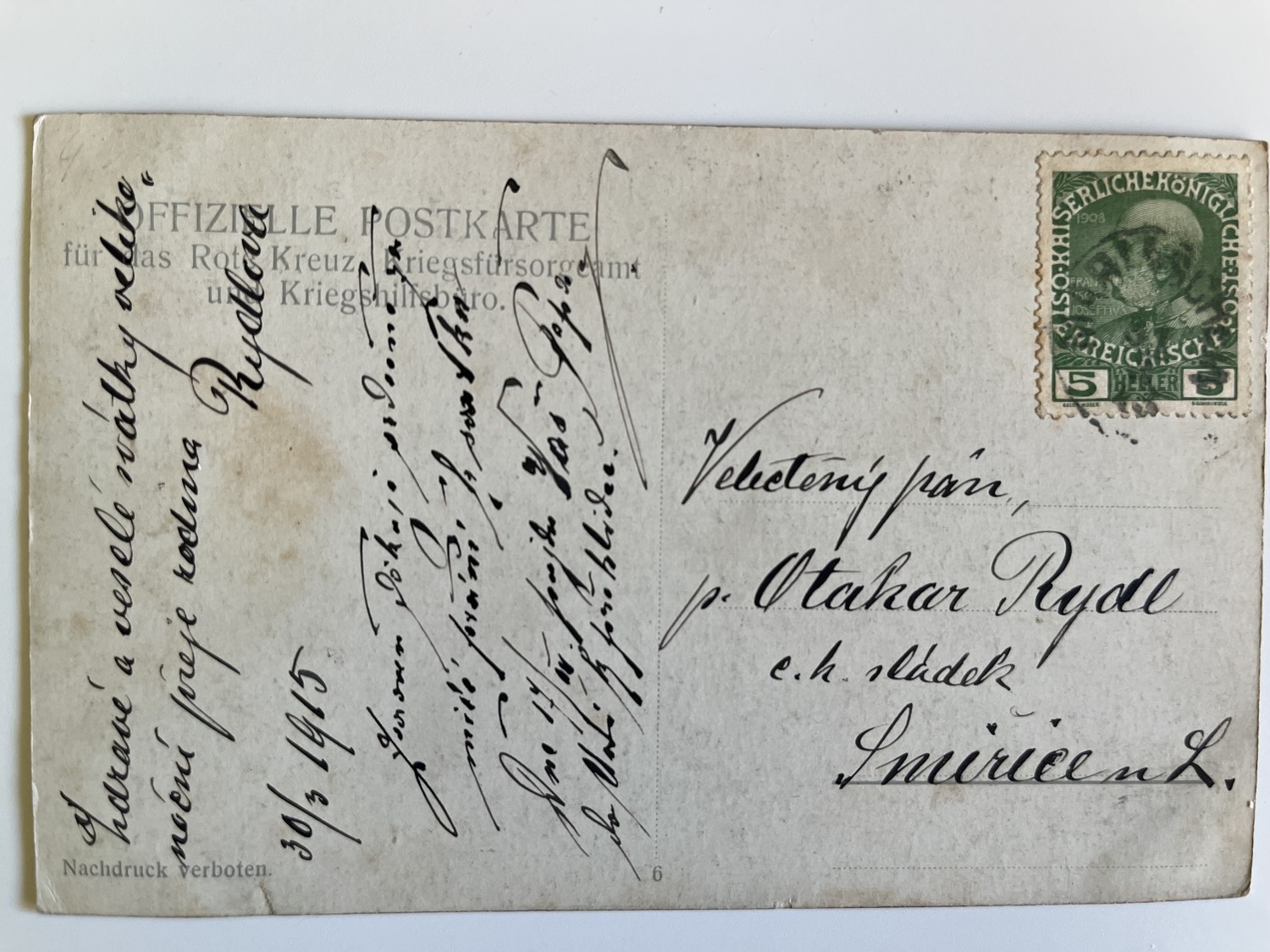 (hhl 2) MF pohlednice prošlá poštou, adresát c.k.sládek, Smiřice nad L., 1915. Oficiální pohlednice pro Červený kříž.