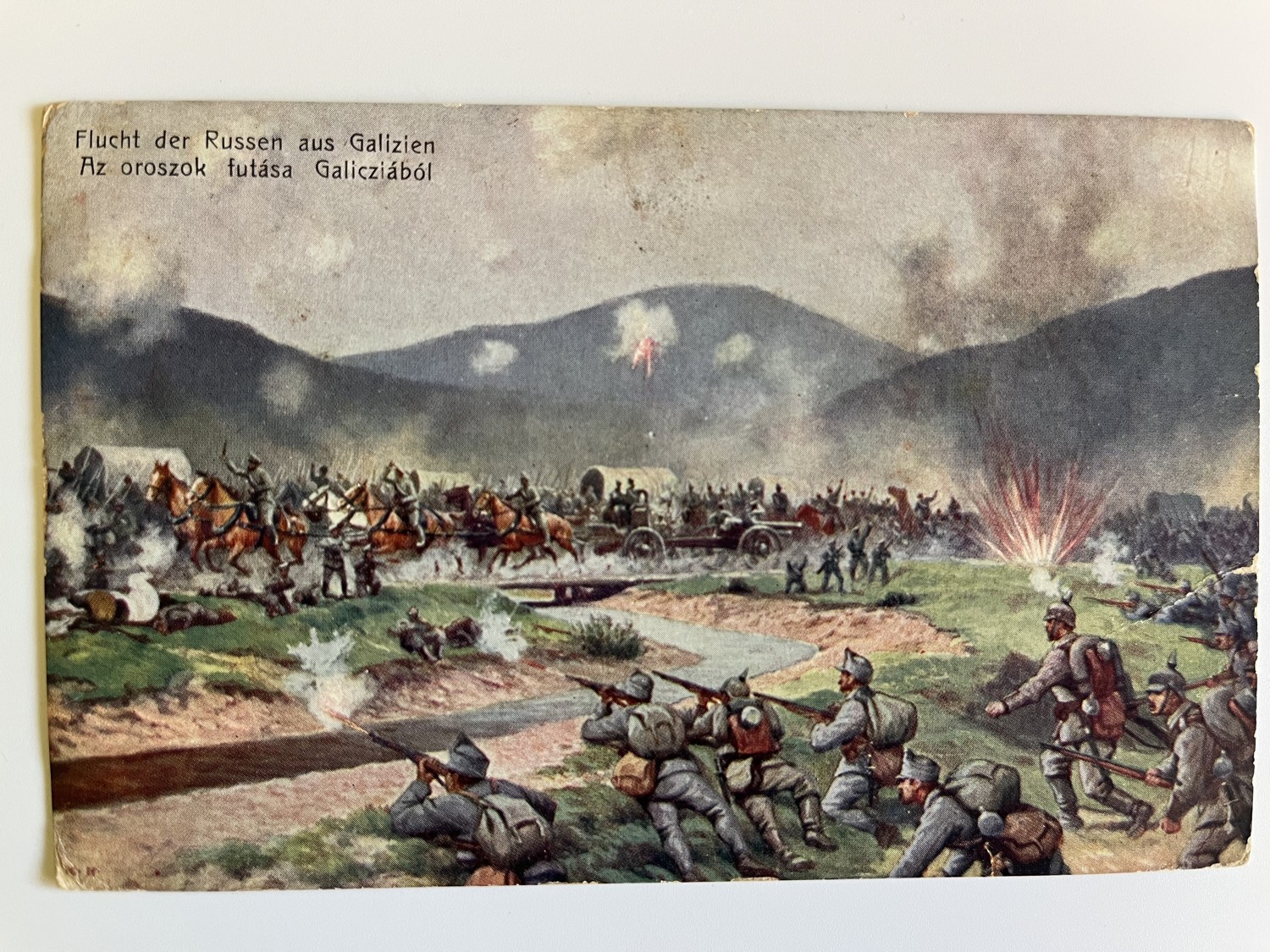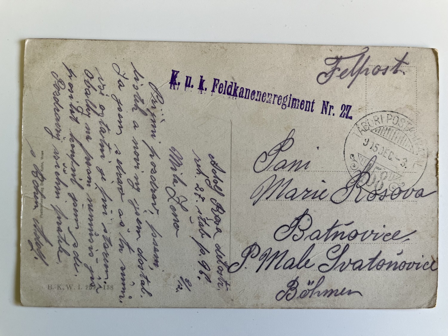 (hhl 29) MF pohlednice prošlá poštou. Adresát Batňovice, p. Malé Svatoňovice (okres Trutnov). Razítko K. u. k. Polní dělostřelecký pluk č.27