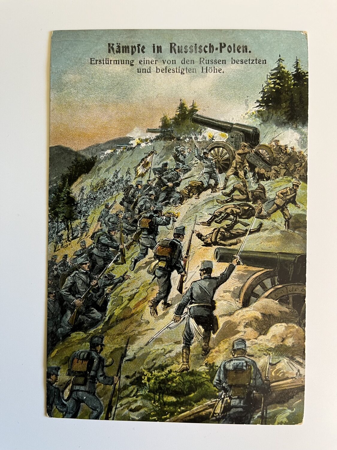 (hhl 44) MF neprošlá poštou. Boje v Ruském Polsku. Bouřlivý útok na výšinu obsazenou a opevněnou Rusy. Děla, šavle, pušky, výstroje, výzbroje.