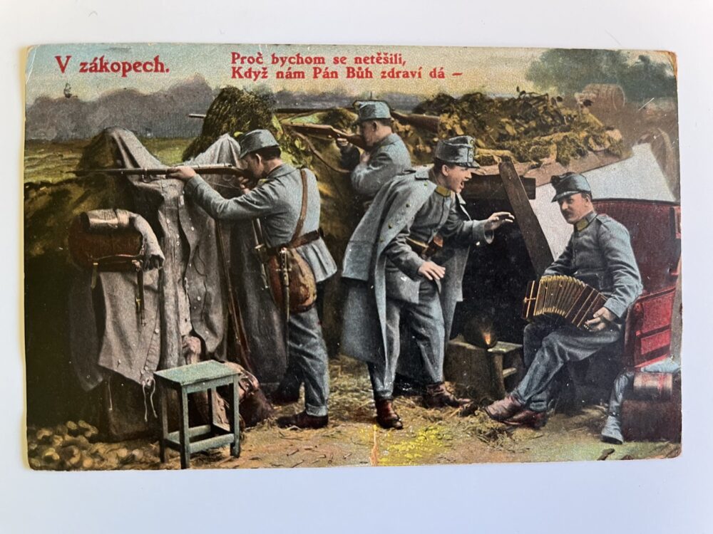 (hhl 62) MF neprošlá. Zákopy, vojáci, harmonika, výzbroj, výstroj, pušky…