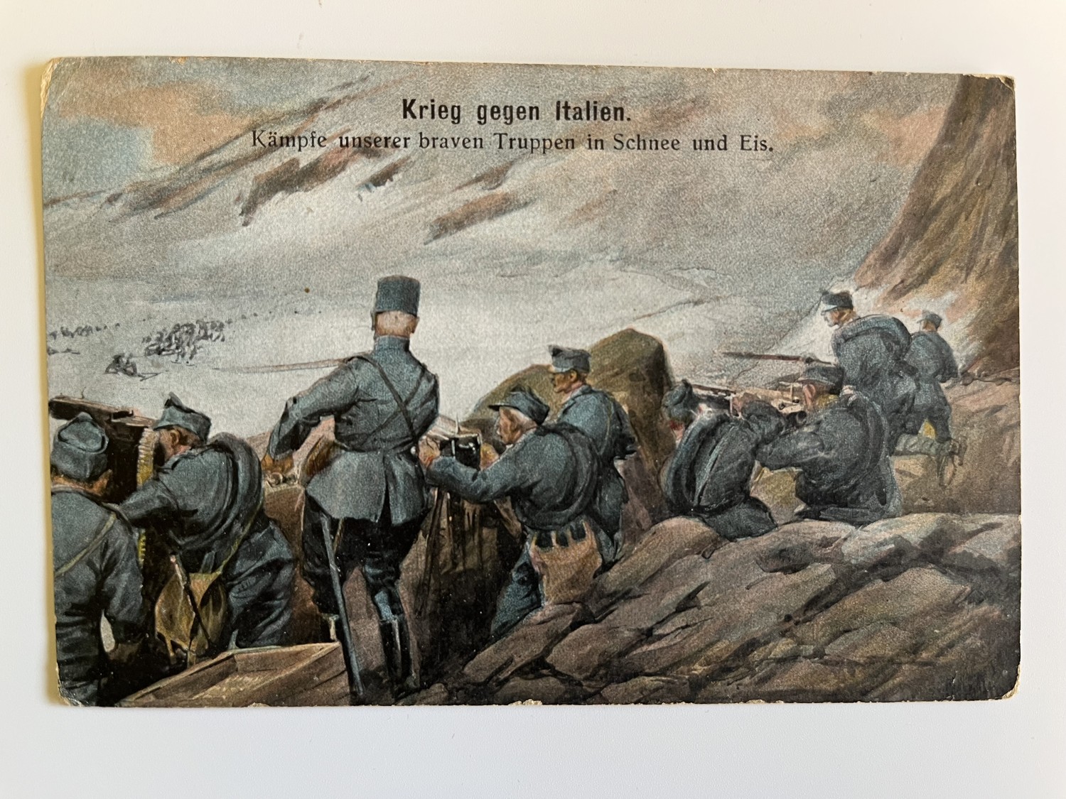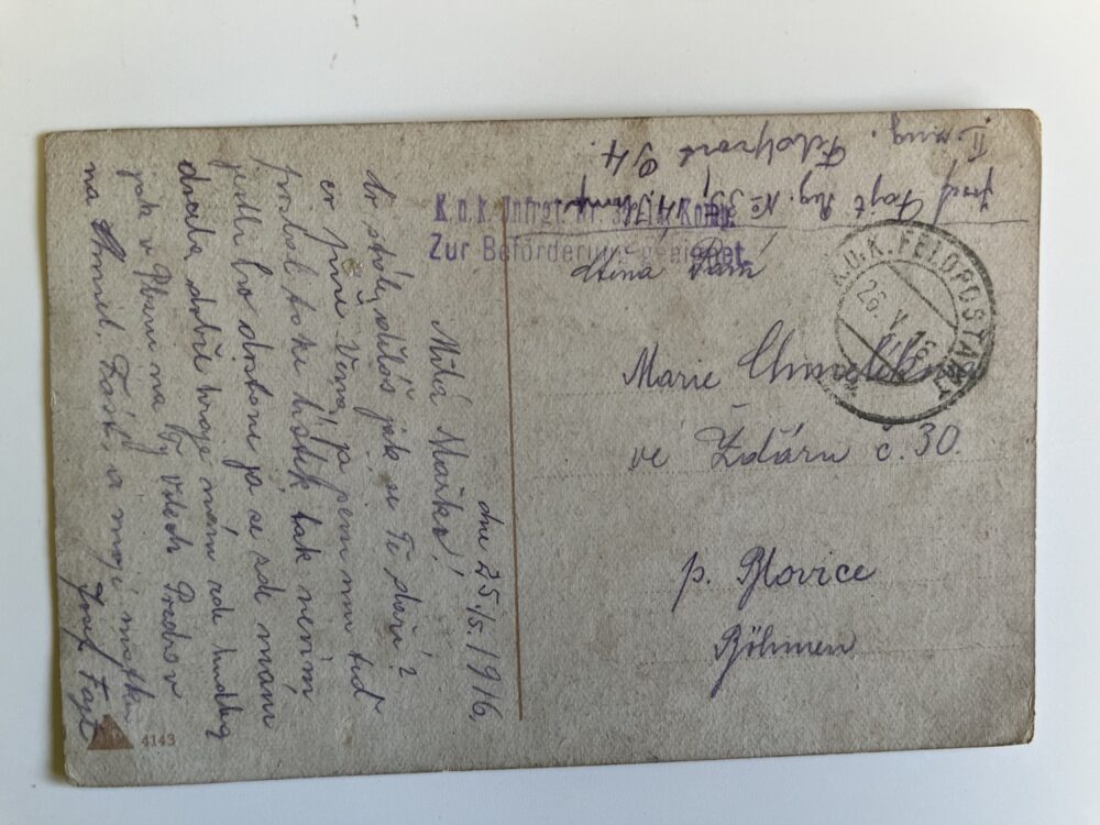 (hhl 51) MF prošlá, 1916. Adresát ve Žďáru, p. Blovice (okres Plzeň-jih). Boje našich statečných vojsk ve sněhu a ledu. Razítko.
