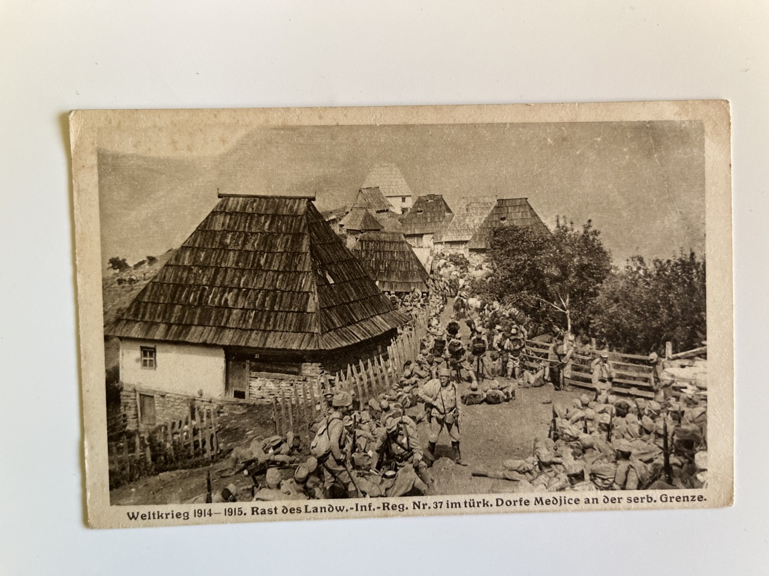 (hhl 90) MF pohlednice neprošlá poštou. Světová válka 1914 – 1915. Zbytek Zemědělské inf. Reg. č. 37 v turecké obci Medjice na srbských hranicích.