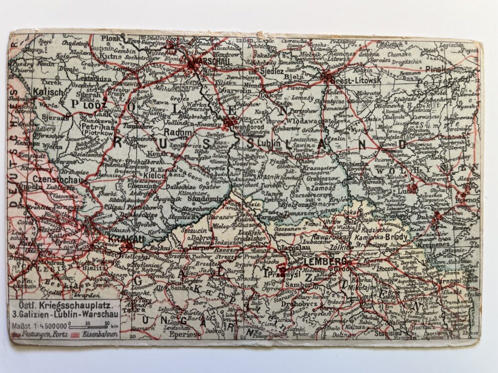 (hhl 109) MF, pohlednice neprošlá. Východní bojiště války. 3. Galicie – Lublin – Varšava, 1:4500000. Pevnosti, lesní železnice.