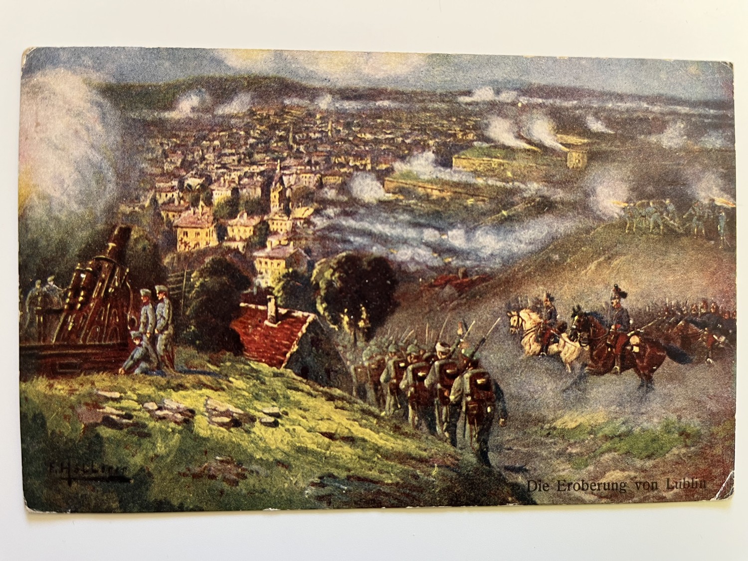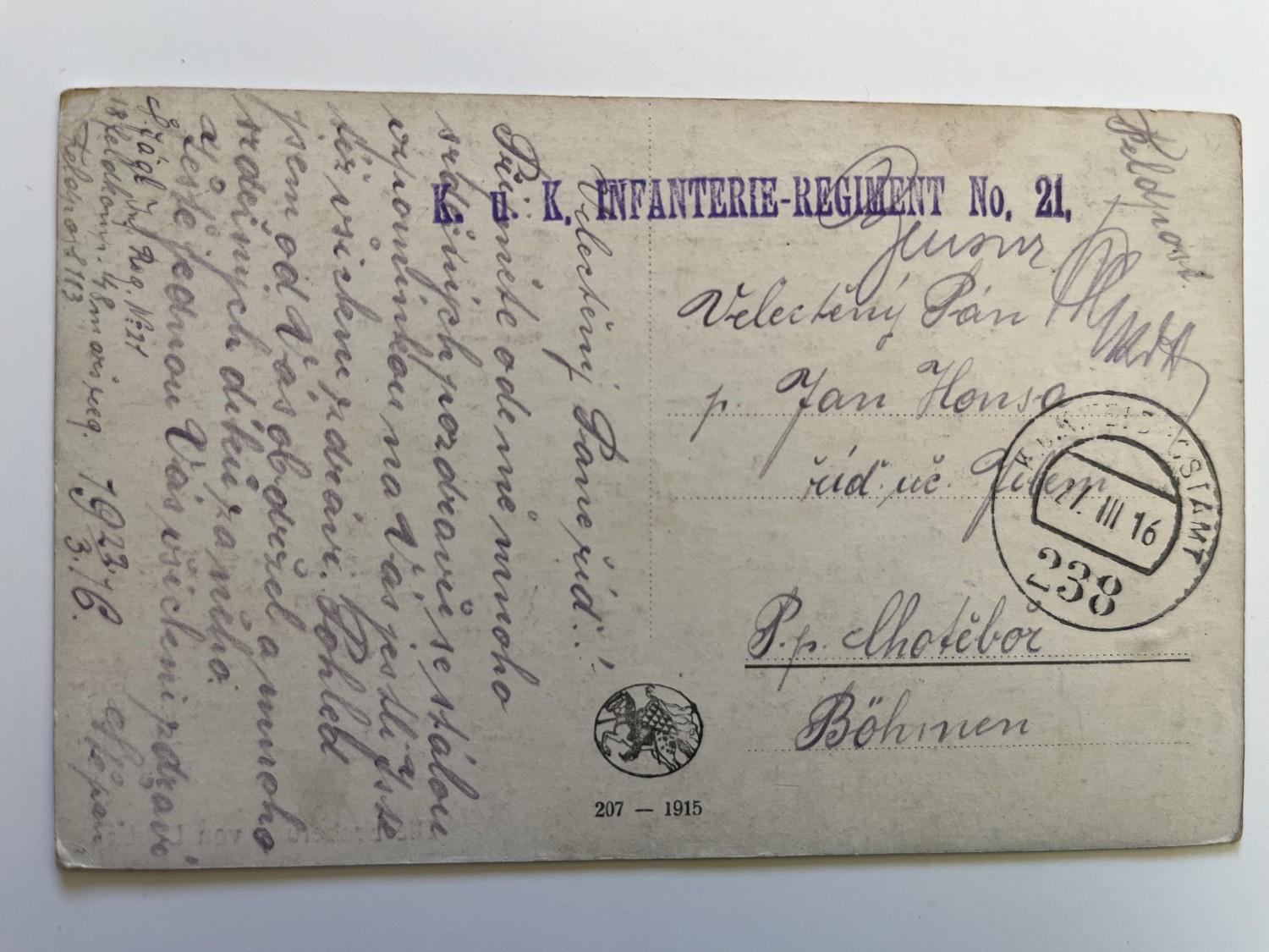 (hhl 104) MF pohlednice prošlá poštou, 1916. Adresát řídící učitel Jilem, p. Chotěboř okres Havlíčkův Brod. Razítka. Vojáci, výstroj, výzbroj, dělo…