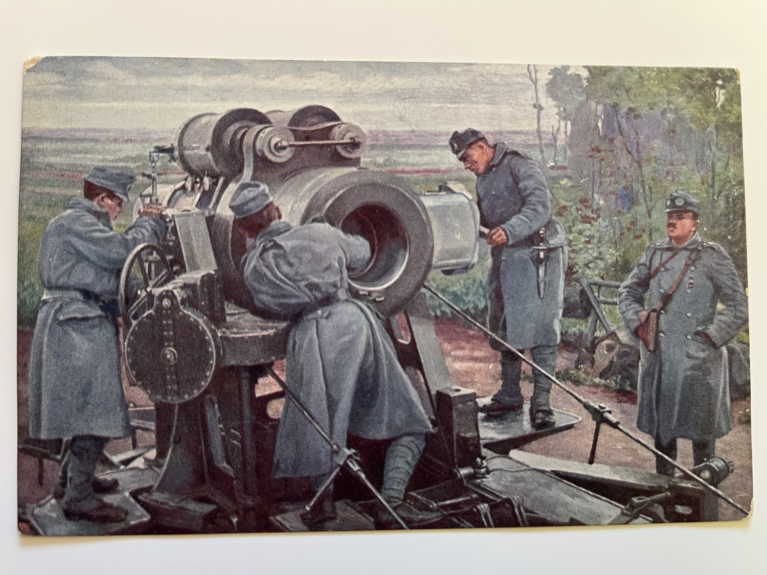 Vojenská pohlednice WW1 – Přípravy ke střelbě 30,5 cm moždířem