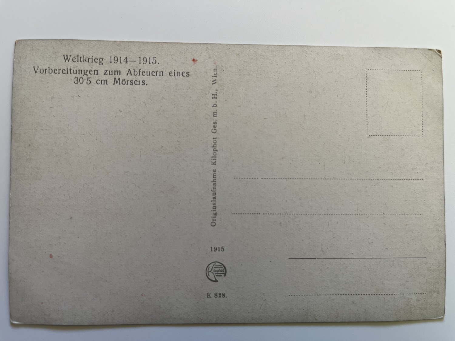 Vojenská pohlednice WW1 - Přípravy ke střelbě 30,5 cm moždířem - Obrázek 2
