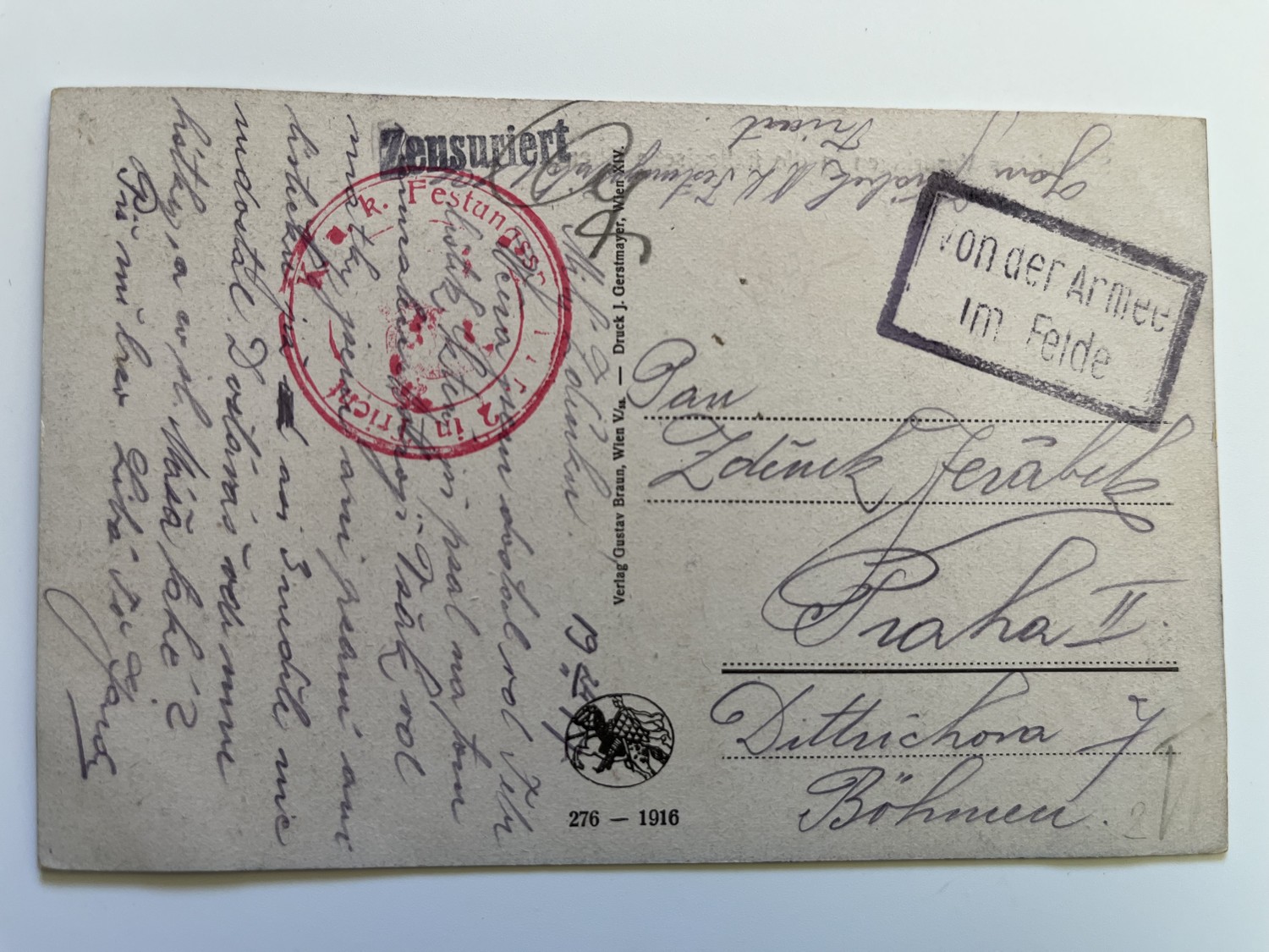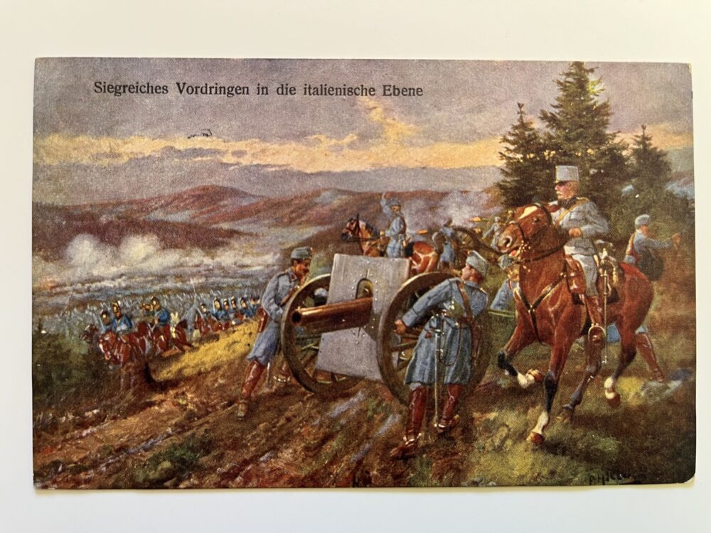 (hhl 103) MF pohlednice prošlá, 1917. Razítka, dělo, vojáci, výzbroj, výstroj…