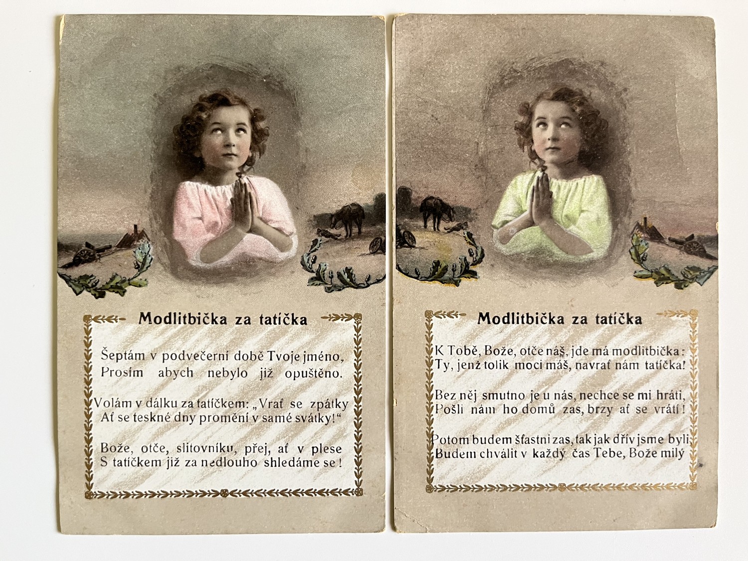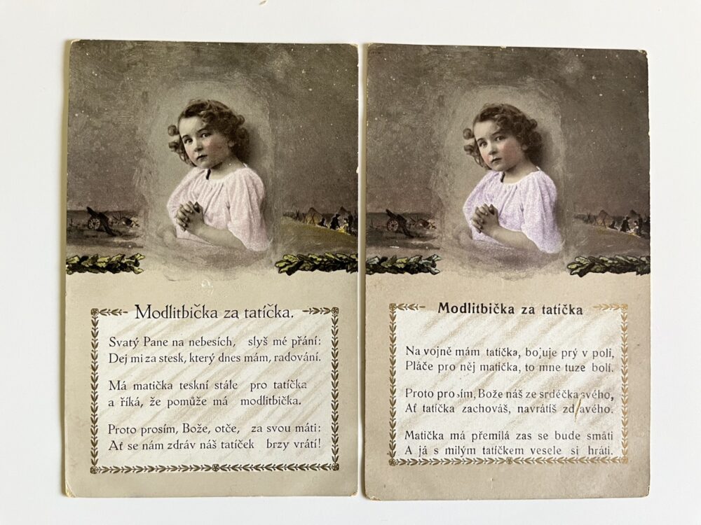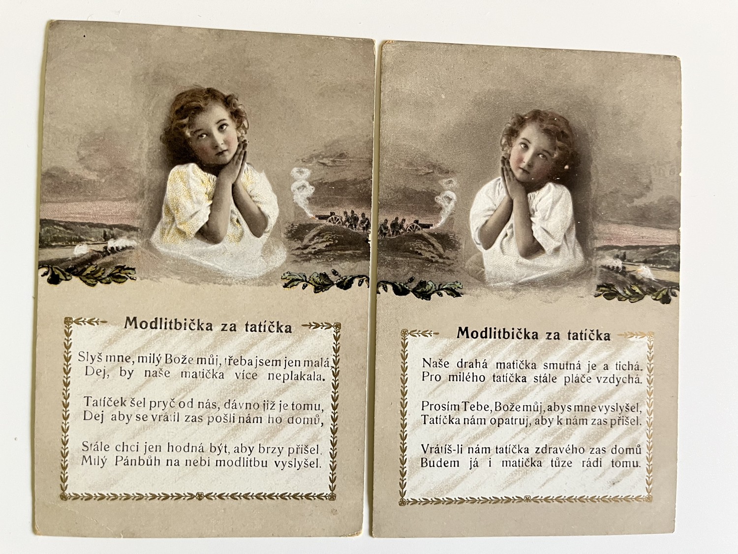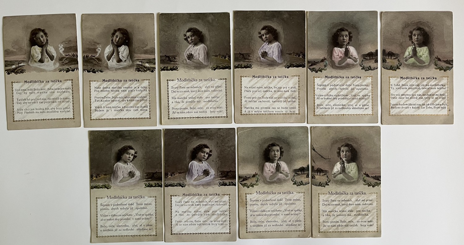(hhn 10) MF 2x pohlednice prošlá poštou. 8x pohlednice čistá. Vojáci na frontě, kůň, dělo. Série pohlednic modlitbiček za tatíčka – modlící se děvčátko.