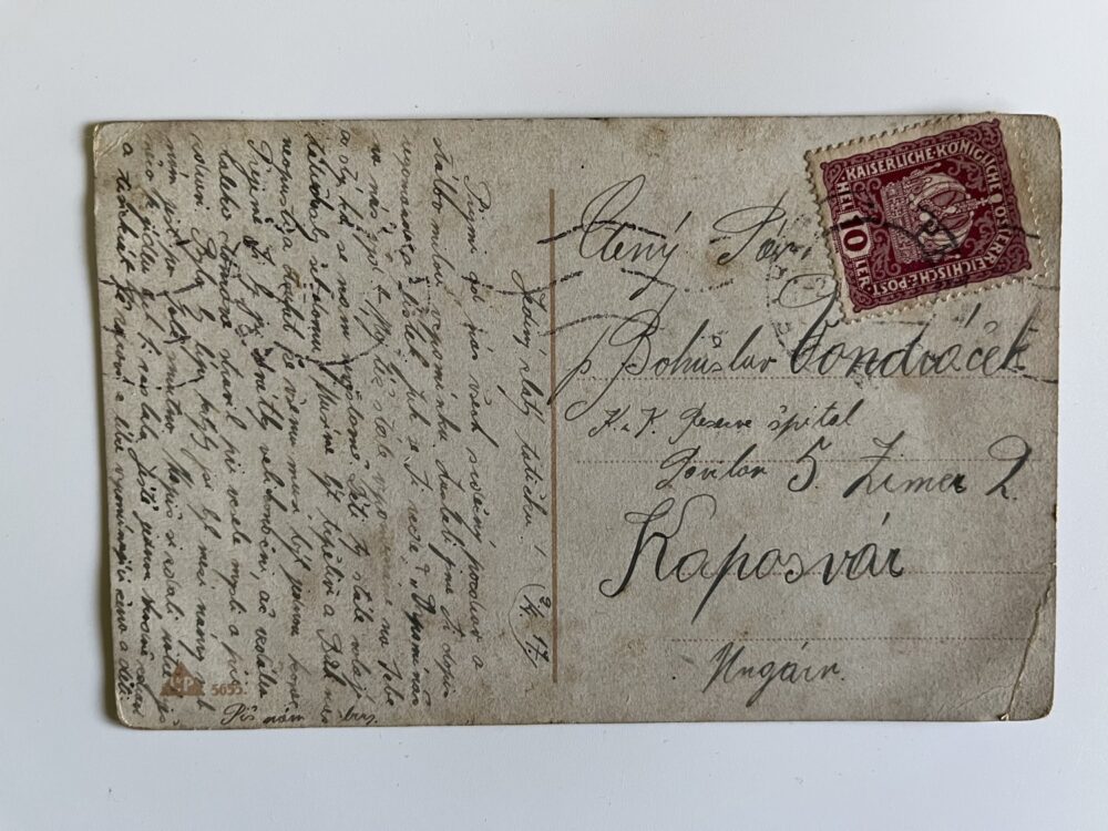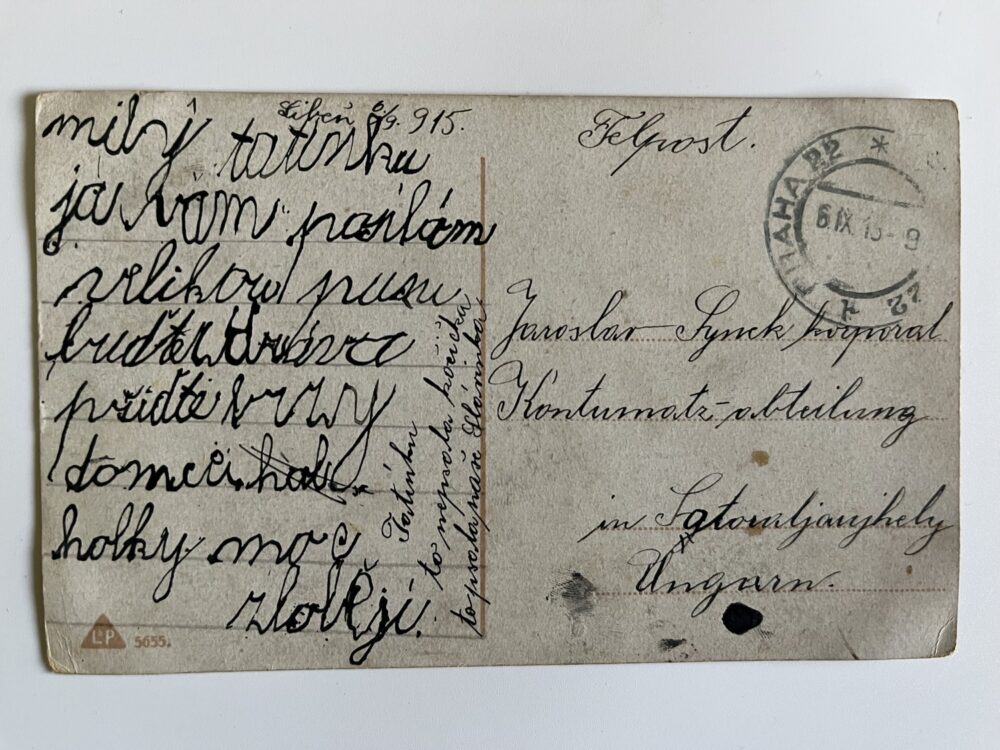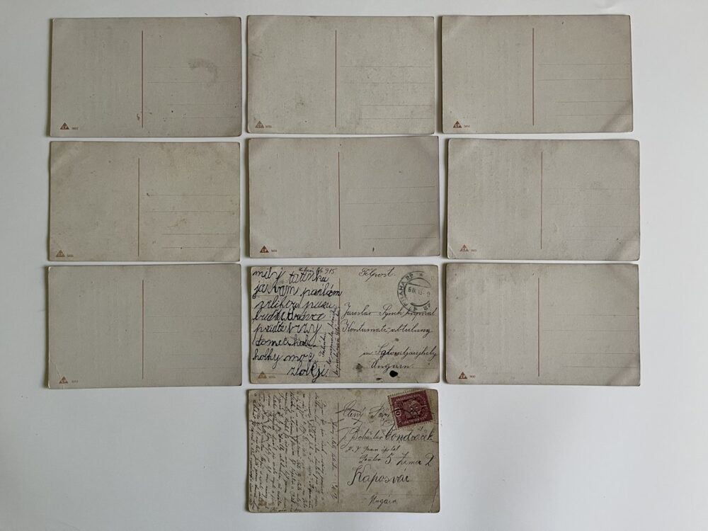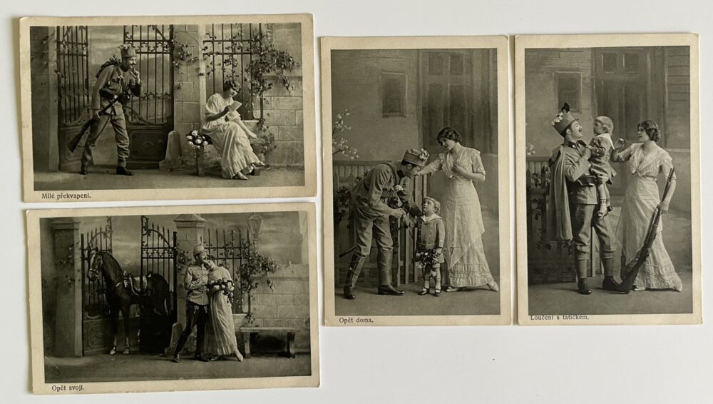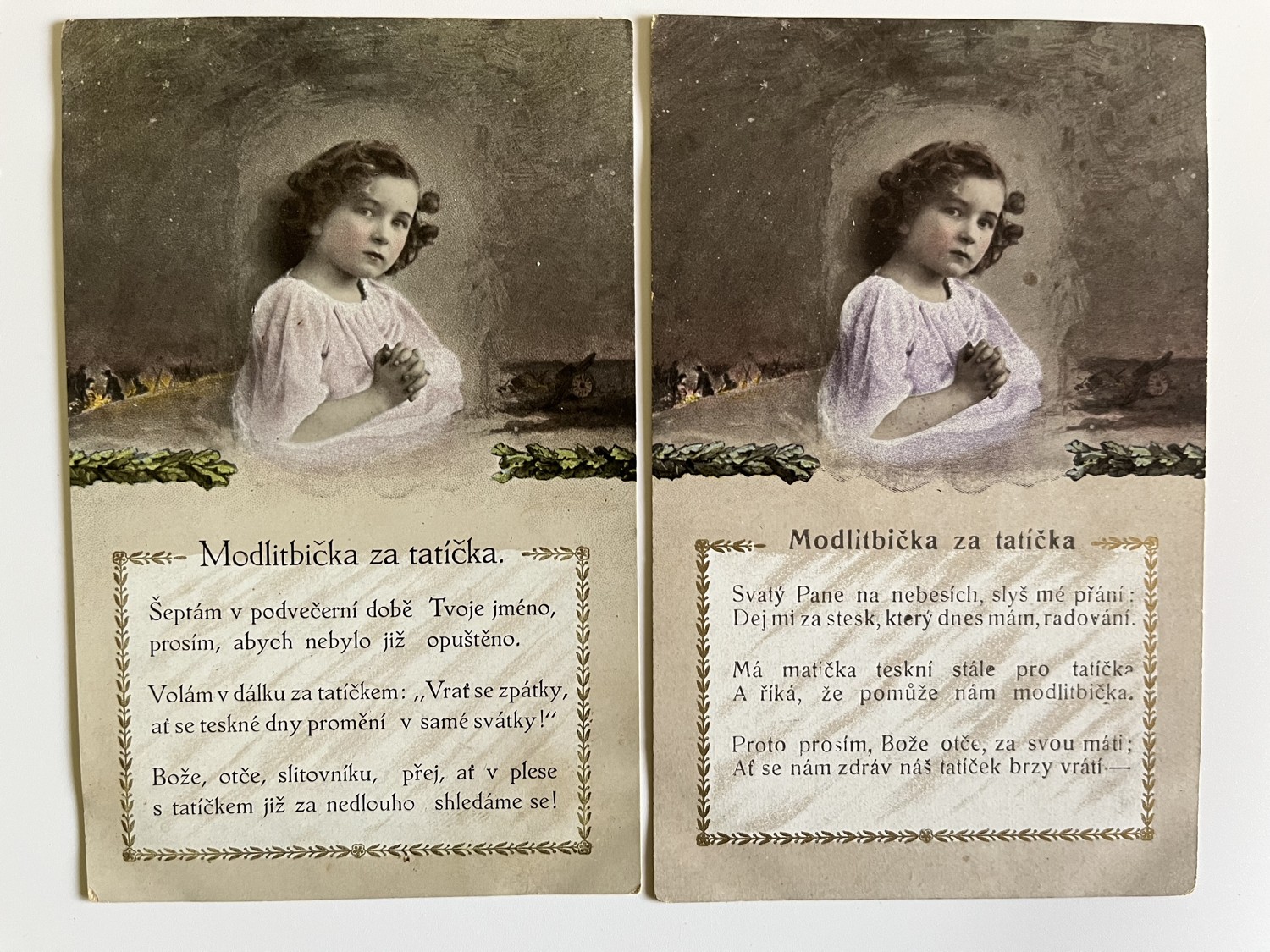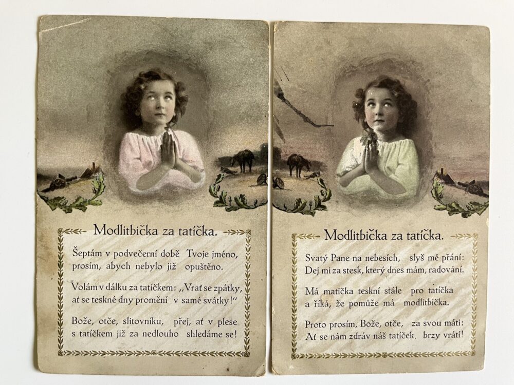 (hhn 10) MF 2x pohlednice prošlá poštou. 8x pohlednice čistá. Vojáci na frontě, kůň, dělo. Série pohlednic modlitbiček za tatíčka – modlící se děvčátko.