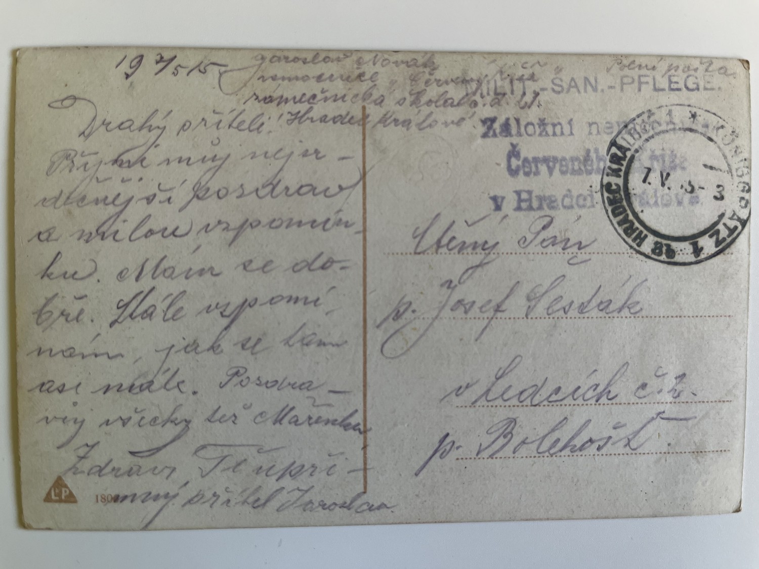 (hhl 34) MF prošlá poštou, 1915. Adresát v Ledcích, p. Bolehošť. Razítko Záložní nemocnice Červeného Kříže v Hradci Králové.