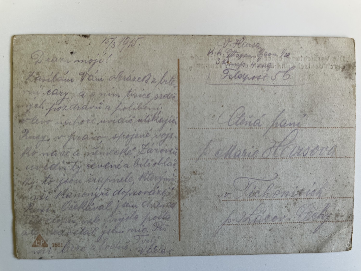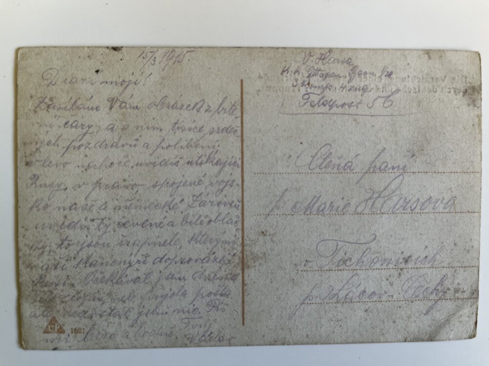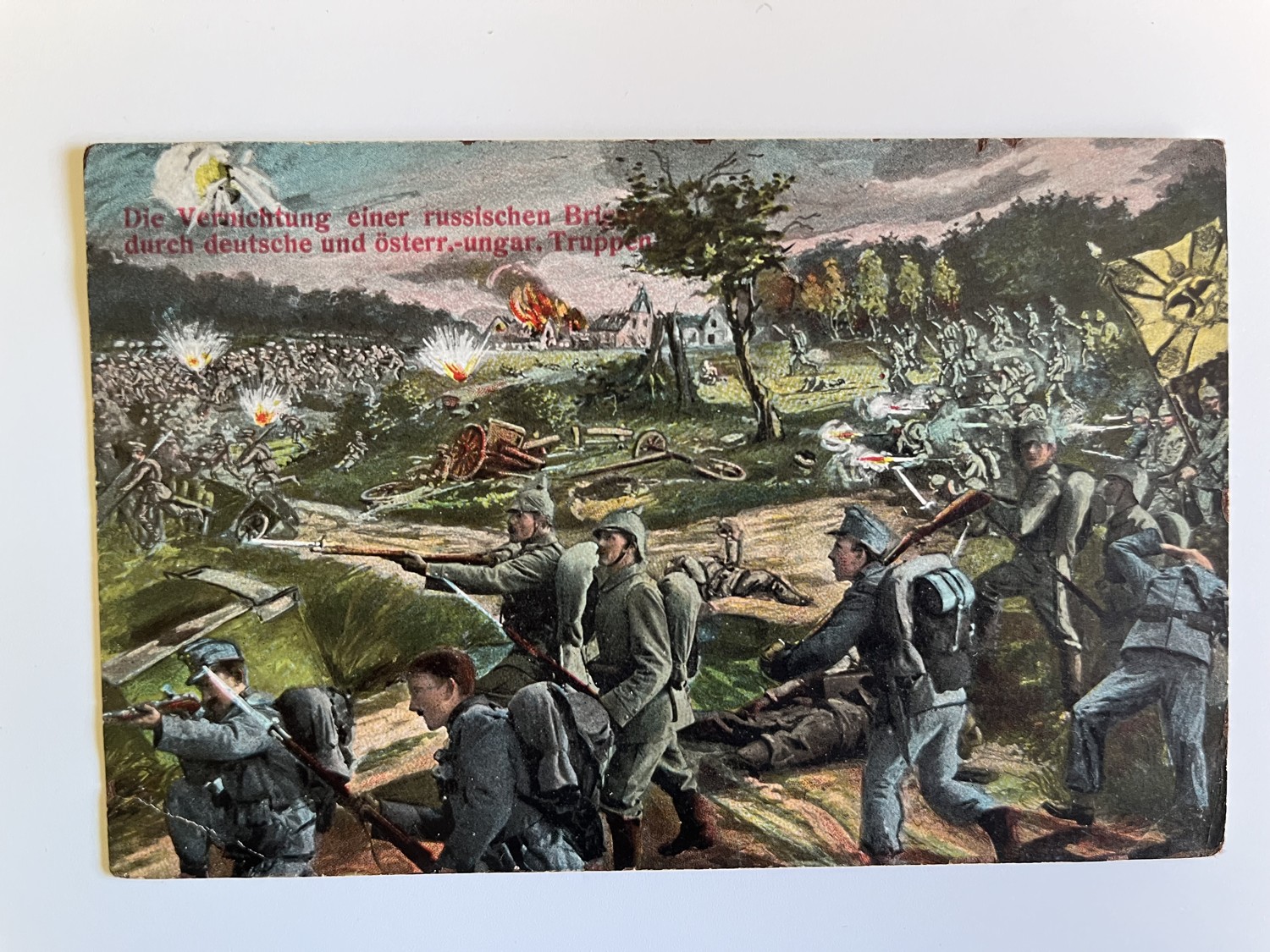 (hhl 54) MF prošlá, 1915. Adresát Tichonice, p.Kácov (okres Benešov). Zničení ruské brigády německými a rakousko-uherskými vojsky.