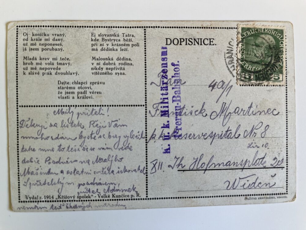 (hhl 80) MF pohlednice prošlá poštou. Vydal r.1914 Křížový spolek – Velké Kunčice p.R. Razítko
