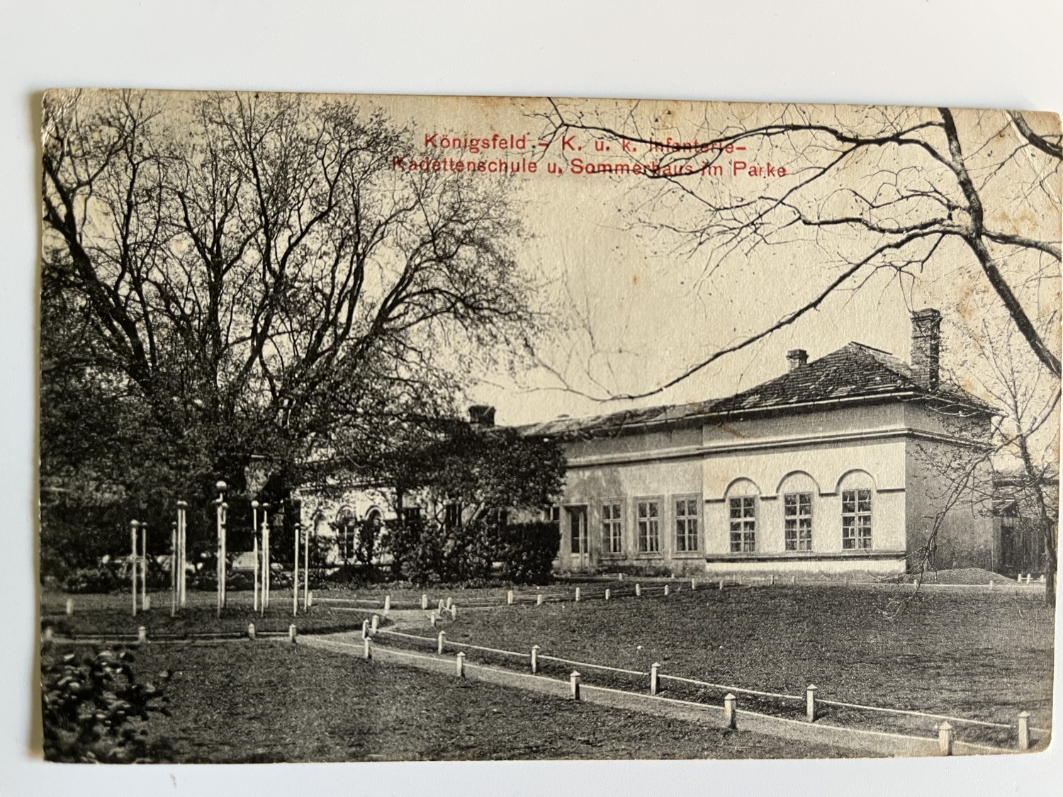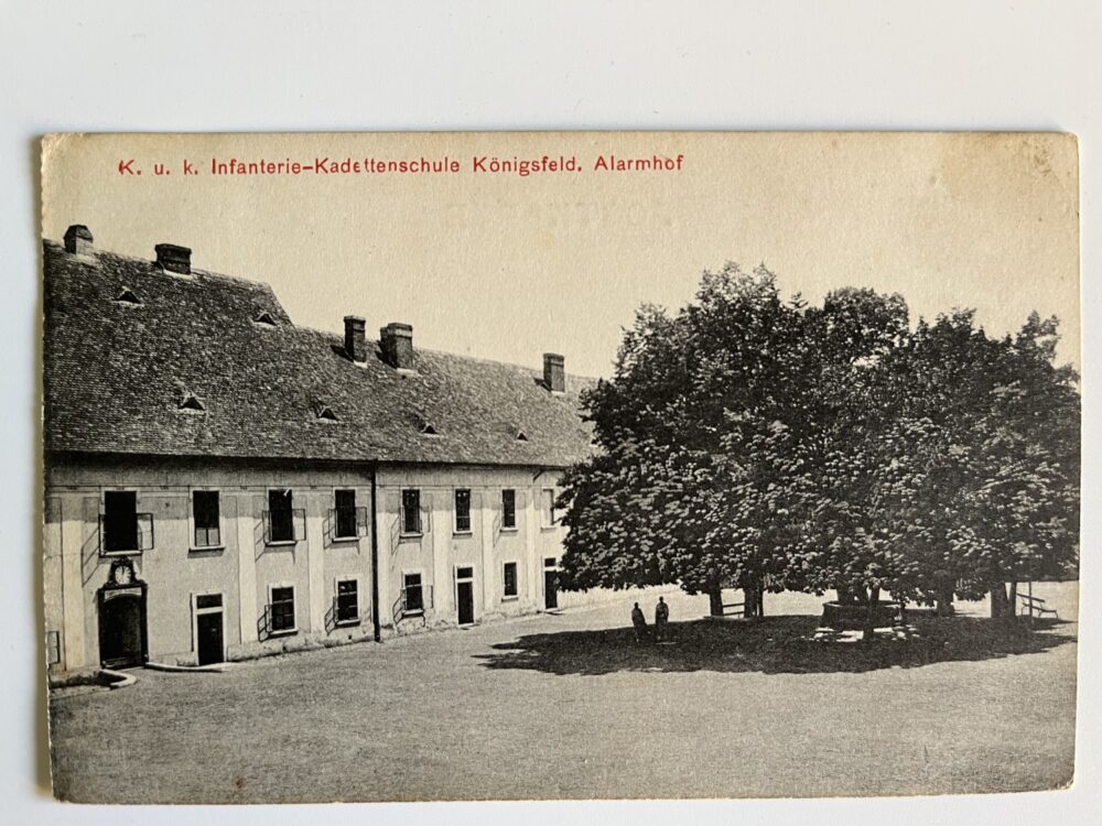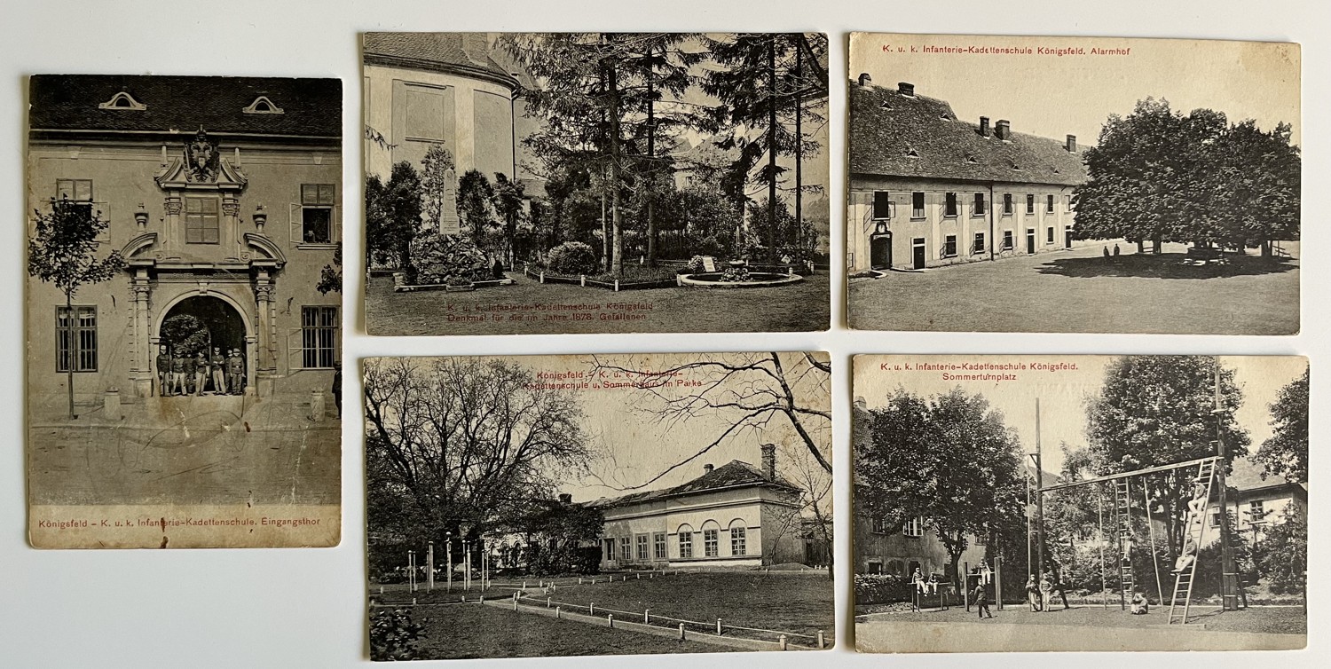 (hhm 4) MF 5 x pohlednice neprošlá poštou. 1 x Königsfeld – pěchotní kadetní škola. Vstupní brána. 1 x Kadetní škola pěchoty Königsfeld. Letní tělocvična. 1 x Kadetní škola pěchoty Königsfeld. Poplachový dvůr. Kadetní škola pěchoty Königsfeld a letní budova v parku. 1 x Königsfeld památník pro padlé v roce 1878.