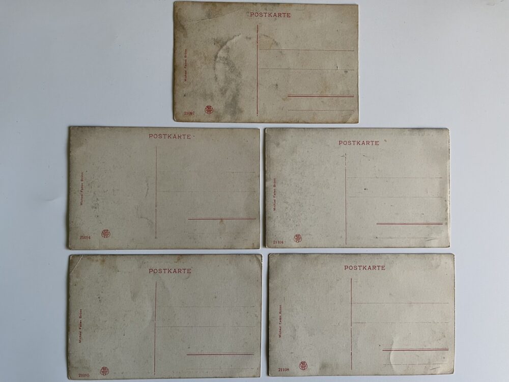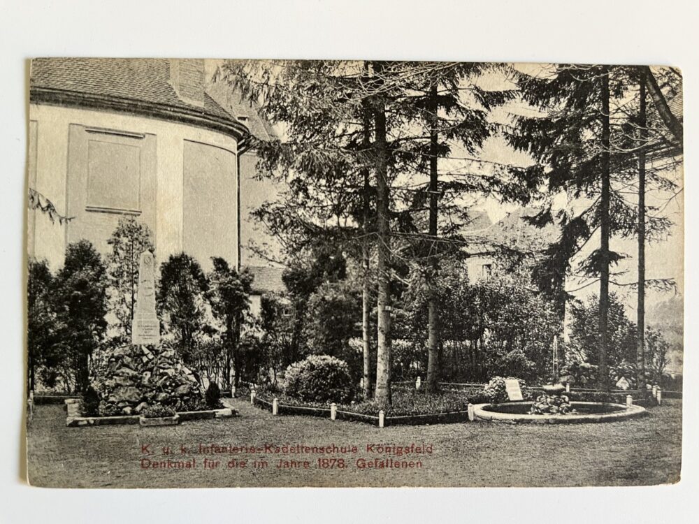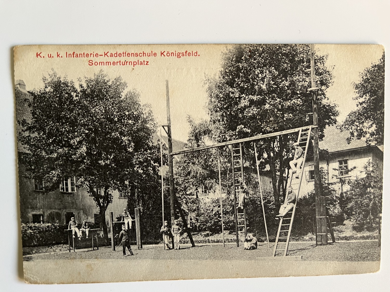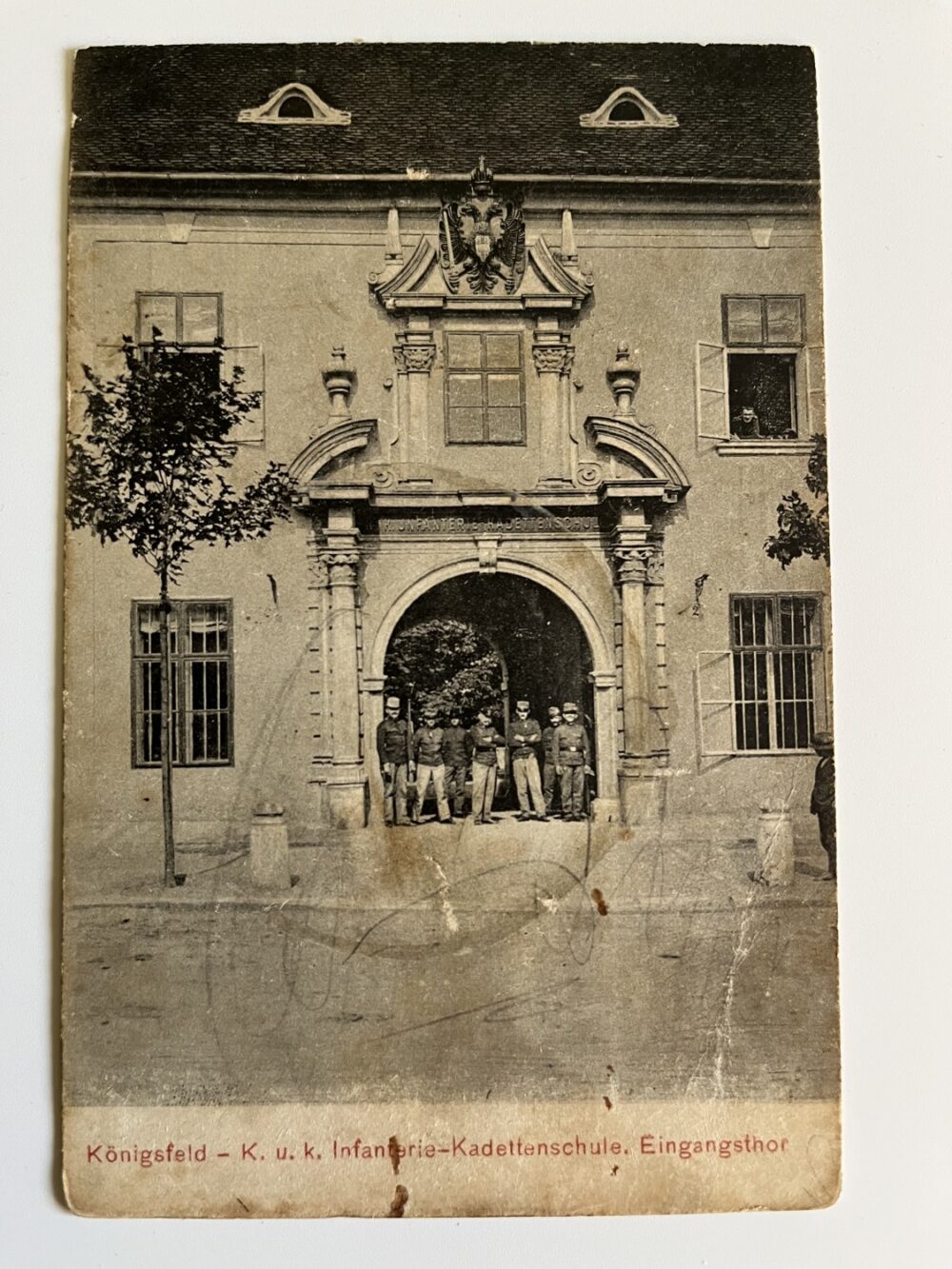 (hhm 4) MF 5 x pohlednice neprošlá poštou. 1 x Königsfeld – pěchotní kadetní škola. Vstupní brána. 1 x Kadetní škola pěchoty Königsfeld. Letní tělocvična. 1 x Kadetní škola pěchoty Königsfeld. Poplachový dvůr. Kadetní škola pěchoty Königsfeld a letní budova v parku. 1 x Königsfeld památník pro padlé v roce 1878.