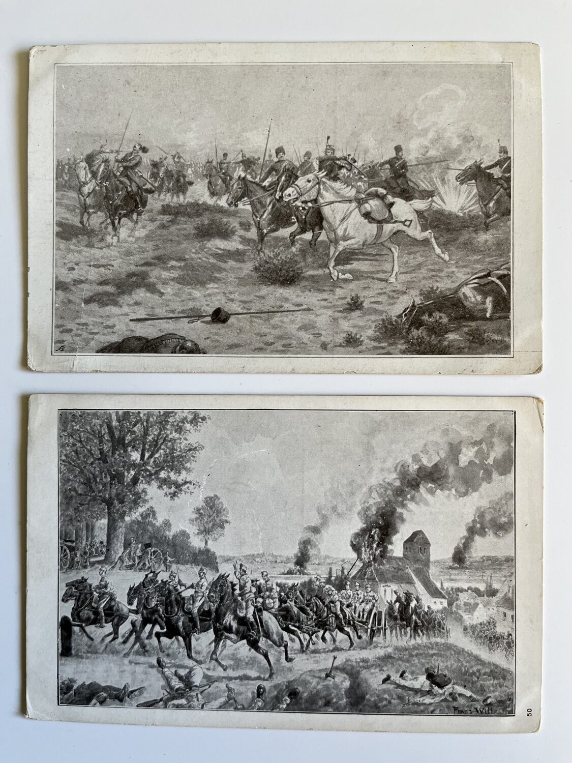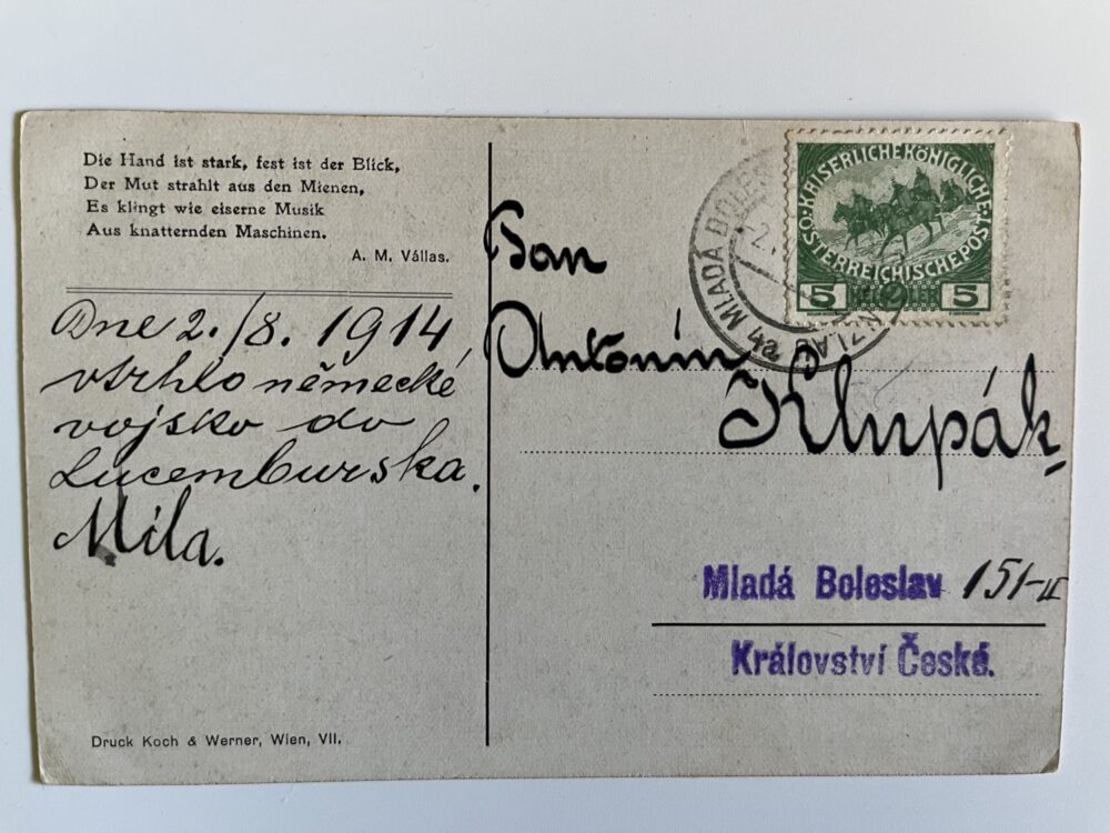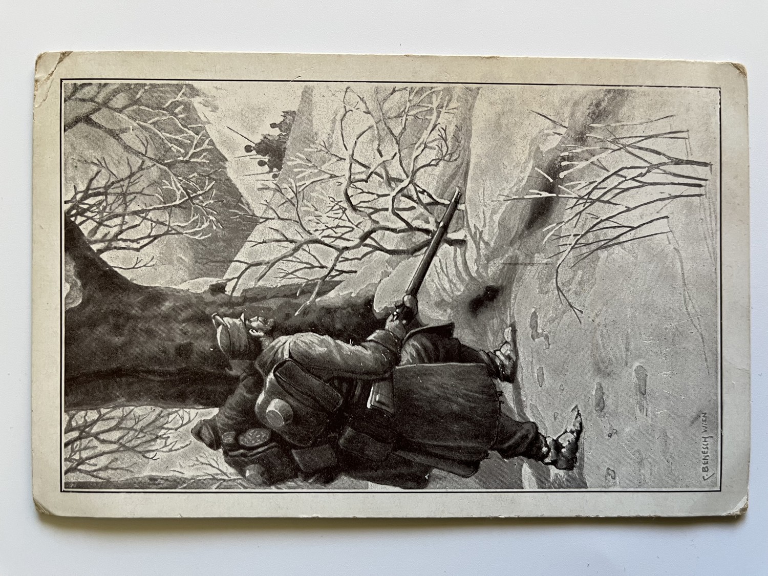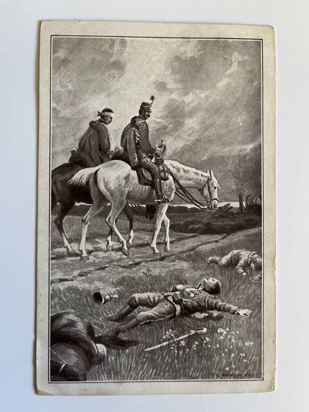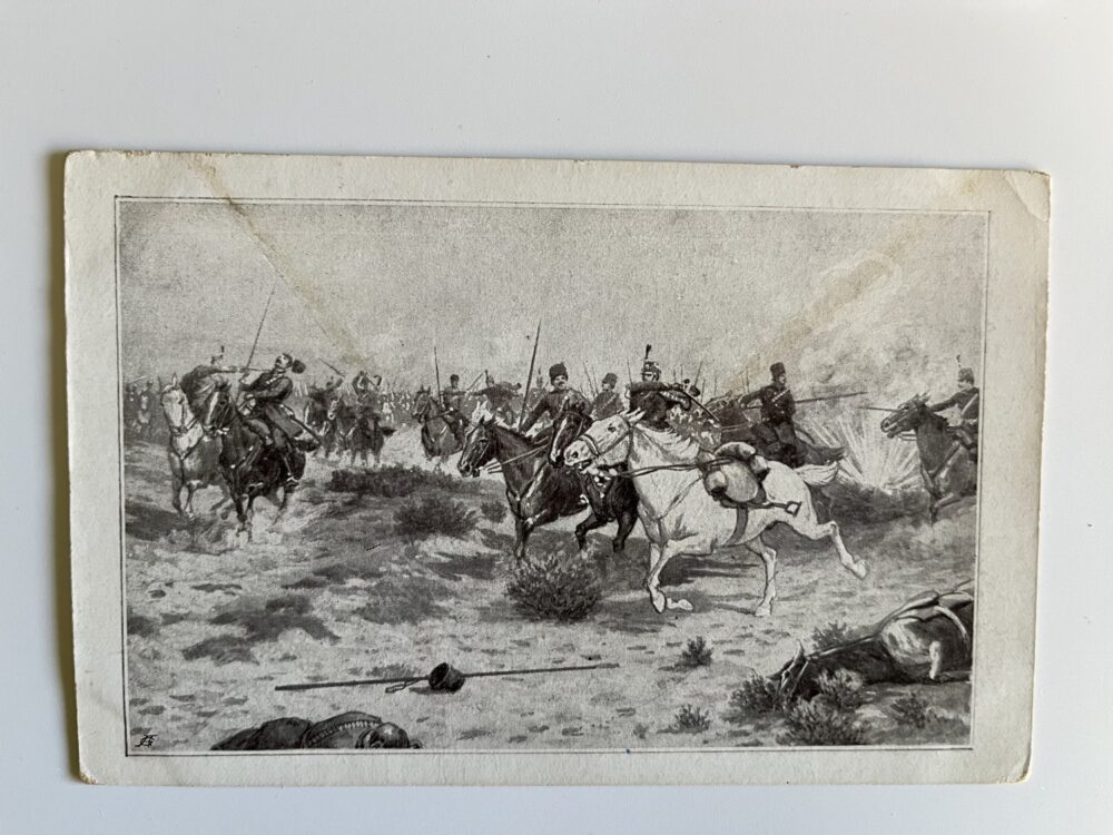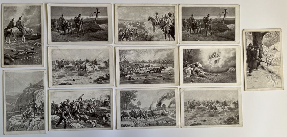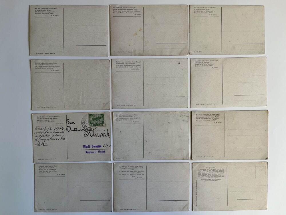 (hhm 25) MF Malíř Benesch. 11 x pohlednice neprošlá poštou. 1 x pohlednice prošlá poštou, adresát Mladá Boleslav Království České – text: Dne 2.8. 1914 vtrhlo německé vojsko do Lucemburska. Míla. Věrná hlídka. Tichá modlitba k přátelům…Husaři, „rudí ďáblové“…Zranění vojáci. Bitvy, bojiště, bajonety, zbraně, výstroje, výzbroje, pušky, koně, padlí vojáci, umírající voják,