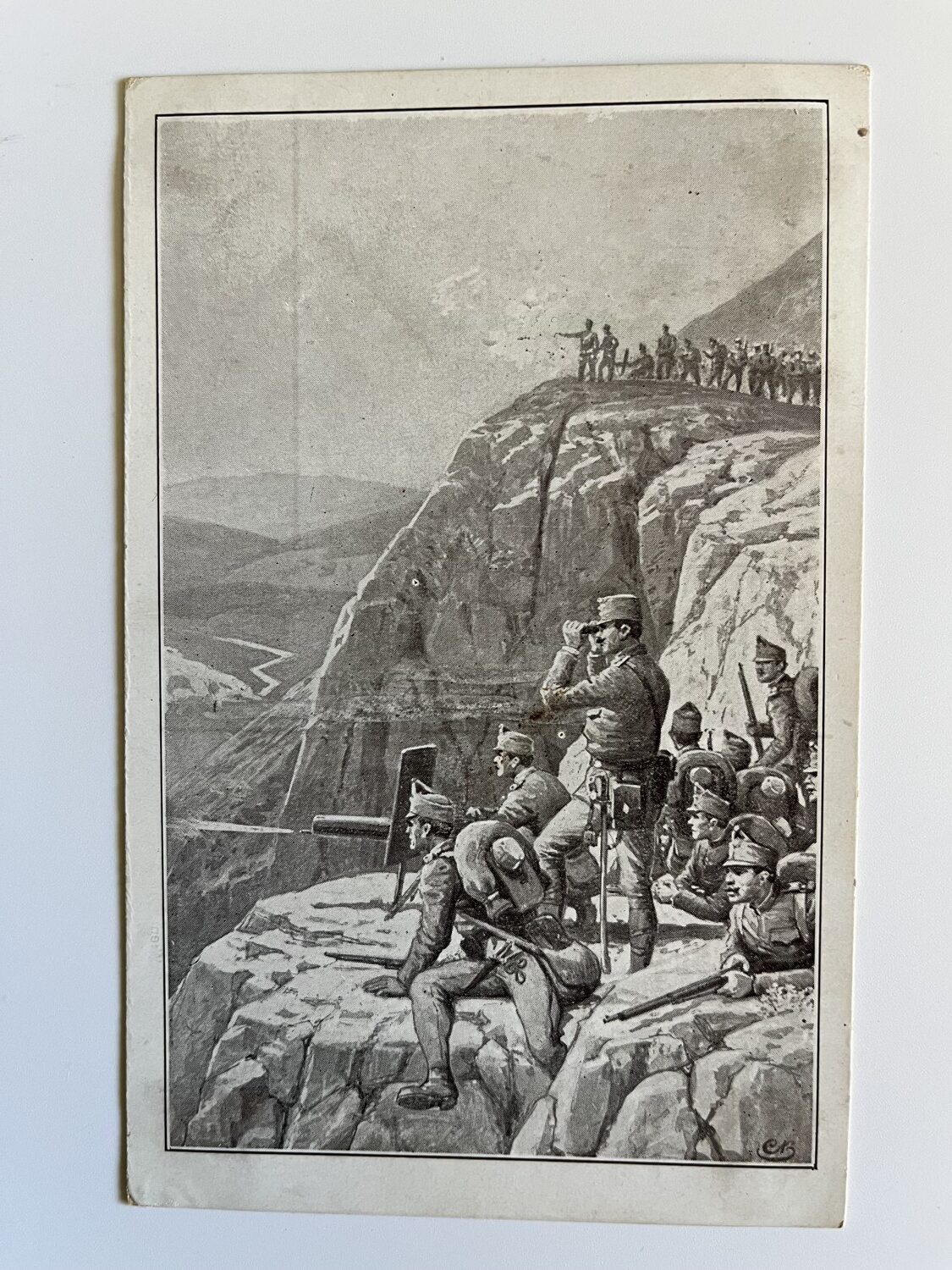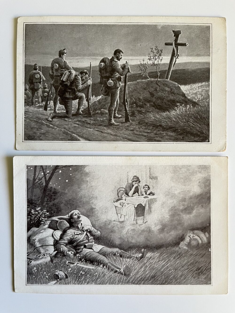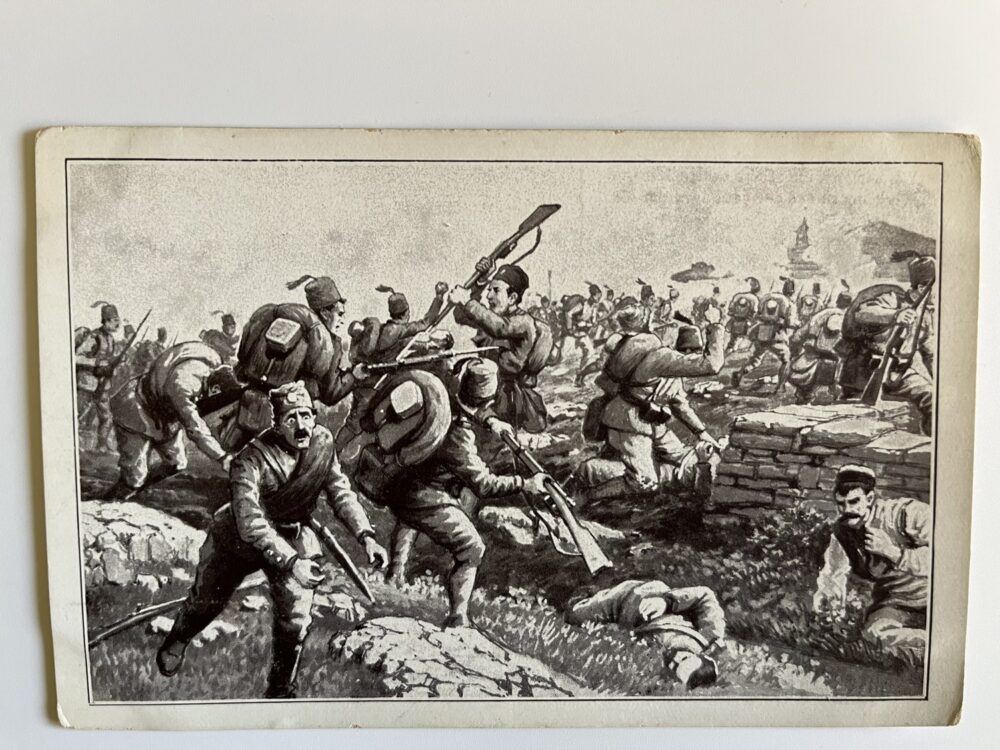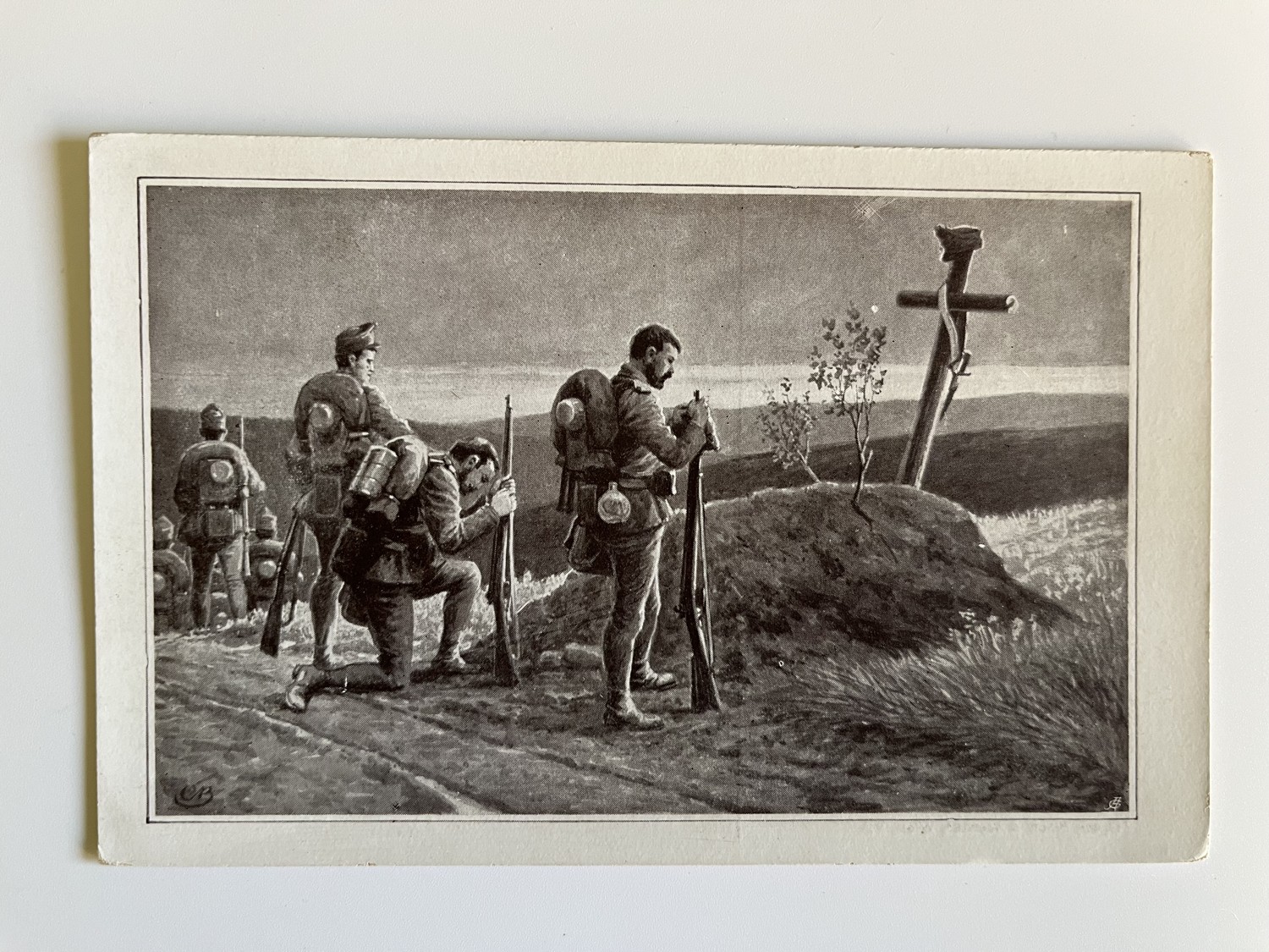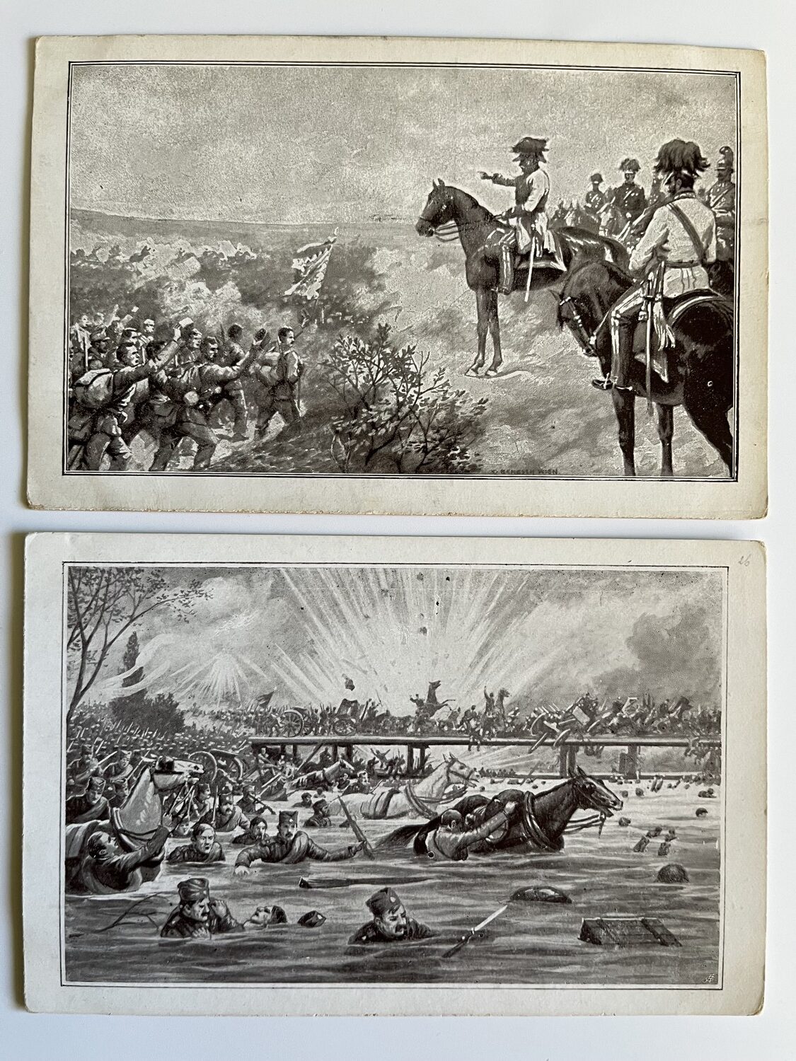 (hhm 25) MF Malíř Benesch. 11 x pohlednice neprošlá poštou. 1 x pohlednice prošlá poštou, adresát Mladá Boleslav Království České – text: Dne 2.8. 1914 vtrhlo německé vojsko do Lucemburska. Míla. Věrná hlídka. Tichá modlitba k přátelům…Husaři, „rudí ďáblové“…Zranění vojáci. Bitvy, bojiště, bajonety, zbraně, výstroje, výzbroje, pušky, koně, padlí vojáci, umírající voják,