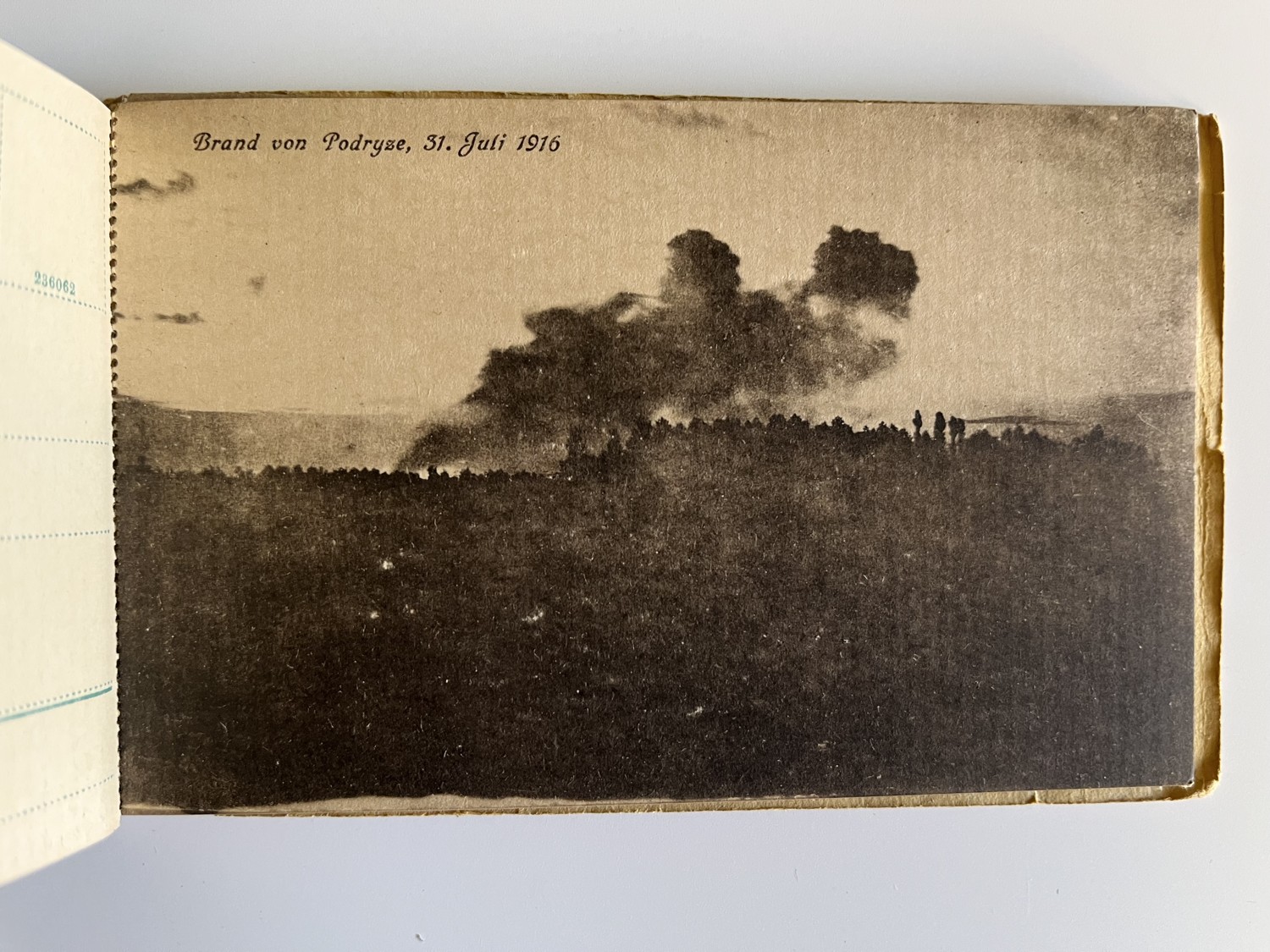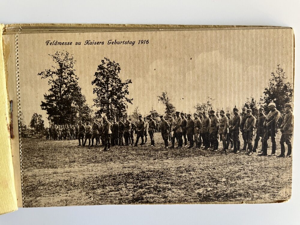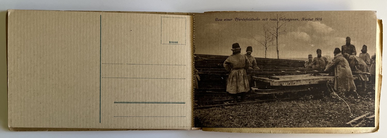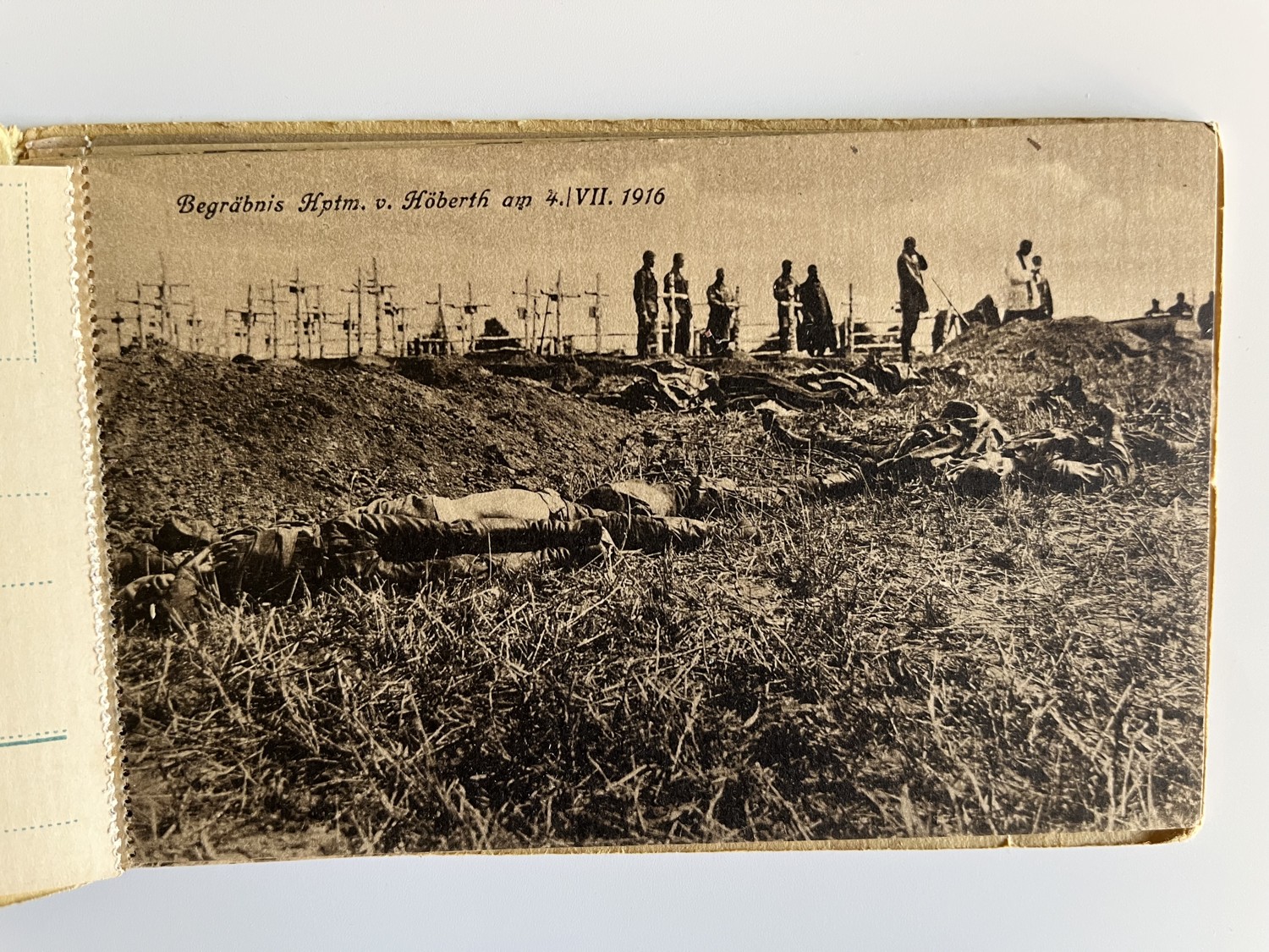 (hhm 26) MF Série pohlednic 10 ks sešité k sobě – K. Spojené království. Inf.- Reg. č. 99 ve světové válce. Vydání ve prospěch tělesně postižených. Fond pro vdovy a sirotky. Polní mše ke Kaiserovým narozeninám v roce 1916. Pohřeb kapitána V. Höbertha 4.VII. 1916. Výchozí pozice b. Podrysis, červenec 1916. Poloha lesa I. Poloha lesa II. Plynový alarm, plynové masky. Požár Podryse, 31.července 1916. Řemeslníci pluku při práci v otevřeném táboře, šicí stroje…léto 1916. Otevřený tábor, vojáci při práci…Stavba koněspřežné polní železnice s ruskými zajatci, podzim 1916