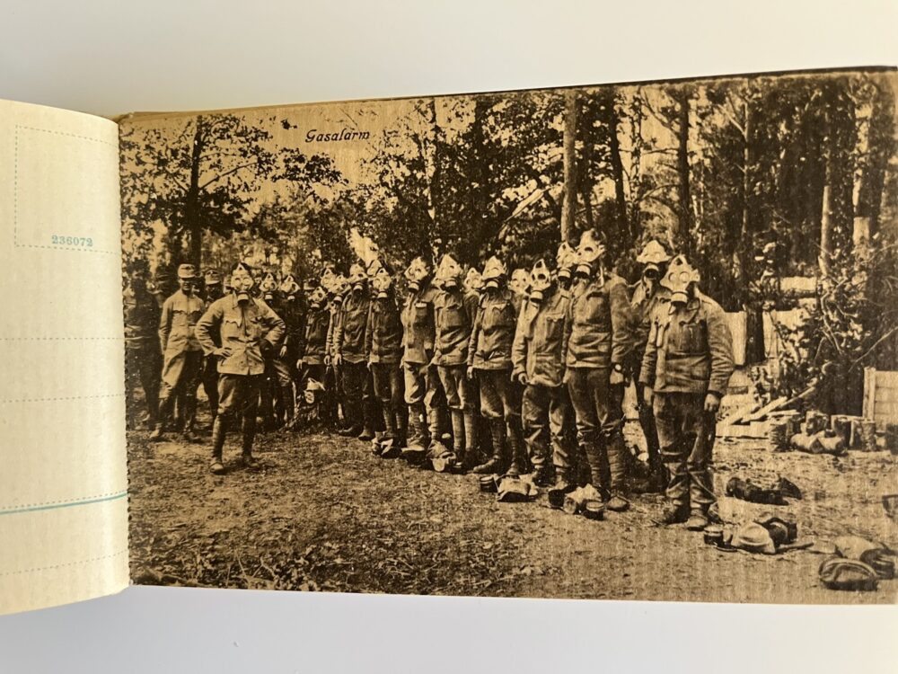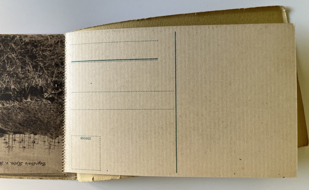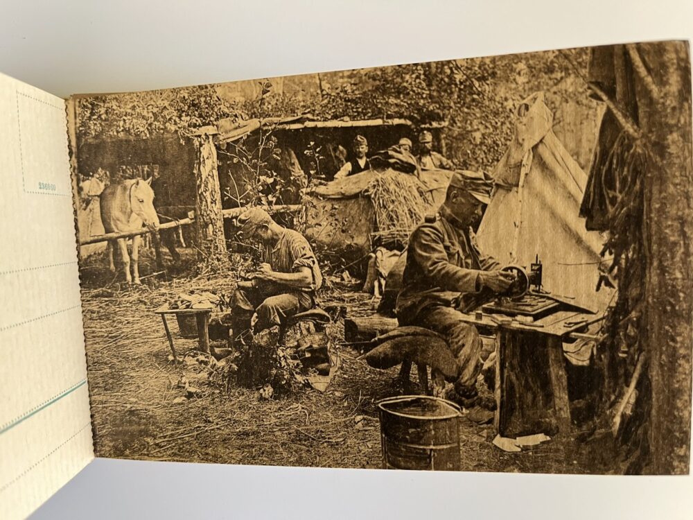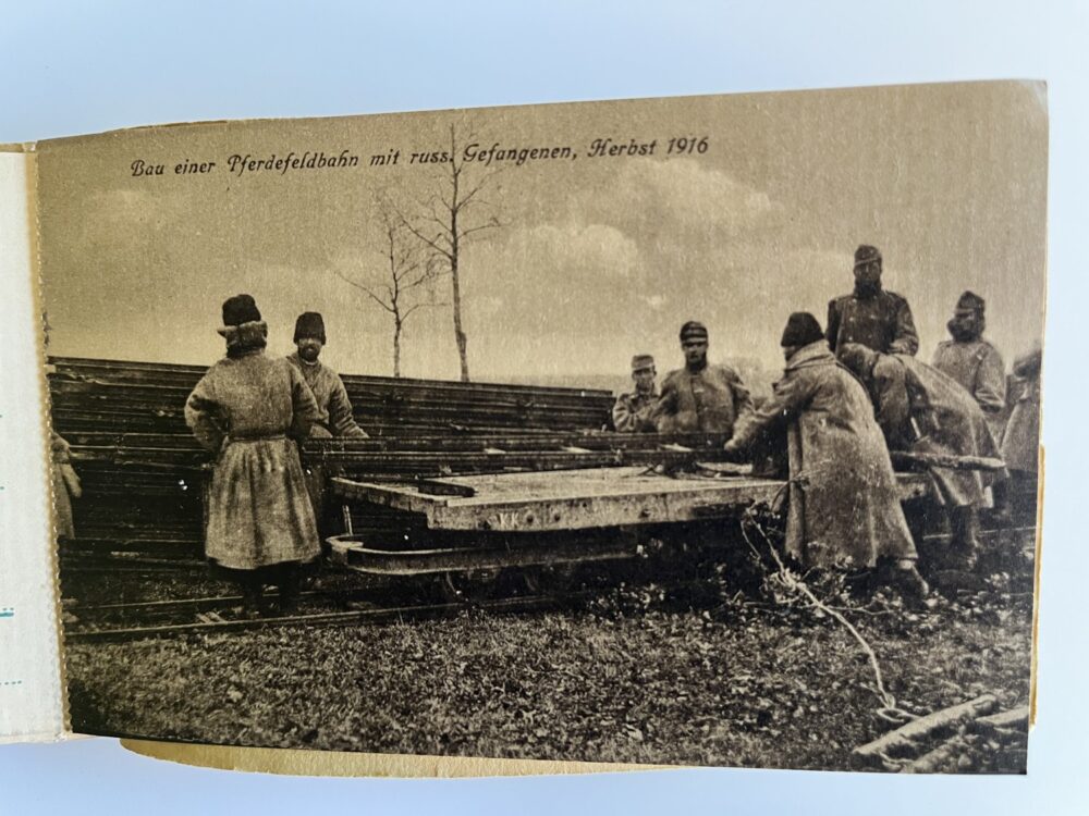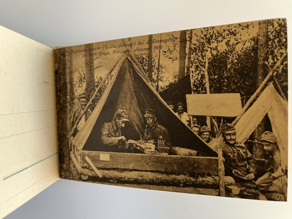 (hhm 26) MF Série pohlednic 10 ks sešité k sobě – K. Spojené království. Inf.- Reg. č. 99 ve světové válce. Vydání ve prospěch tělesně postižených. Fond pro vdovy a sirotky. Polní mše ke Kaiserovým narozeninám v roce 1916. Pohřeb kapitána V. Höbertha 4.VII. 1916. Výchozí pozice b. Podrysis, červenec 1916. Poloha lesa I. Poloha lesa II. Plynový alarm, plynové masky. Požár Podryse, 31.července 1916. Řemeslníci pluku při práci v otevřeném táboře, šicí stroje…léto 1916. Otevřený tábor, vojáci při práci…Stavba koněspřežné polní železnice s ruskými zajatci, podzim 1916