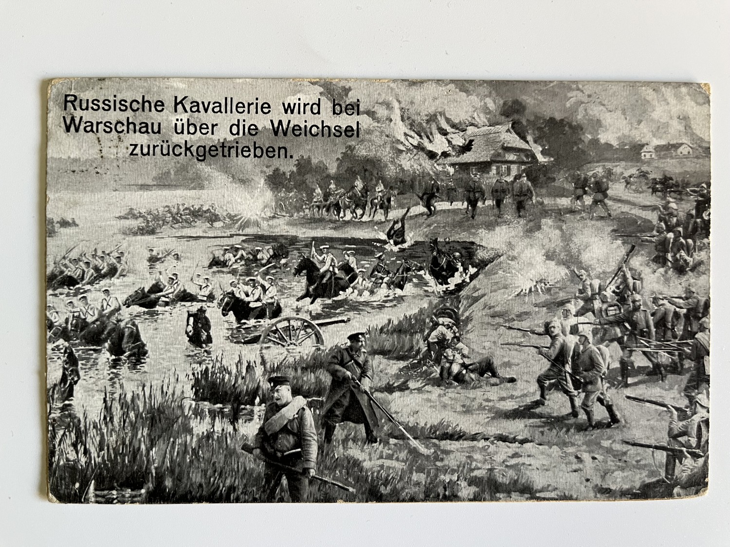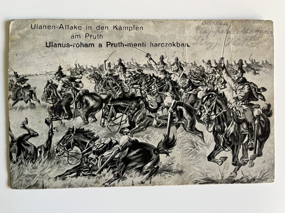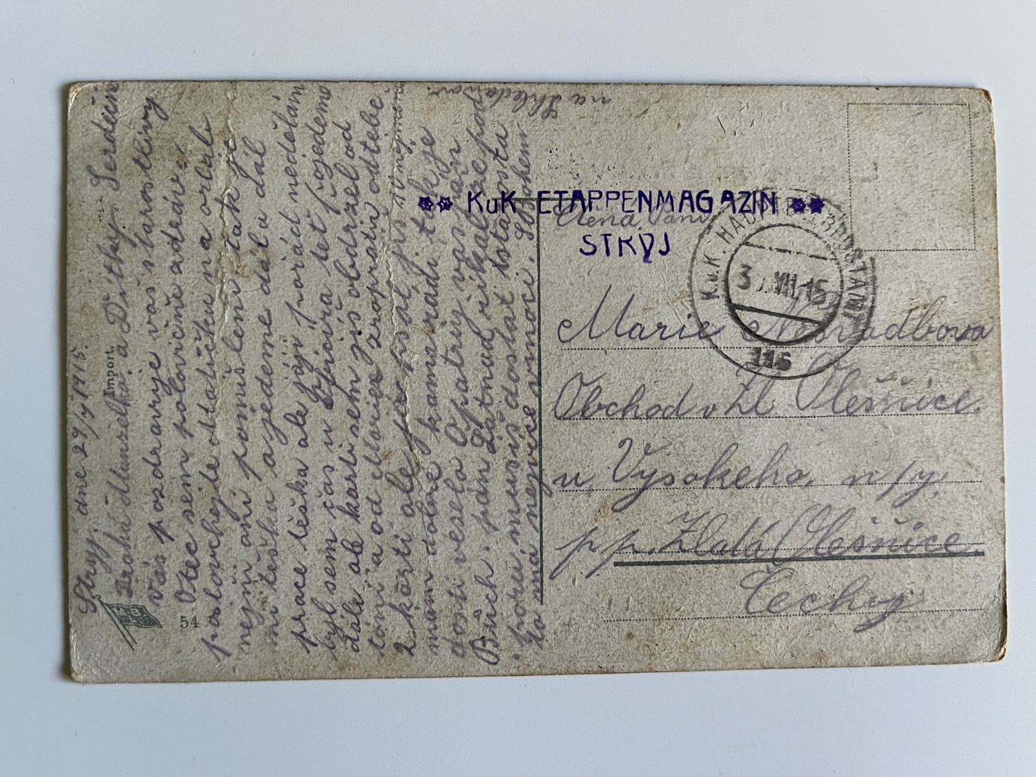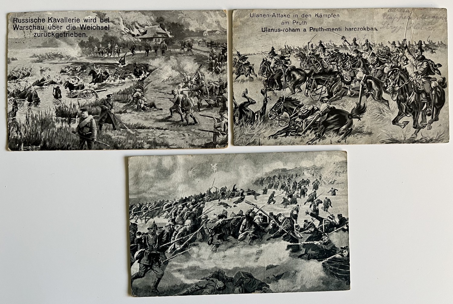 (hhm 6) MF 3 x pohlednice prošlá poštou. Adresát Police nad Metují, okres Náchod, 1915. Adresát obchod ve Zlaté Olešnici, p. Zlatá Olešnice okres Jablonec nad Nisou, 1915, razítko. 1 x Ruská jízda je zahnána zpět přes Vislu u Varšavy. 1 x Útok v bojích na Pruth.