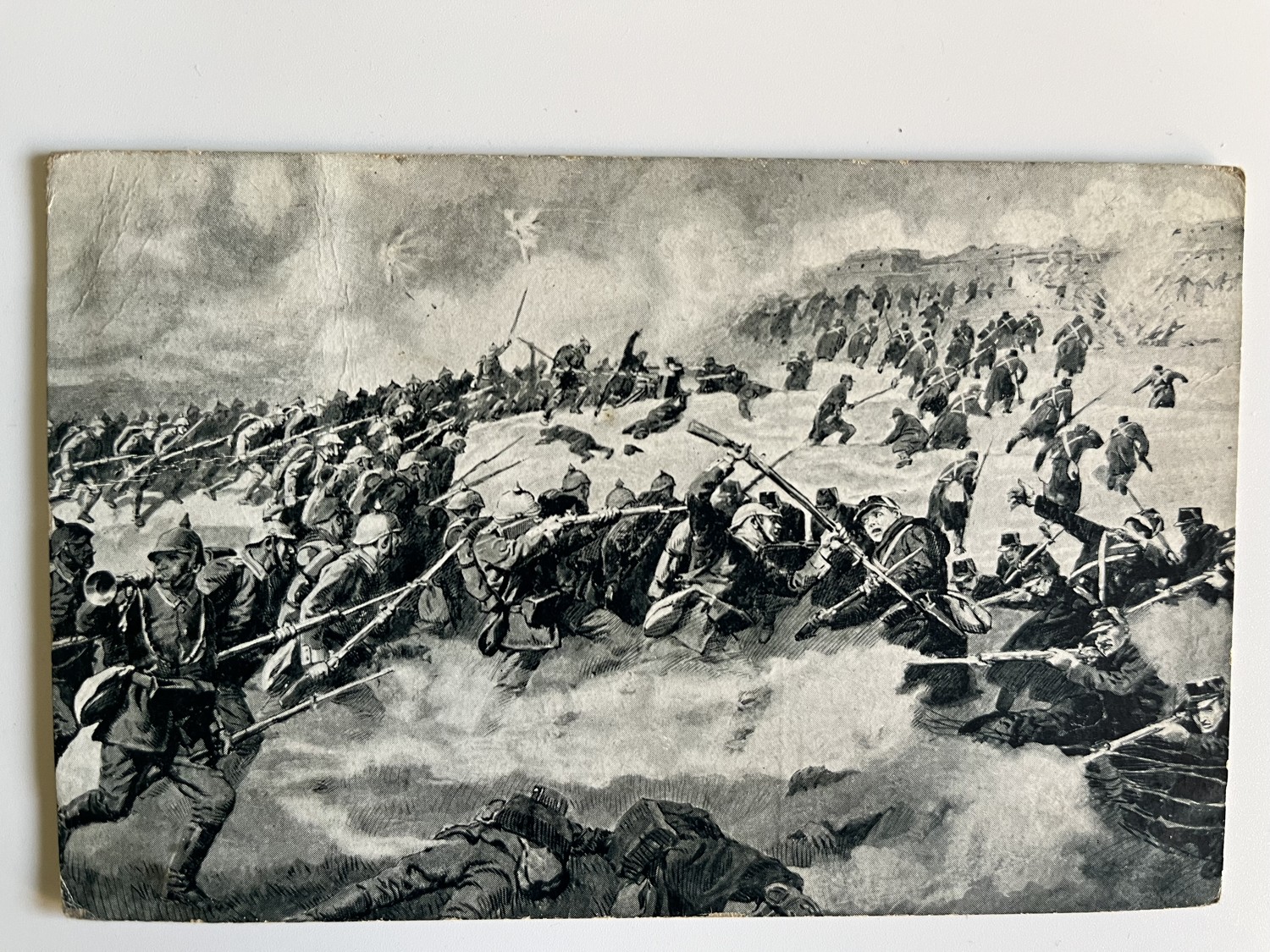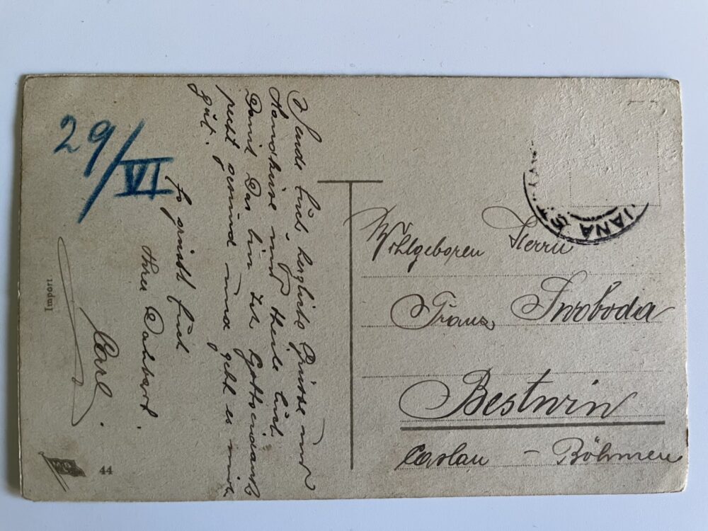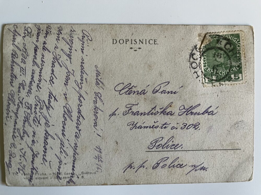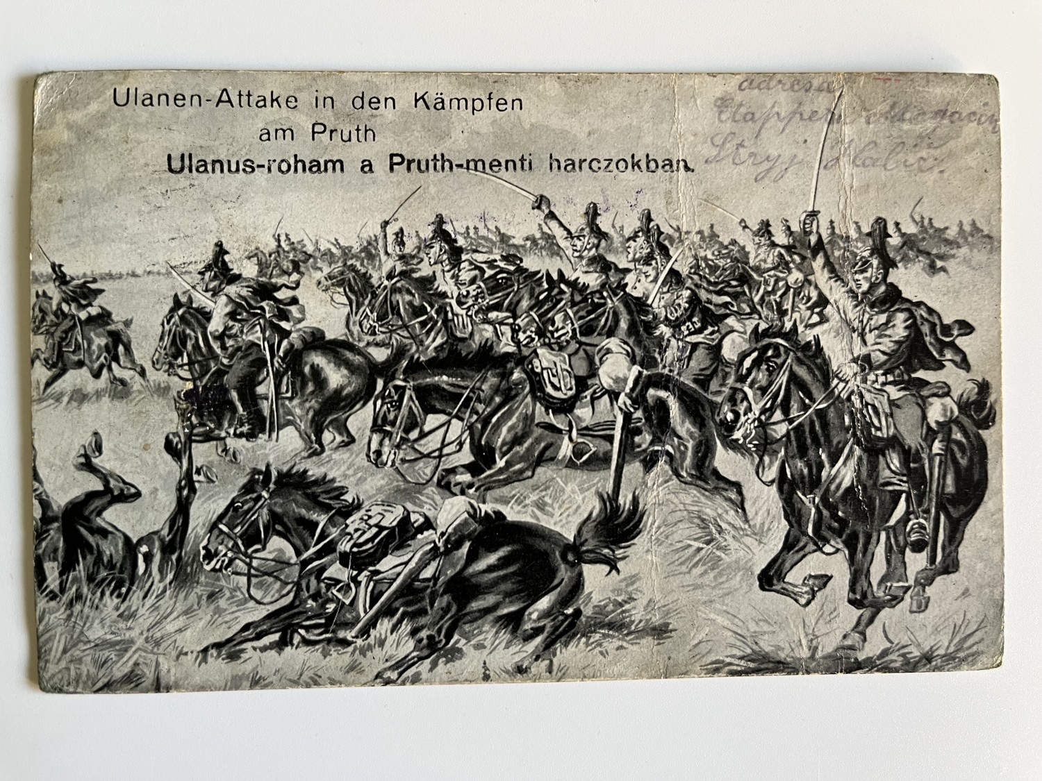 (hhm 6) MF 3 x pohlednice prošlá poštou. Adresát Police nad Metují, okres Náchod, 1915. Adresát obchod ve Zlaté Olešnici, p. Zlatá Olešnice okres Jablonec nad Nisou, 1915, razítko. 1 x Ruská jízda je zahnána zpět přes Vislu u Varšavy. 1 x Útok v bojích na Pruth.
