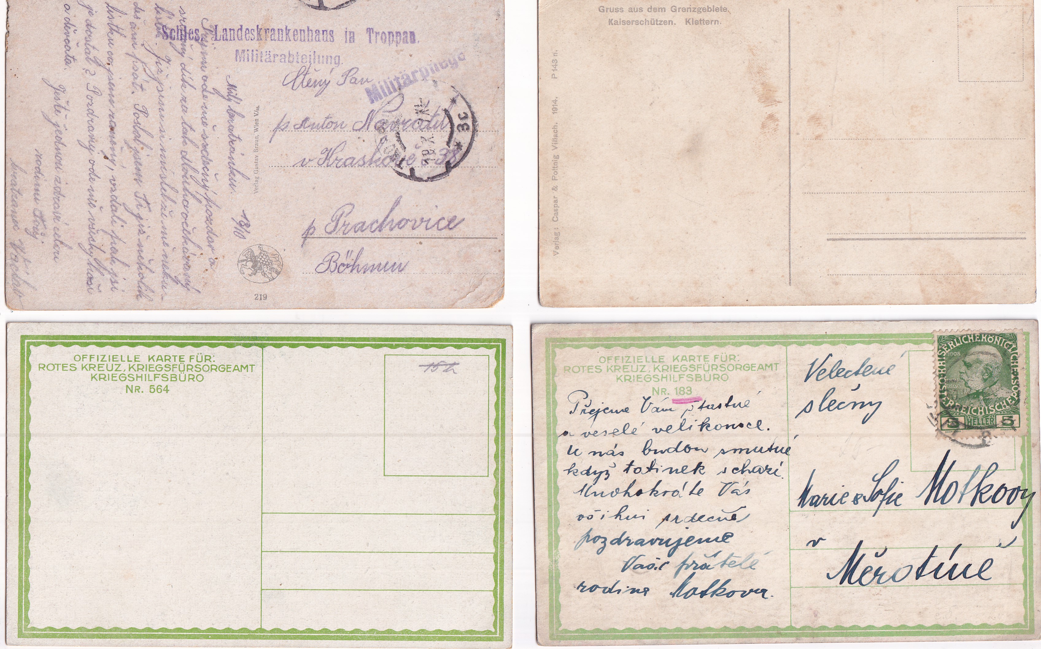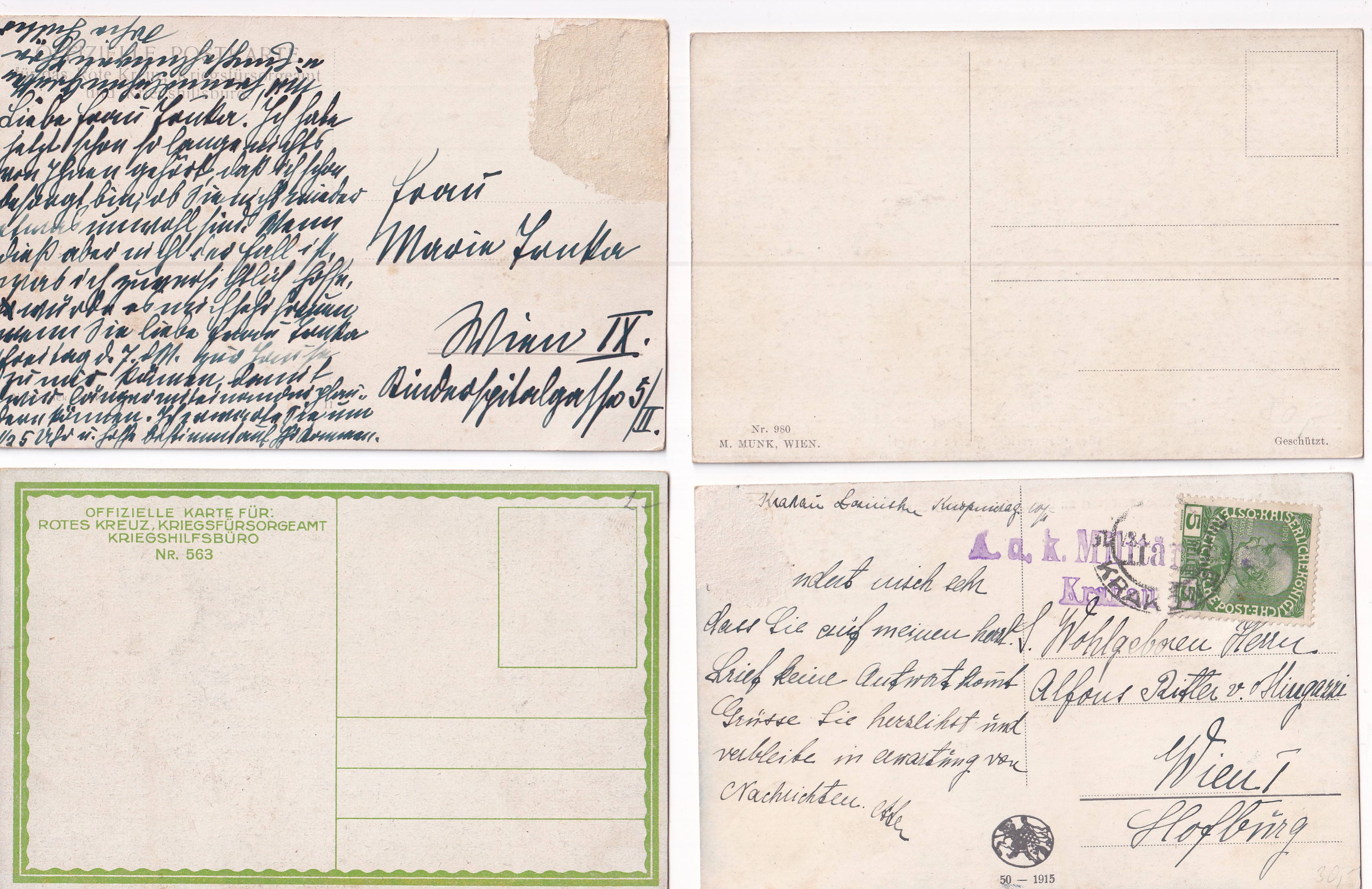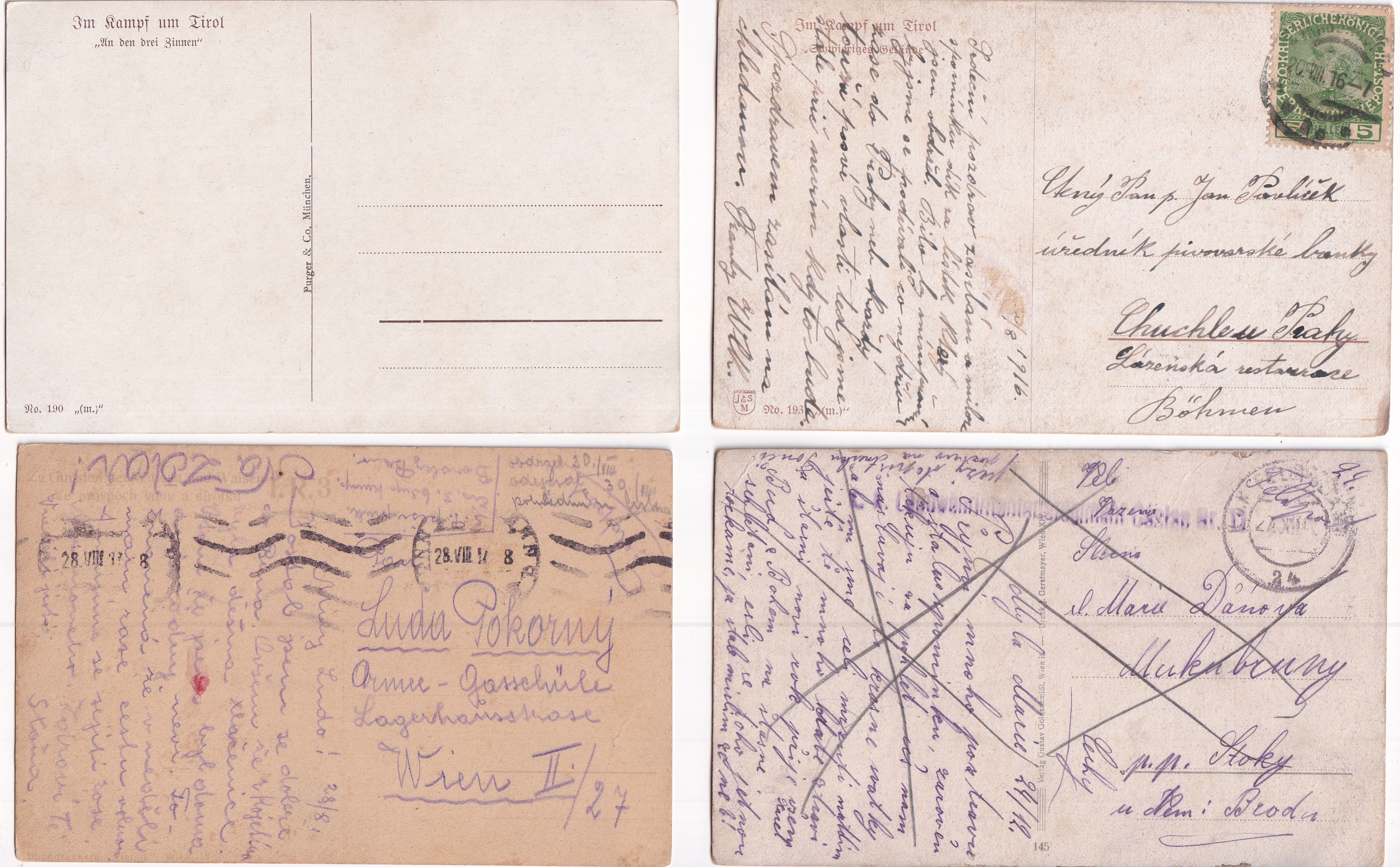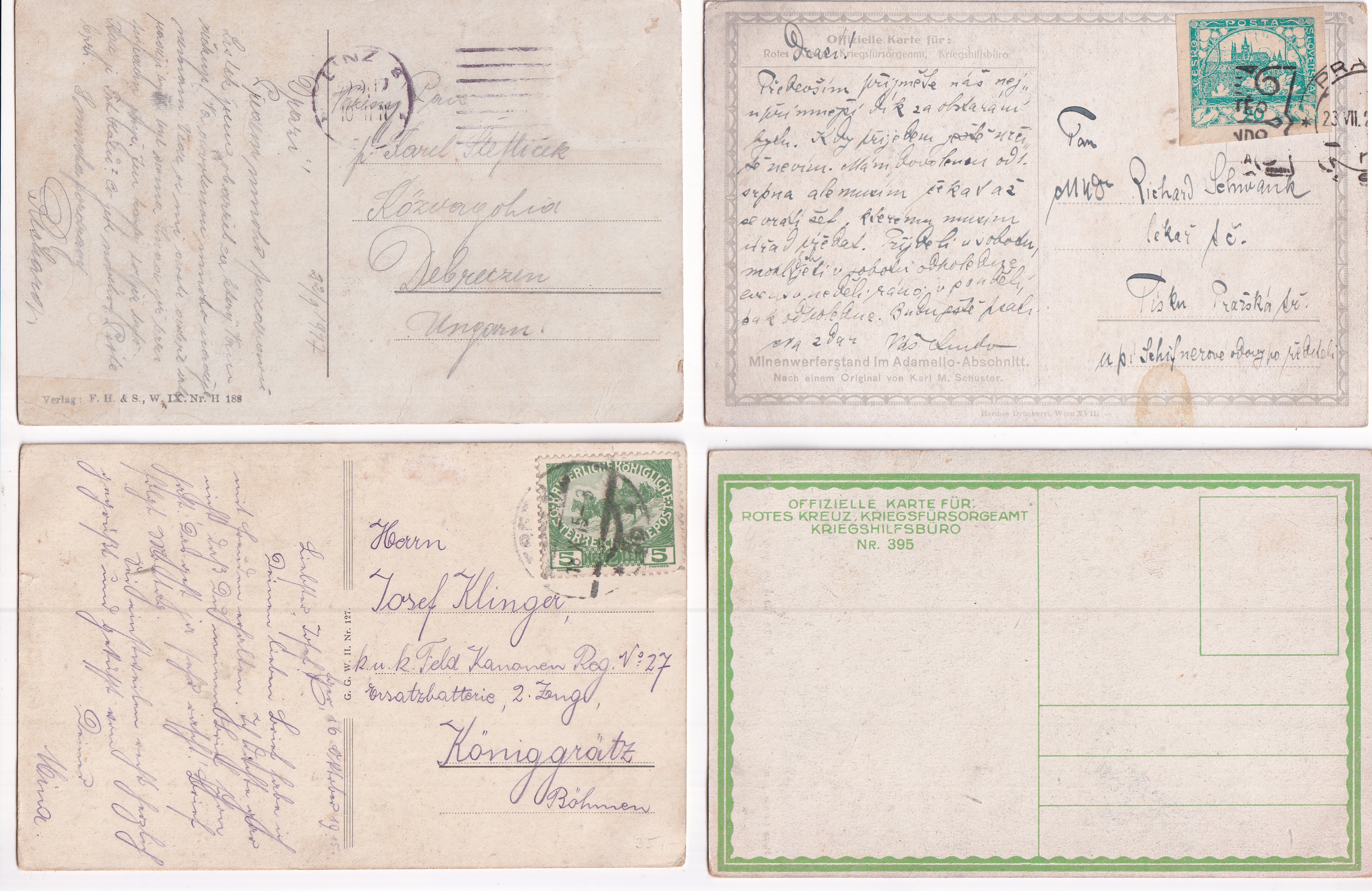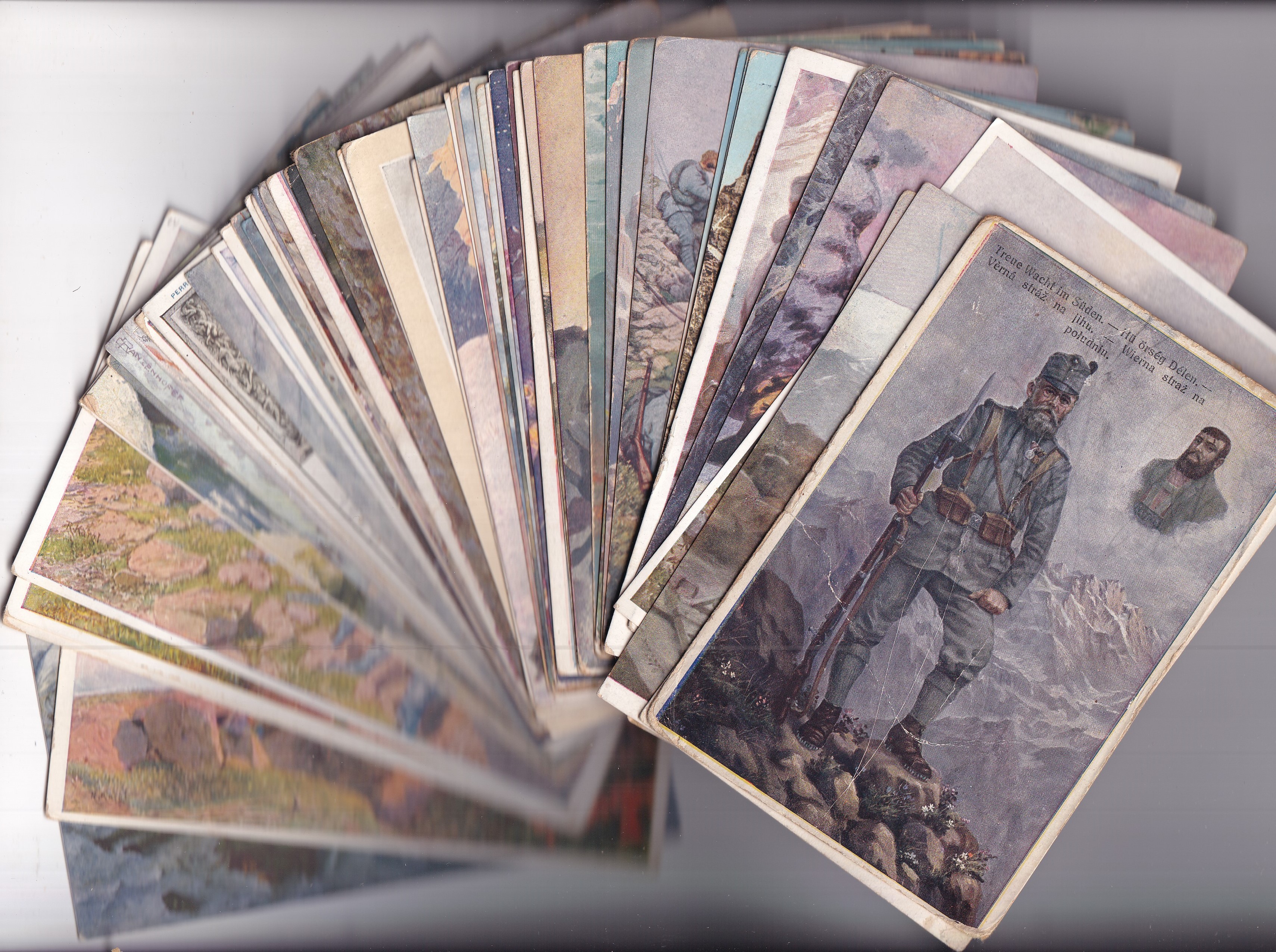12 (K3-5) MF Celek vojenských pohlednic obsahuje: oficiální dopisnice Červeného Kříže. WWI. Rakousko Uhersko. Lyžaře. Zákopy. Vojáci na frontě. Dolomity. Tyrolsko. Horolozci. Děla. Kulomety. Bitva ve vysokých horách. Horolezecký pěšák. Zbraně. Bajonety. Stráž na Soče. V boji o Tyrolsko. Hlídka, Albánské hory. Věrná stráž. Vojenská doprava v horách – koně. Odpočinek v Karpatech. Kulomet ve stěně Dolomit s výhledem. Alpská stráž. Prapor – Tyrolský červený orel. Na základně. Pronásledování Rusů v Karpatech. Polní tábor. Dělostřelectvo s Tofanou u Cortiny. Lyžařská hlídka s Cevedale. Přeprava zbraní a střeliva. Vojenská hlídka v horách (2800m). Tvrdá práce v Dolomitech. Na stráži. V Alpách. Na pozorovacím stanovišti. Dělostřelecká doprava na italských hranicích. Bouře zasněžených hor na italské frontě. Na hranicích 1914. Část pohlednic prošlá poštou, např. Adresát Gars am Kamp 1918. Adresát Hradec Králové 1919. Adresát říď.učitel v Jilmu, p. Chotěboř. Adresát v Pečkách 1911. Adresát strojvedoucí v Táboře 1916. Adresát obchod Police nad Metují. Adresát Trnovo 1912. Razítko Sopron,Maďarsko adresát Banská Štiavnica 1928. Adresát lékař Písek, Pražská tř. Adresát úředník pivovarské banky, Chuchle u Prahy, Lázeňská restaurace 1916. Adresát Kraskov, p.Prachovice. Adresát Měrotí, okr. Olomou. Razítko Trient, adresát České Budějovice 1915. Razítko Trient, adresát Reichenberg Liberec 1913. Některé pohlednice včetně razítek jednotek, vojáci píší dopisnice na adresy do čech a moravy. // Rakousko Uhersko,Červený Kříž,lyžaře, vojenské zákopy,Dolomity,Tyrolsko,horolozci,děla,kulomety,zbraně,bajonety //