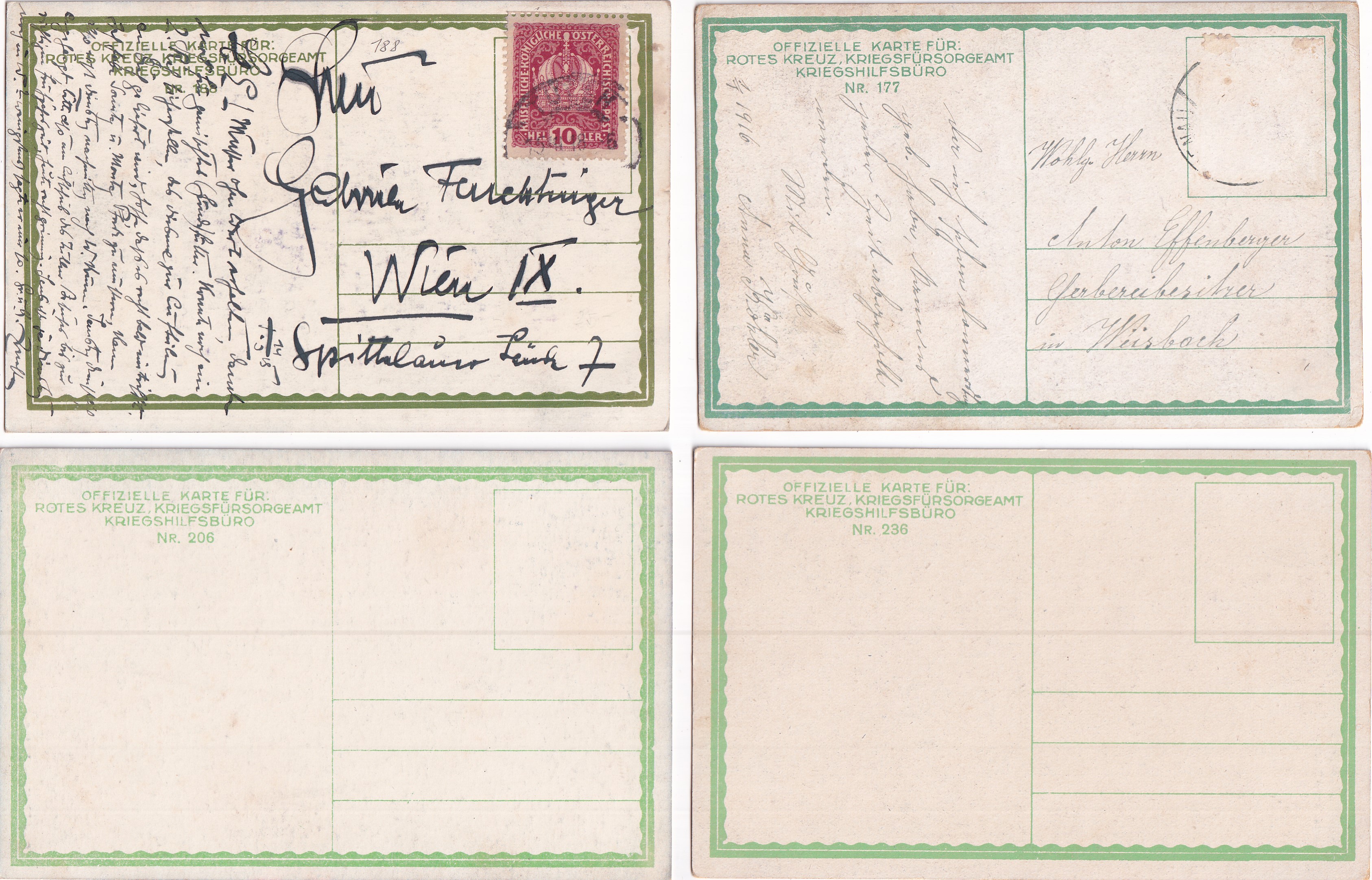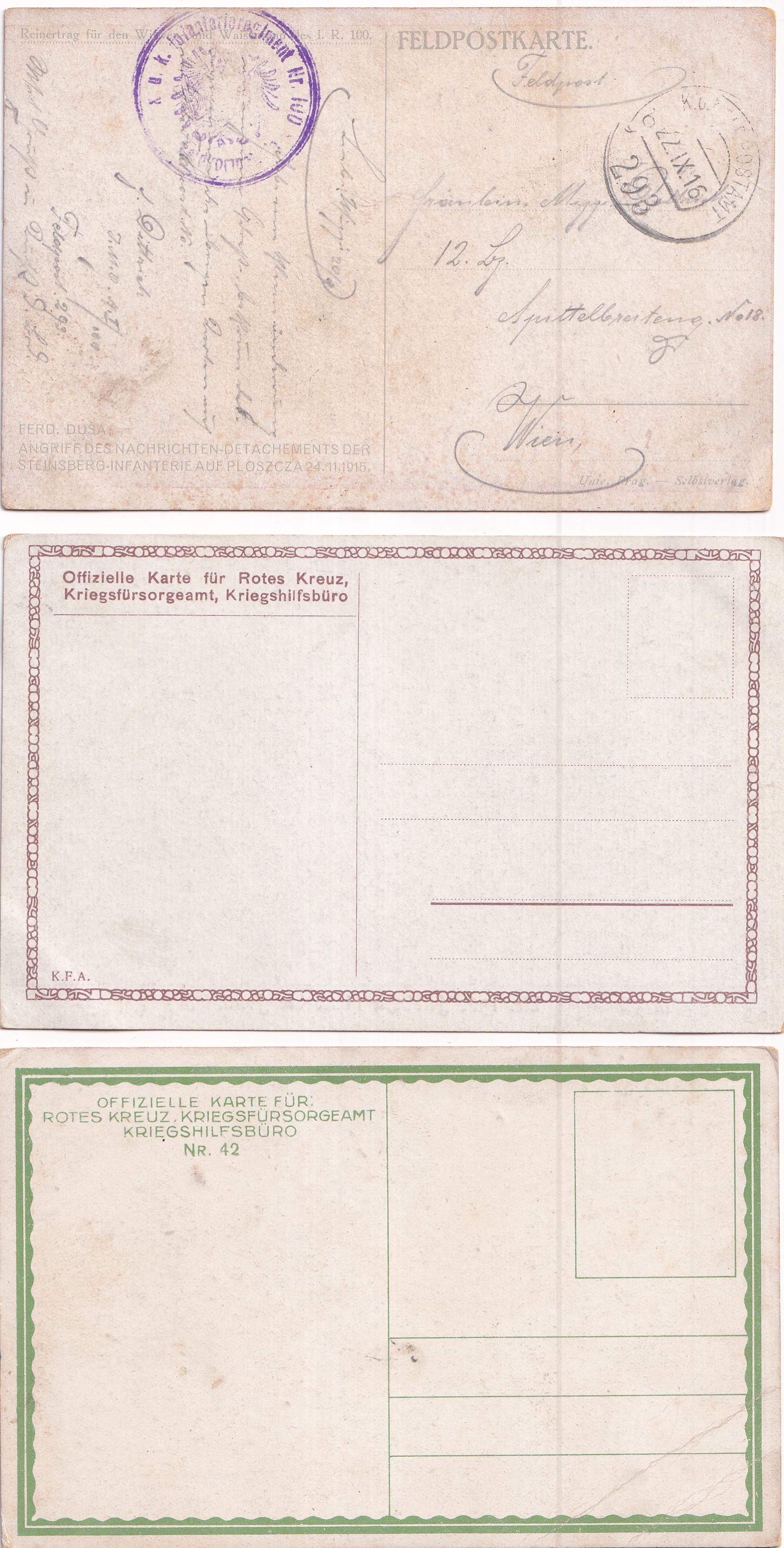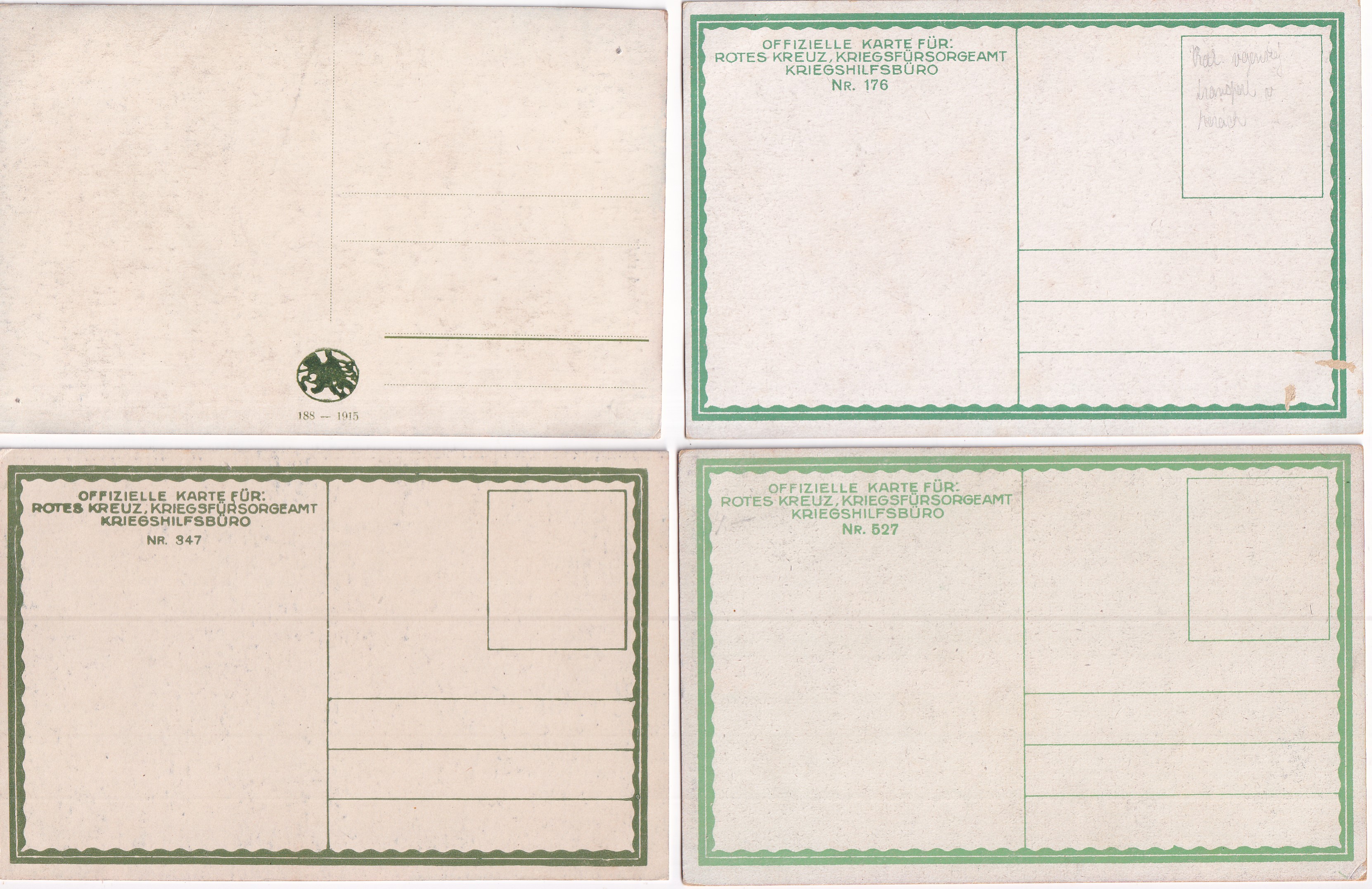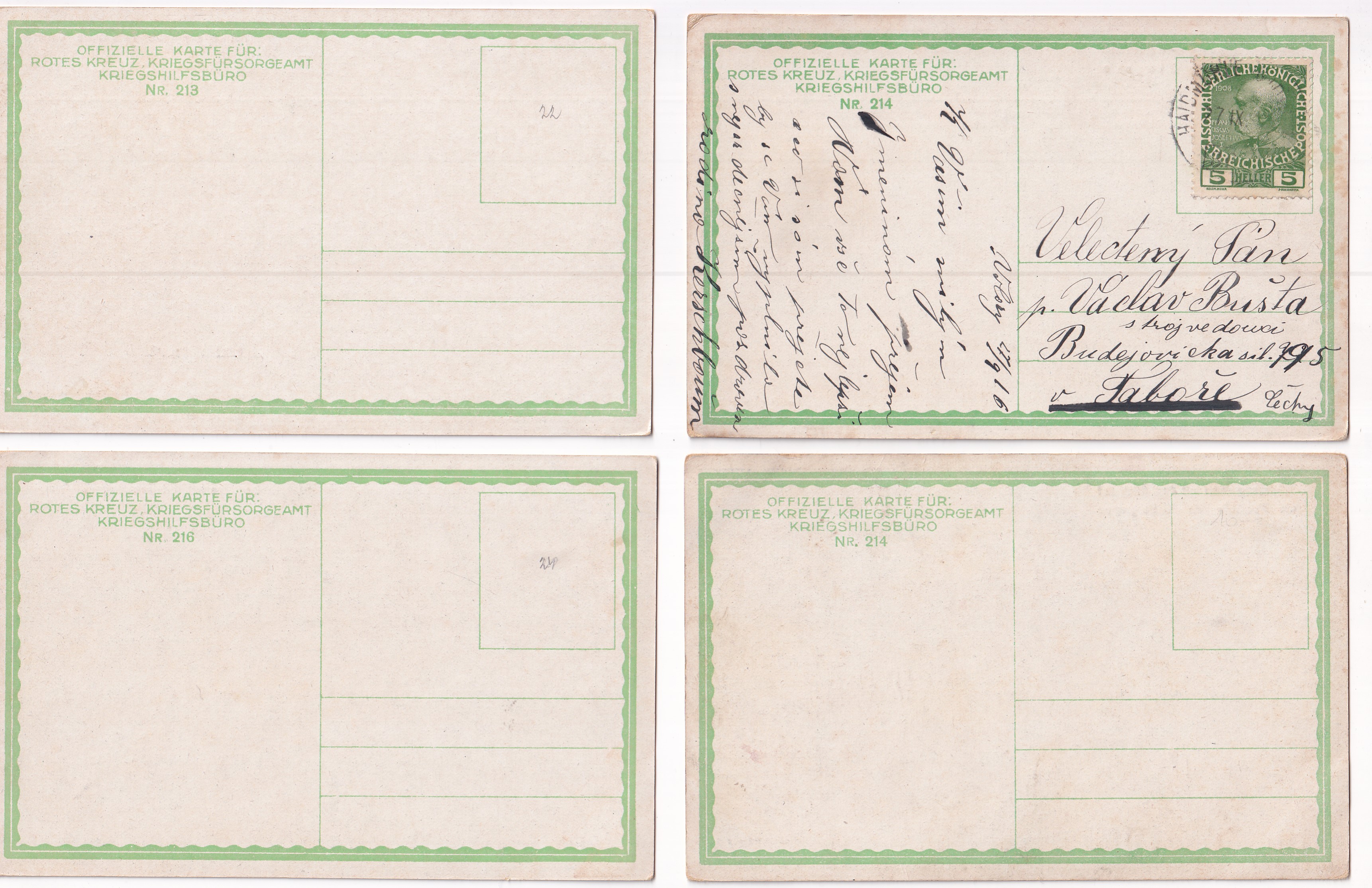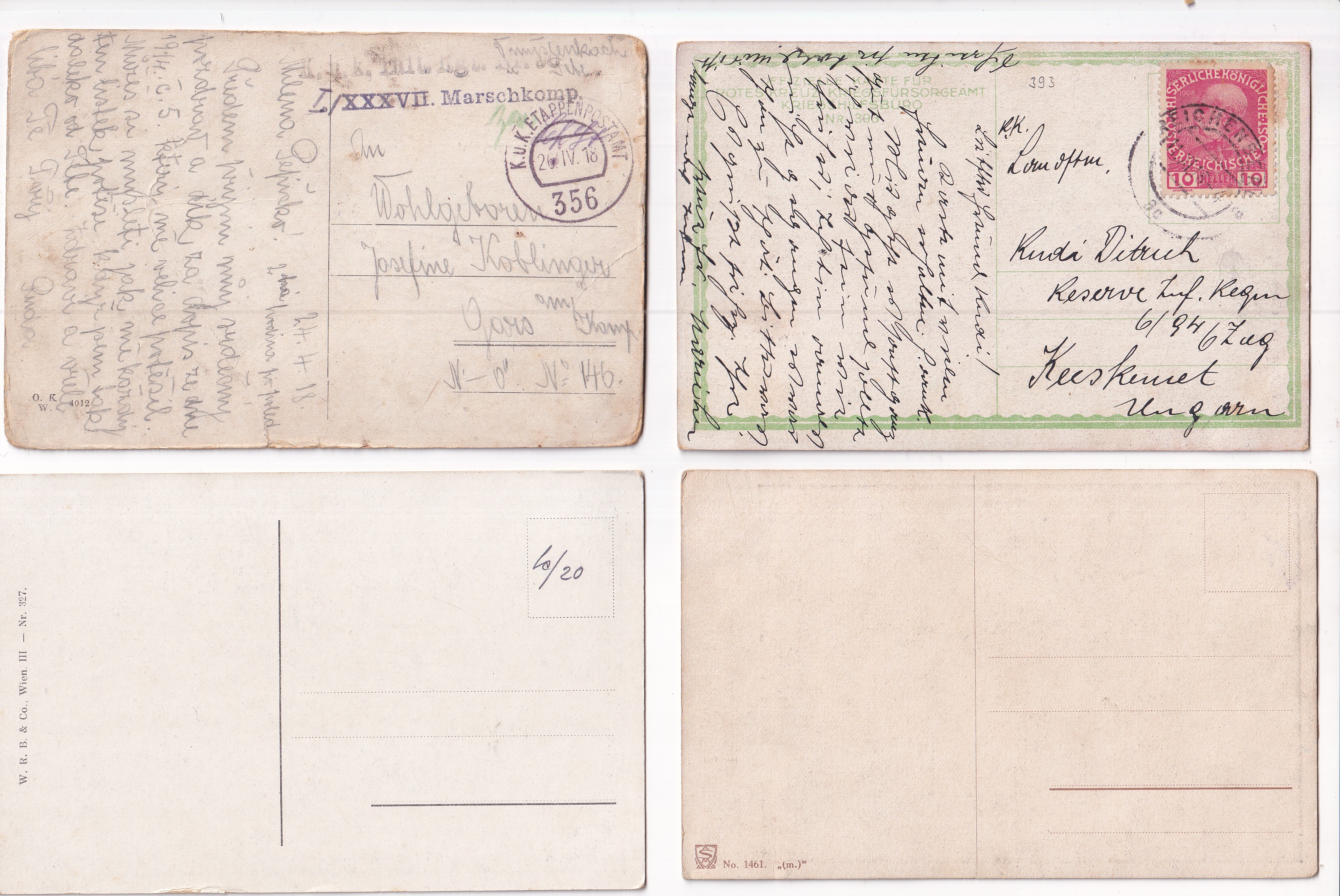 12 (K3-5) MF Celek vojenských pohlednic obsahuje: oficiální dopisnice Červeného Kříže. WWI. Rakousko Uhersko. Lyžaře. Zákopy. Vojáci na frontě. Dolomity. Tyrolsko. Horolozci. Děla. Kulomety. Bitva ve vysokých horách. Horolezecký pěšák. Zbraně. Bajonety. Stráž na Soče. V boji o Tyrolsko. Hlídka, Albánské hory. Věrná stráž. Vojenská doprava v horách – koně. Odpočinek v Karpatech. Kulomet ve stěně Dolomit s výhledem. Alpská stráž. Prapor – Tyrolský červený orel. Na základně. Pronásledování Rusů v Karpatech. Polní tábor. Dělostřelectvo s Tofanou u Cortiny. Lyžařská hlídka s Cevedale. Přeprava zbraní a střeliva. Vojenská hlídka v horách (2800m). Tvrdá práce v Dolomitech. Na stráži. V Alpách. Na pozorovacím stanovišti. Dělostřelecká doprava na italských hranicích. Bouře zasněžených hor na italské frontě. Na hranicích 1914. Část pohlednic prošlá poštou, např. Adresát Gars am Kamp 1918. Adresát Hradec Králové 1919. Adresát říď.učitel v Jilmu, p. Chotěboř. Adresát v Pečkách 1911. Adresát strojvedoucí v Táboře 1916. Adresát obchod Police nad Metují. Adresát Trnovo 1912. Razítko Sopron,Maďarsko adresát Banská Štiavnica 1928. Adresát lékař Písek, Pražská tř. Adresát úředník pivovarské banky, Chuchle u Prahy, Lázeňská restaurace 1916. Adresát Kraskov, p.Prachovice. Adresát Měrotí, okr. Olomou. Razítko Trient, adresát České Budějovice 1915. Razítko Trient, adresát Reichenberg Liberec 1913. Některé pohlednice včetně razítek jednotek, vojáci píší dopisnice na adresy do čech a moravy. // Rakousko Uhersko,Červený Kříž,lyžaře, vojenské zákopy,Dolomity,Tyrolsko,horolozci,děla,kulomety,zbraně,bajonety //