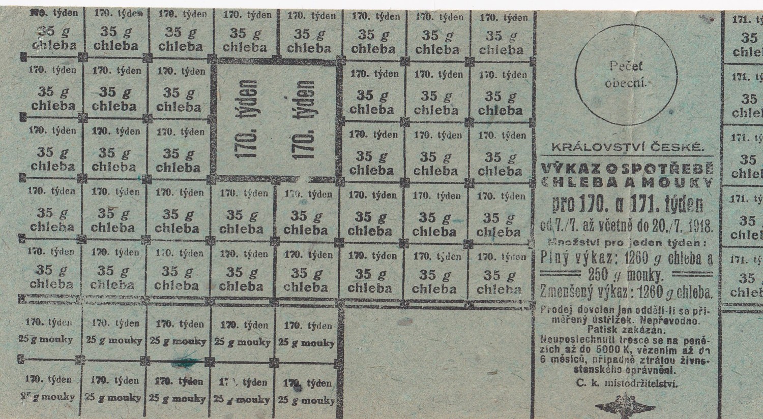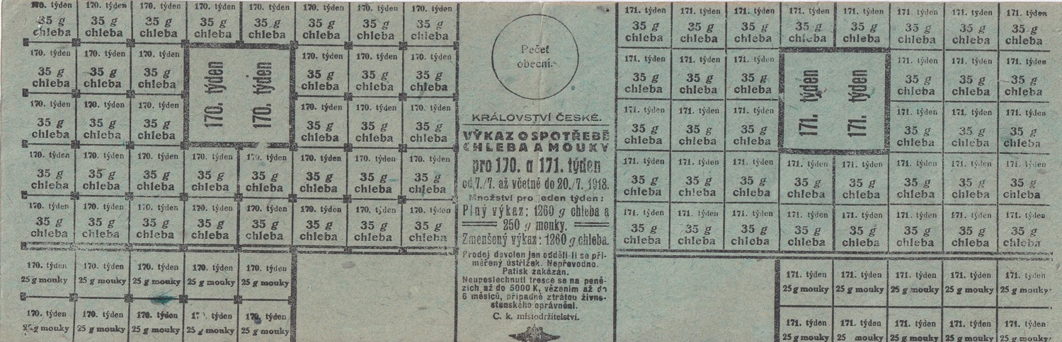 (hhj 50) Rozměr: 9 x 28 cm. Království české. Výkaz o spotřebě chleba a mouky pro 170. a 171. týden od 7.7 až včetně 20.7. 1918