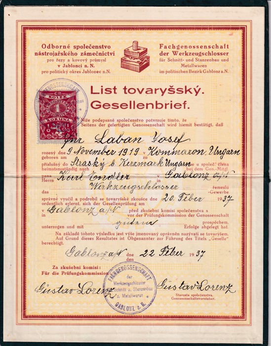 (26) Rozměr 11,5 x 17,5 cm Výuční list se zdobnou hlavičkou a kolkem – Odborné společenstvo nástrojařského zámečnictví pro řezy a kovový průmysl v Jablonci nad Nisou r.1937