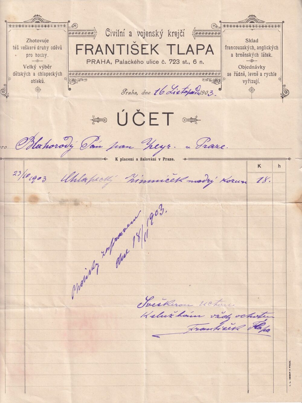 Účet Civilní a vojenský krejčí František Tlapa – chlapecký zimníček 1903