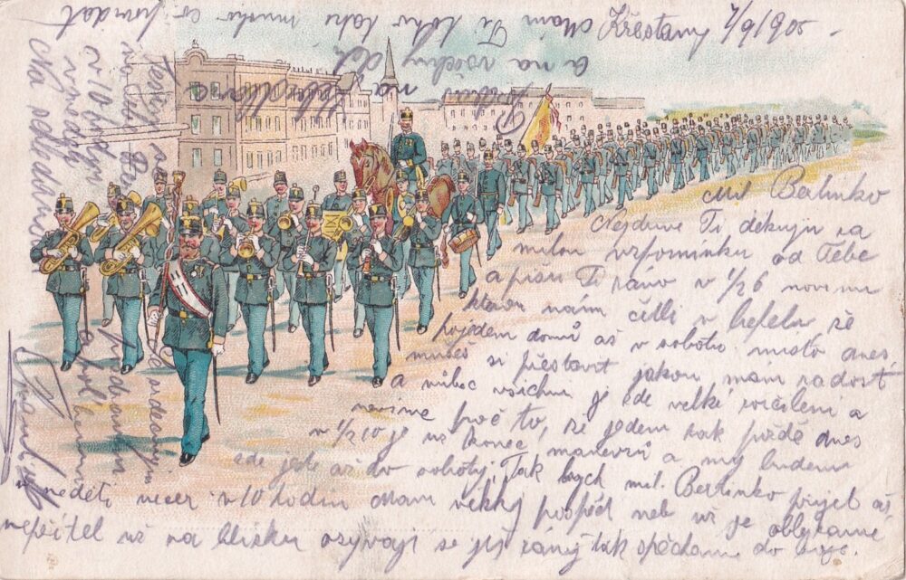 Pohlednice Vojsko RU – Hradní hudba pochoduje, Vídeň r. 1898