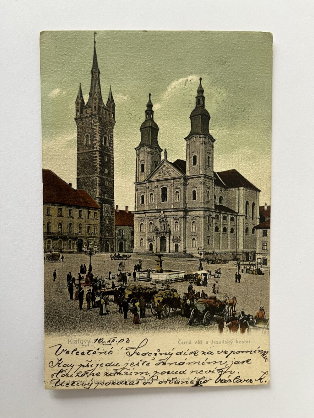 Pohlednice místopis Klatovy – Černá věž a Jezuitský kostel, 1903