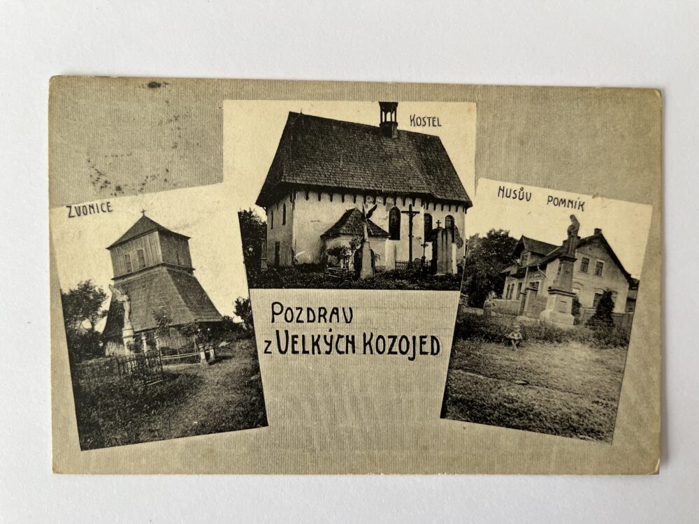 Pohlednice Velké Kozojedy – Zvonice, kostel, Husův pomník koláž
