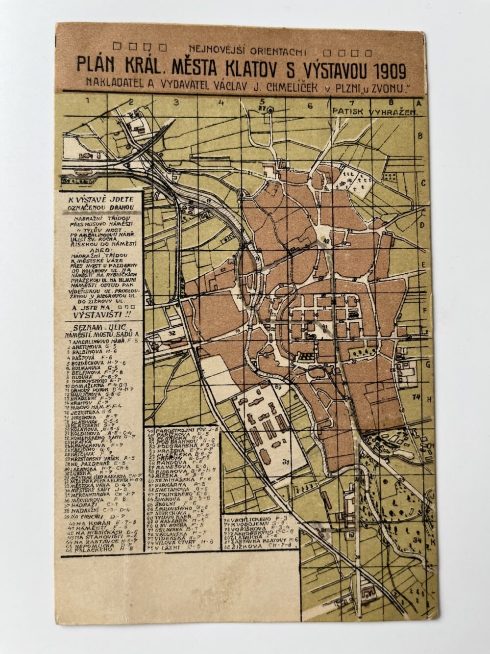 SoldPohlednice místopis Plán města Klatov s výstavou 1909, okres Klatovy