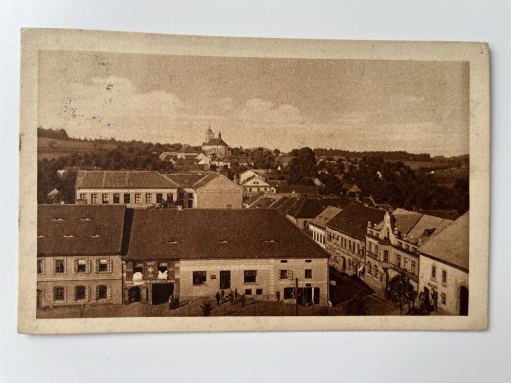 Pohlednice místopis Klatovy – náměstí, radnice, kostel r. 1918