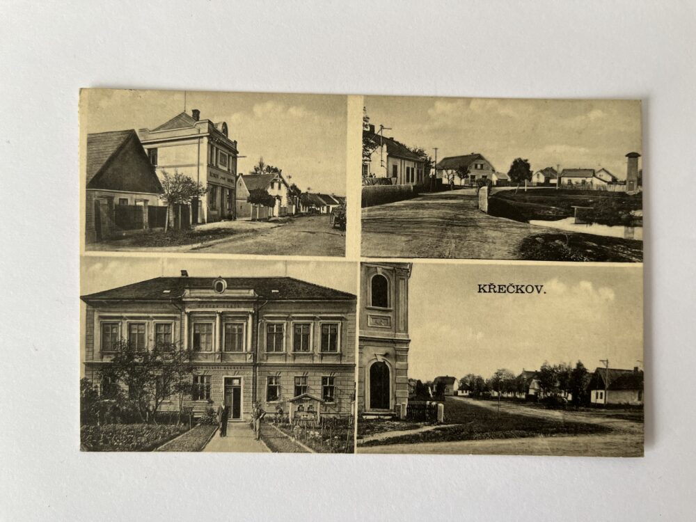 Pohlednice Rymice, koláž – Náves, škola, kostel okres Kroměříž RU